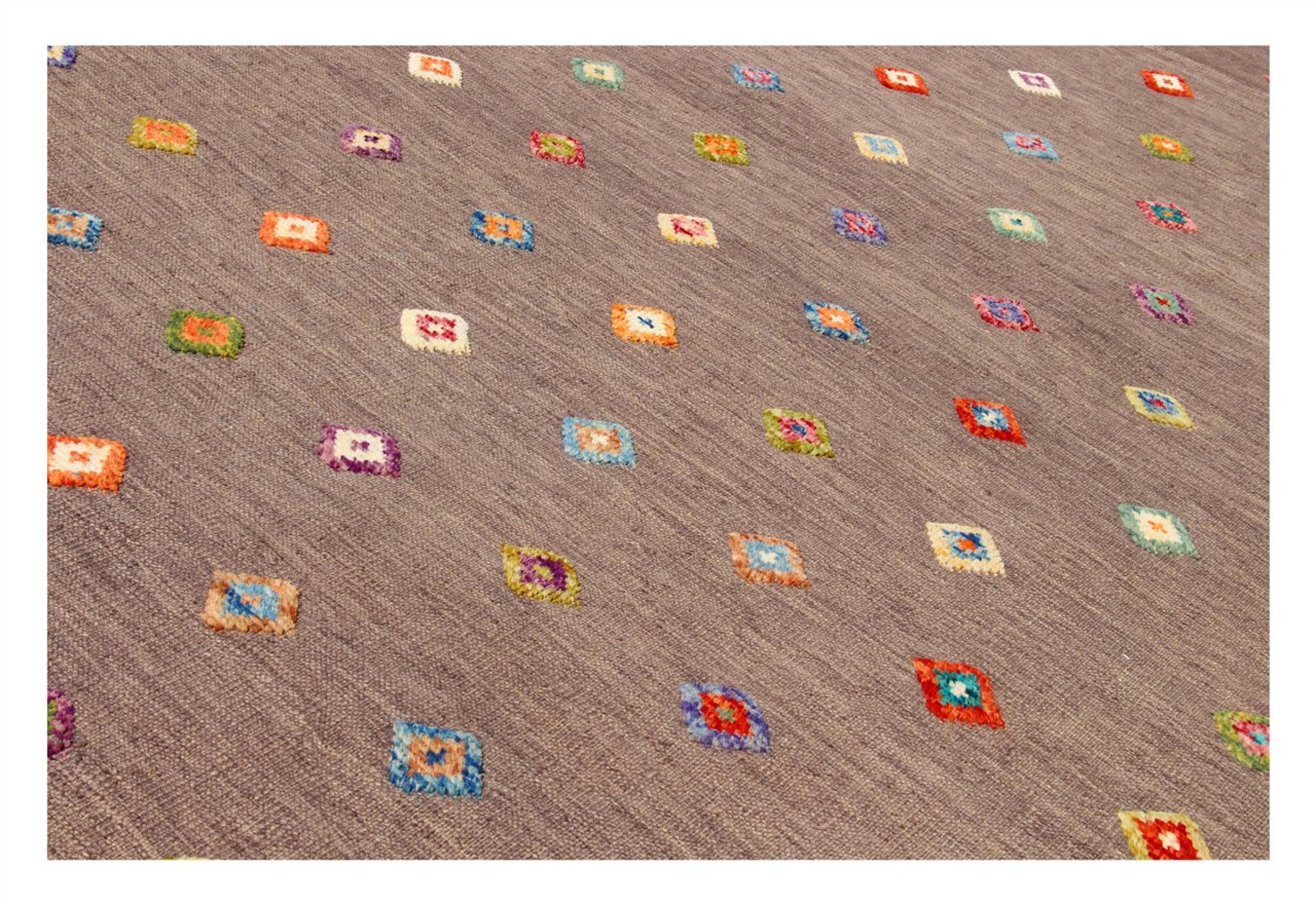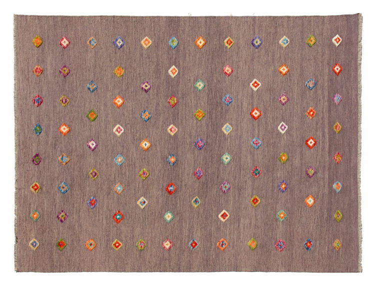 Esta alfombra fue hecha a mano en un telar como un tejido plano. Tejido plano es el término utilizado para describir las alfombras que no tienen pelo. Como el nombre promete, estas alfombras están tejidas y no anudadas. Esto resulta en una alfombra plana con una superficie estructurada. Los tejidos planos no son tan suaves y normalmente más delgados que las alfombras anudadas. Al mismo tiempo, su fabricación es mucho menos compleja y por lo general se pueden disponer por ambos lados (frontal y posterior). Sus patrones suelen ser geométricos, lo cual está determinado por el tejido.