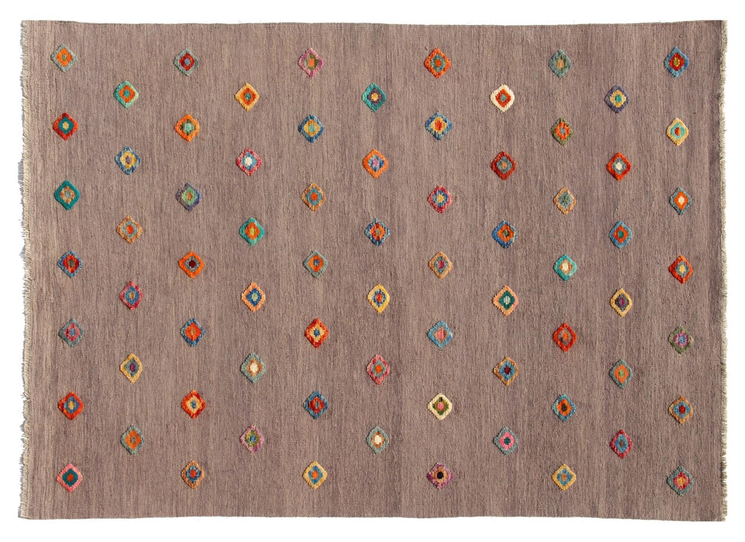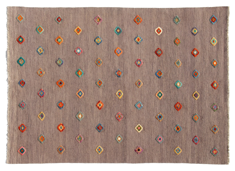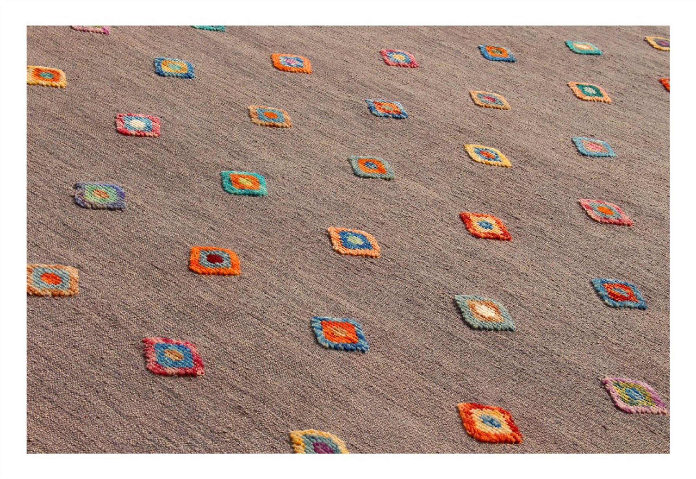 Esta alfombra fue hecha a mano en un telar como un tejido plano. Tejido plano es el término utilizado para describir las alfombras que no tienen pelo. Como el nombre promete, estas alfombras están tejidas y no anudadas. Esto resulta en una alfombra plana con una superficie estructurada. Los tejidos planos no son tan suaves y normalmente más delgados que las alfombras anudadas. Al mismo tiempo, su fabricación es mucho menos compleja y por lo general se pueden disponer por ambos lados (frontal y posterior). Sus patrones suelen ser geométricos, lo cual está determinado por el tejido.
