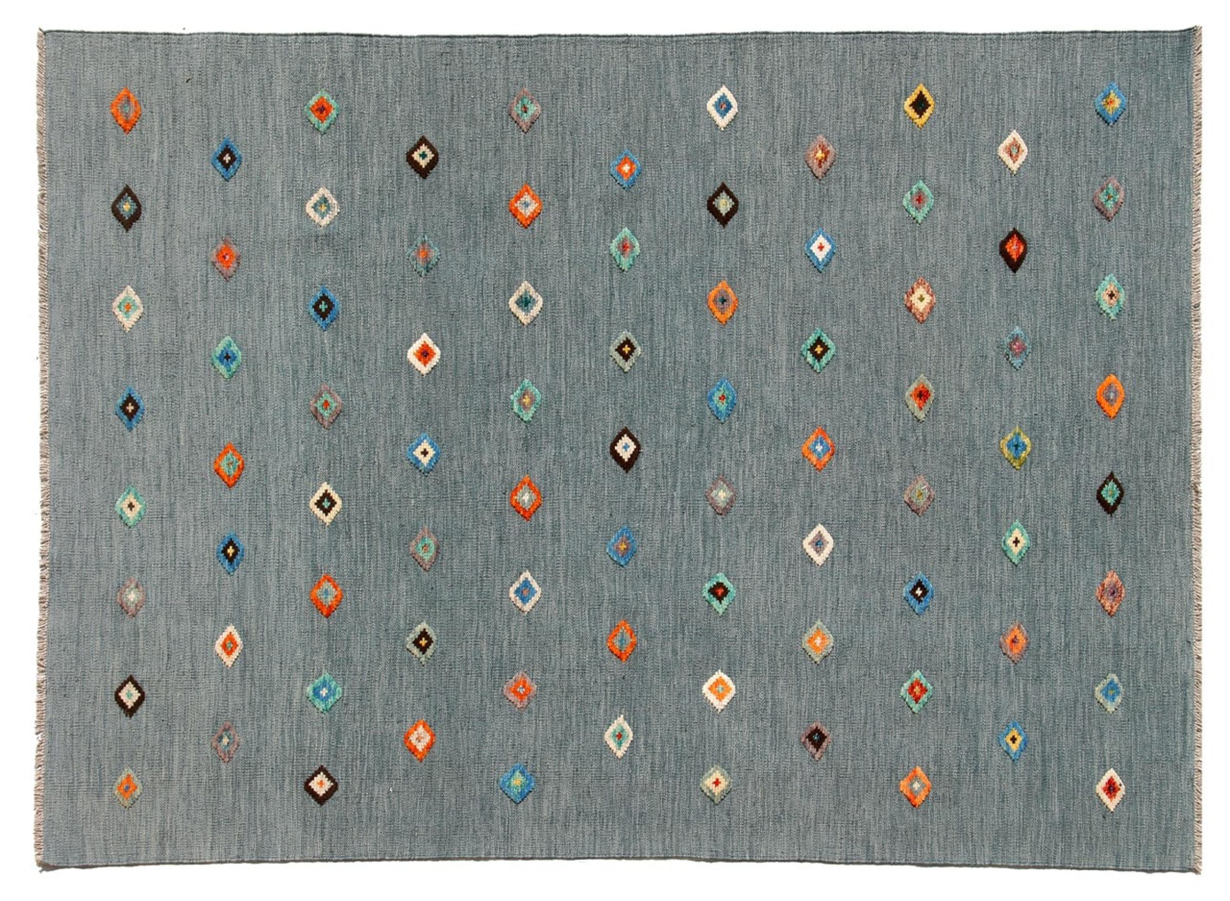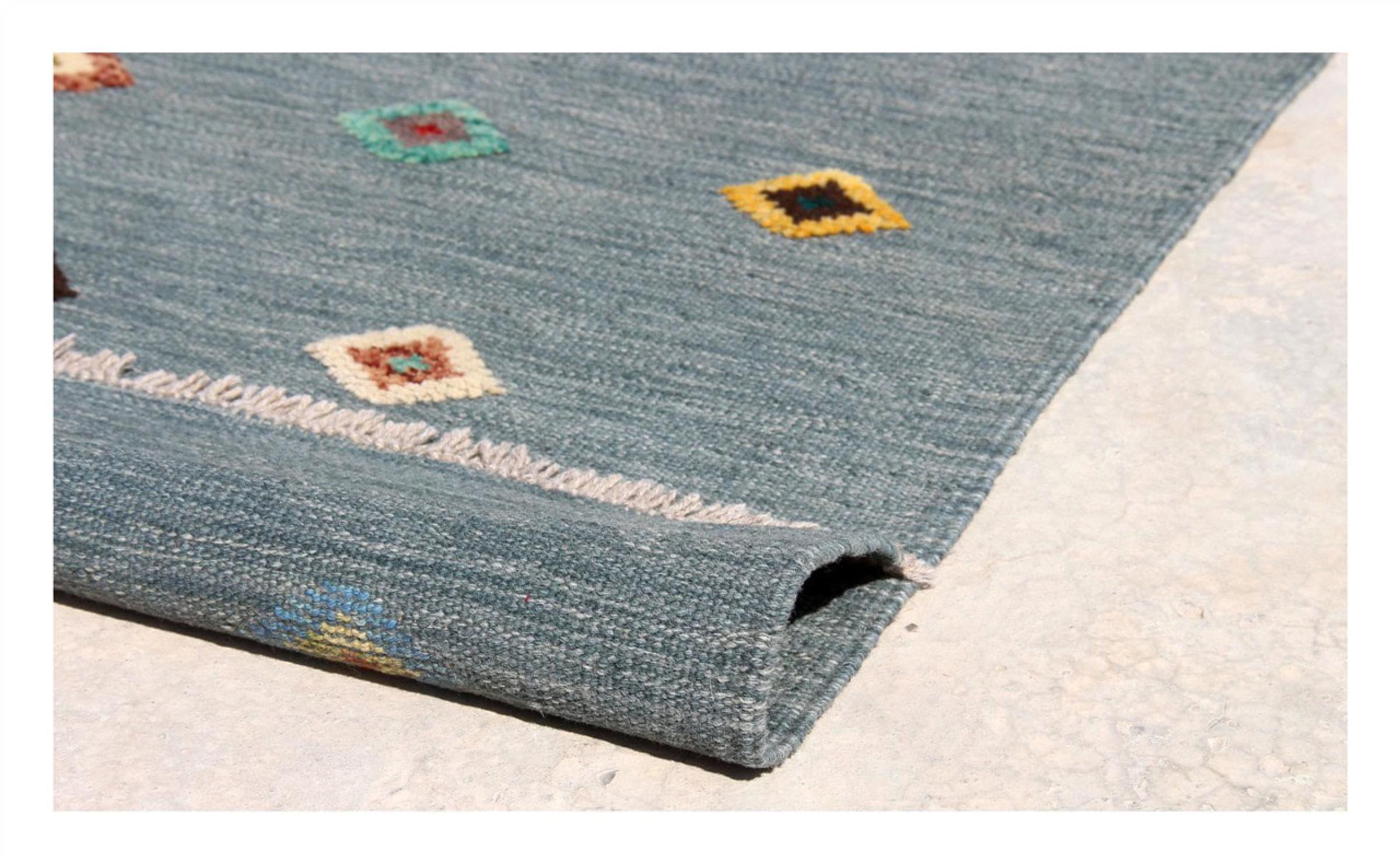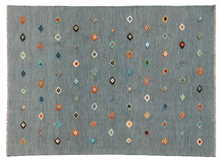 Esta alfombra fue hecha a mano en un telar como un tejido plano. Tejido plano es el término utilizado para describir las alfombras que no tienen pelo. Como el nombre promete, estas alfombras están tejidas y no anudadas. Esto resulta en una alfombra plana con una superficie estructurada. Los tejidos planos no son tan suaves y normalmente más delgados que las alfombras anudadas. Al mismo tiempo, su fabricación es mucho menos compleja y por lo general se pueden disponer por ambos lados (frontal y posterior). Sus patrones suelen ser geométricos, lo cual está determinado por el tejido.