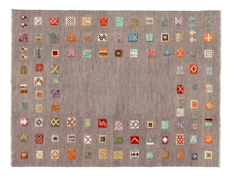 Esta alfombra fue hecha a mano en un telar como un tejido plano. Tejido plano es el término utilizado para describir las alfombras que no tienen pelo. Como el nombre promete, estas alfombras están tejidas y no anudadas. Esto resulta en una alfombra plana con una superficie estructurada. Los tejidos planos no son tan suaves y normalmente más delgados que las alfombras anudadas. Al mismo tiempo, su fabricación es mucho menos compleja y por lo general se pueden disponer por ambos lados (frontal y posterior). Sus patrones suelen ser geométricos, lo cual está determinado por el tejido.