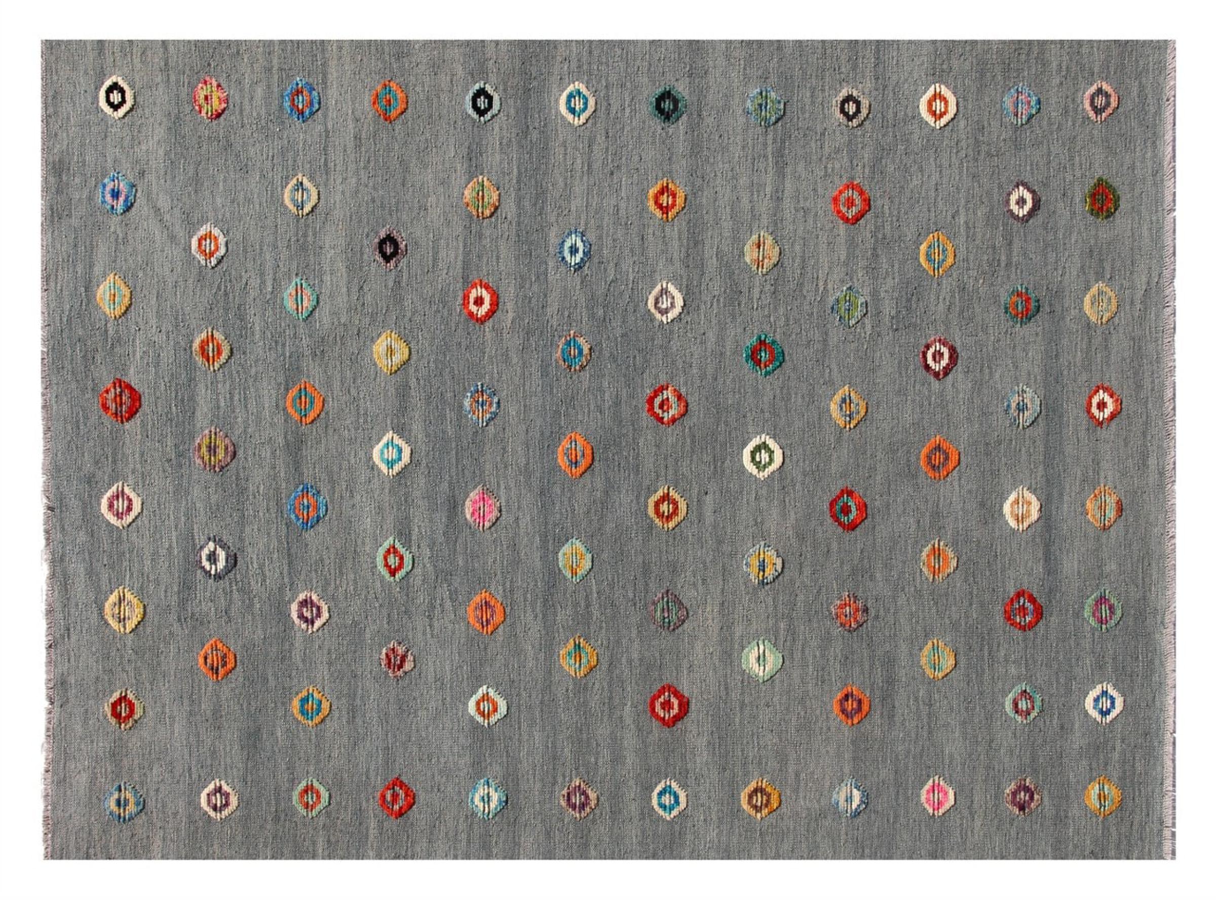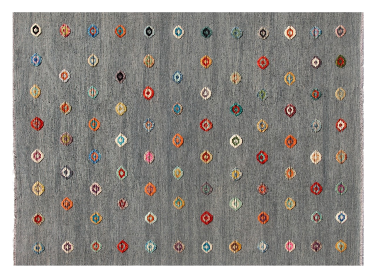 Esta alfombra fue hecha a mano en un telar como un tejido plano. Tejido plano es el término utilizado para describir las alfombras que no tienen pelo. Como el nombre promete, estas alfombras están tejidas y no anudadas. Esto resulta en una alfombra plana con una superficie estructurada. Los tejidos planos no son tan suaves y normalmente más delgados que las alfombras anudadas. Al mismo tiempo, su fabricación es mucho menos compleja y por lo general se pueden disponer por ambos lados (frontal y posterior). Sus patrones suelen ser geométricos, lo cual está determinado por el tejido.