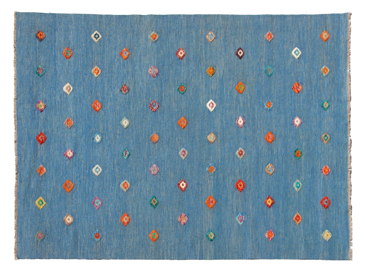 Esta alfombra fue hecha a mano en un telar como un tejido plano. Tejido plano es el término utilizado para describir las alfombras que no tienen pelo. Como el nombre promete, estas alfombras están tejidas y no anudadas. Esto resulta en una alfombra plana con una superficie estructurada. Los tejidos planos no son tan suaves y normalmente más delgados que las alfombras anudadas. Al mismo tiempo, su fabricación es mucho menos compleja y por lo general se pueden disponer por ambos lados (frontal y posterior). Sus patrones suelen ser geométricos, lo cual está determinado por el tejido.