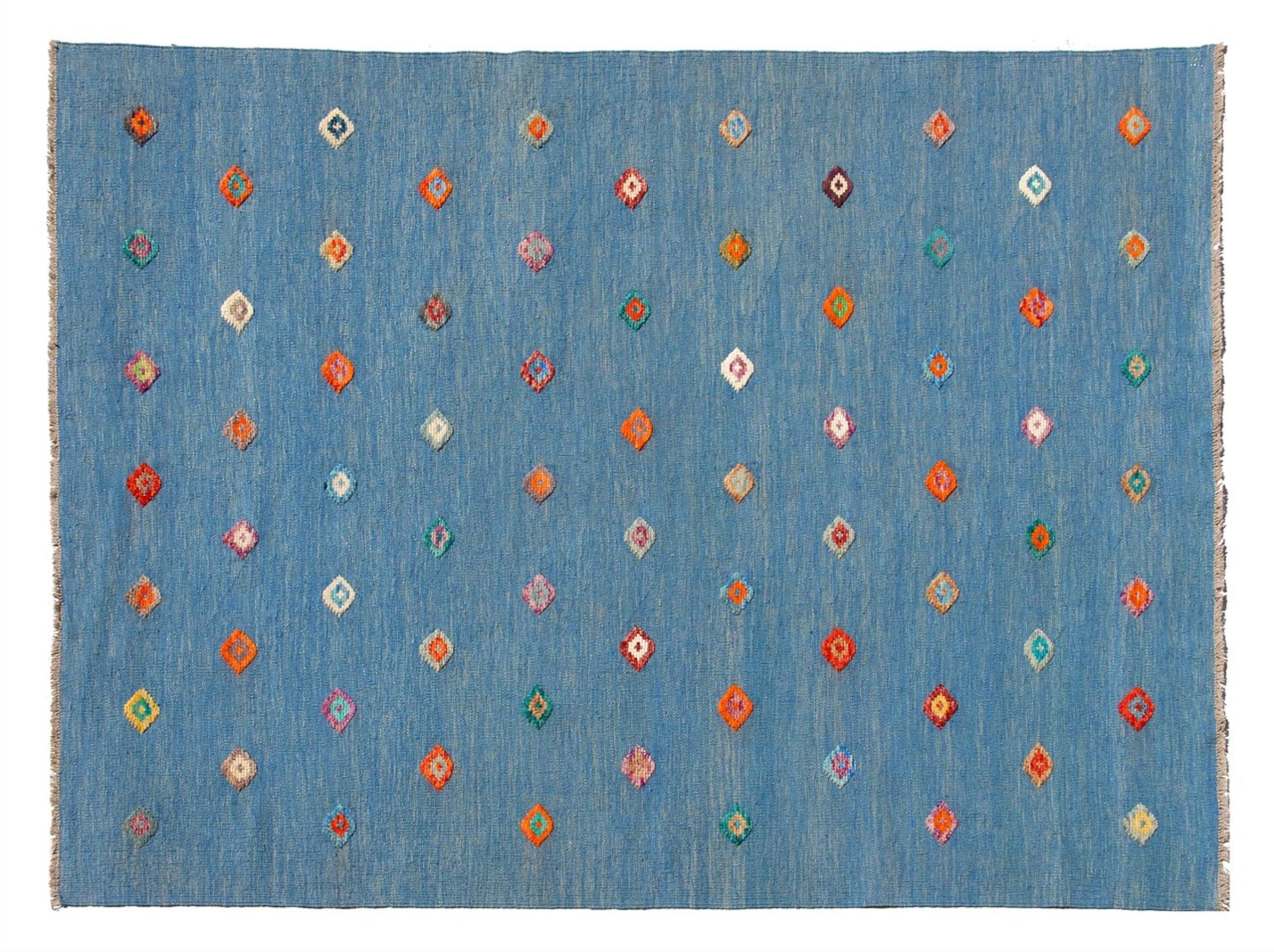 Estas alfombras kilim muestran una diferencia decisiva con las alfombras anudadas a mano - son tejidas a mano. Por lo tanto, no tienen un montón alto de lana y son a menudo más planos y más ásperos que las alfombras de lana anudada. Su fabricación es menos elaborada y por eso suelen ser mucho más baratas. Como ventaja, las alfombras de kilim son también mucho más ligeras y pueden ser colocadas por delante y por detrás. Los kilims tejidos a mano provienen originalmente de la antigua Persia y ahora también se fabrican a menudo en el Afganistán. Tienen patrones bastante simples y directos, que se deben a su técnica de tejido.