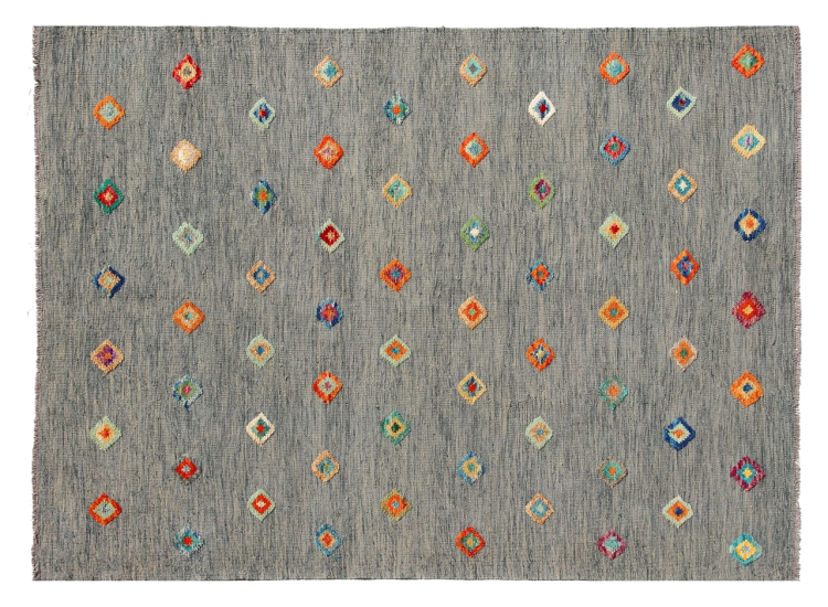 Esta alfombra fue hecha a mano en un telar como un tejido plano. Tejido plano es el término utilizado para describir las alfombras que no tienen pelo. Como el nombre promete, estas alfombras están tejidas y no anudadas. Esto resulta en una alfombra plana con una superficie estructurada. Los tejidos planos no son tan suaves y normalmente más delgados que las alfombras anudadas. Al mismo tiempo, su fabricación es mucho menos compleja y por lo general se pueden disponer por ambos lados (frontal y posterior). Sus patrones suelen ser geométricos, lo cual está determinado por el tejido.