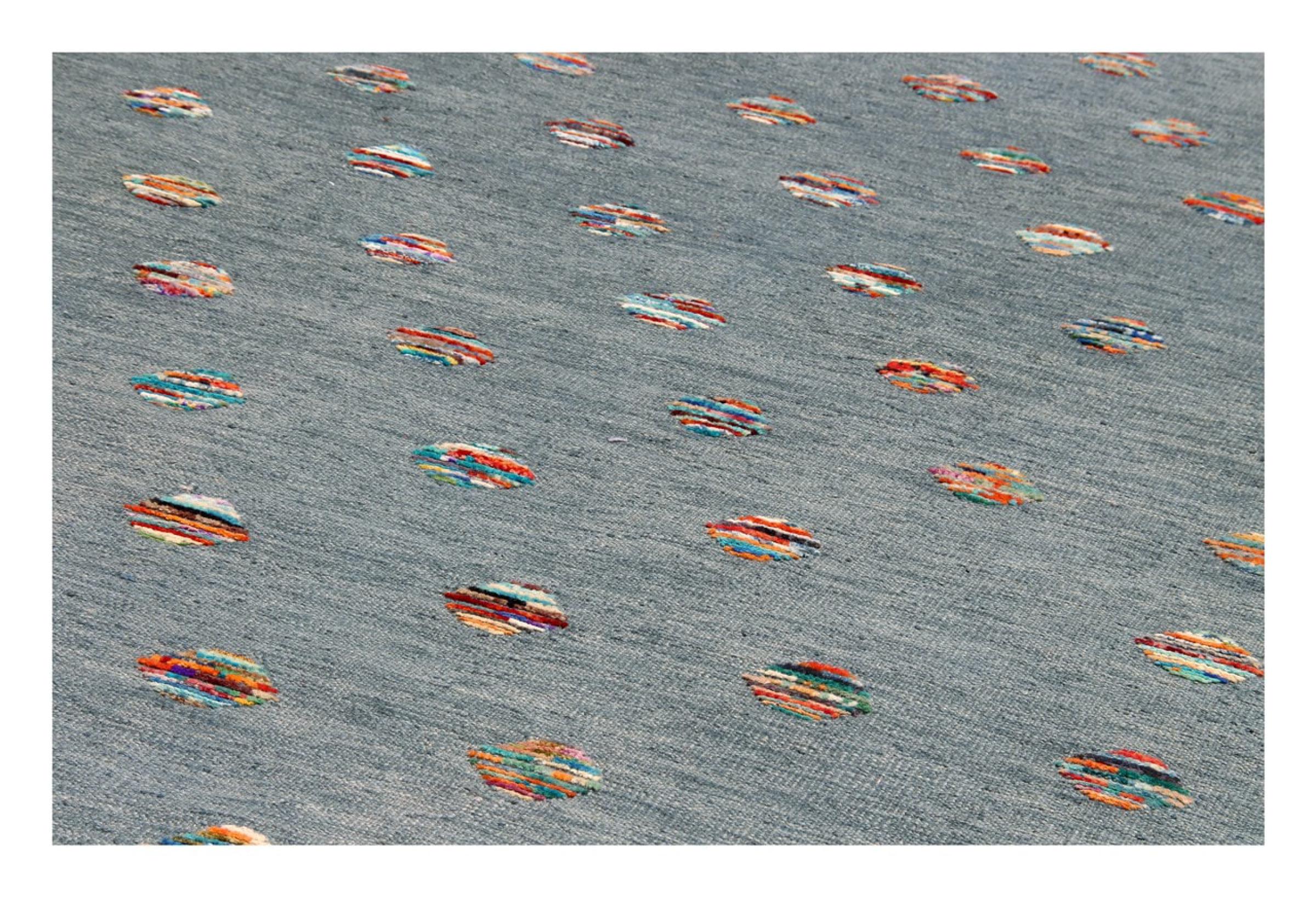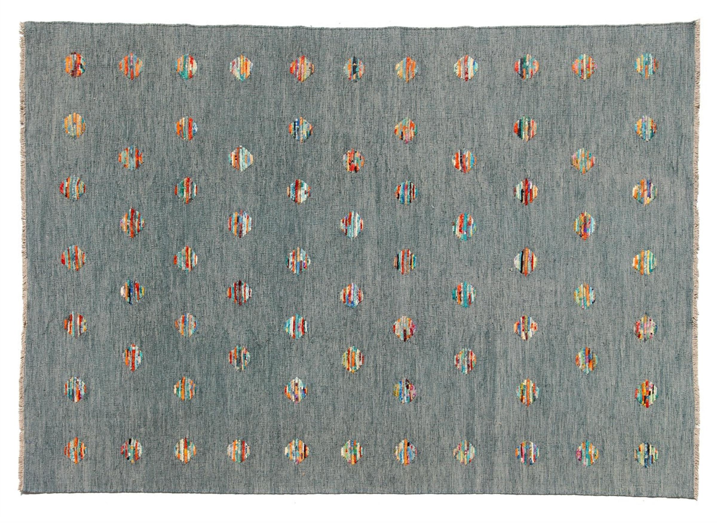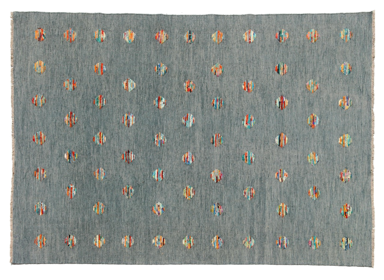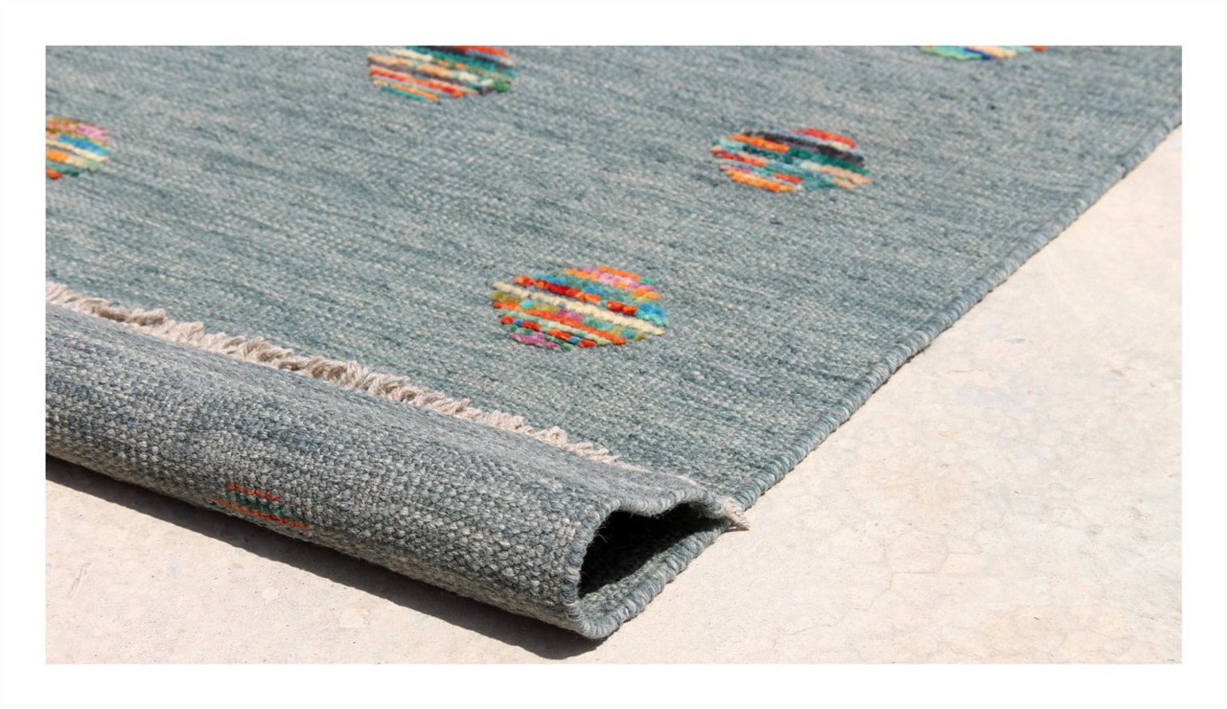 Esta alfombra fue hecha a mano en un telar como un tejido plano. Tejido plano es el término utilizado para describir las alfombras que no tienen pelo. Como el nombre promete, estas alfombras están tejidas y no anudadas. Esto resulta en una alfombra plana con una superficie estructurada. Los tejidos planos no son tan suaves y normalmente más delgados que las alfombras anudadas. Al mismo tiempo, su fabricación es mucho menos compleja y por lo general se pueden disponer por ambos lados (frontal y posterior). Sus patrones suelen ser geométricos, lo cual está determinado por el tejido.