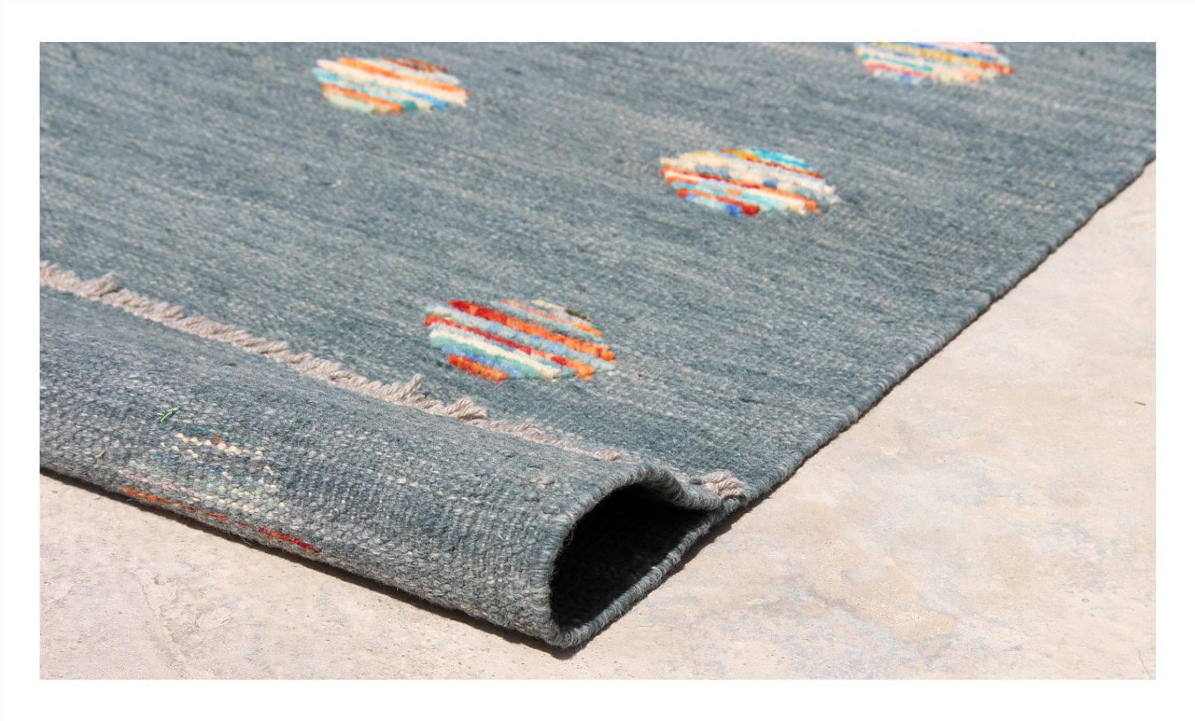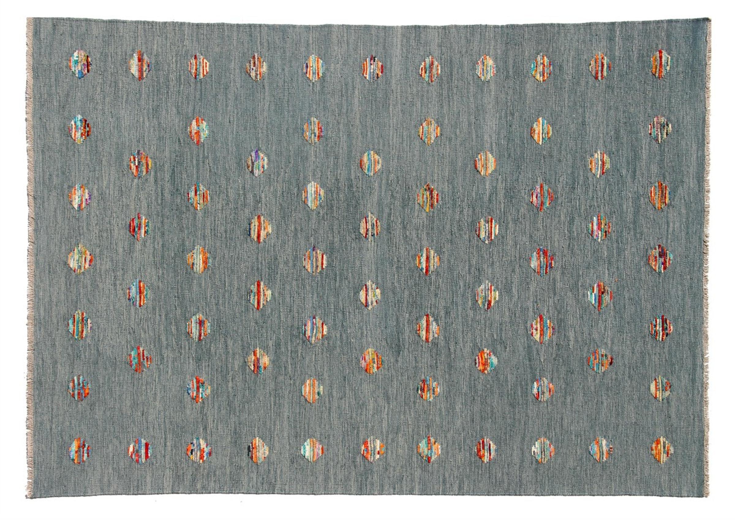 Esta alfombra fue hecha a mano en un telar como un tejido plano. Tejido plano es el término utilizado para describir las alfombras que no tienen pelo. Como el nombre promete, estas alfombras están tejidas y no anudadas. Esto resulta en una alfombra plana con una superficie estructurada. Los tejidos planos no son tan suaves y normalmente más delgados que las alfombras anudadas. Al mismo tiempo, su fabricación es mucho menos compleja y por lo general se pueden disponer por ambos lados (frontal y posterior). Sus patrones suelen ser geométricos, lo cual está determinado por el tejido.