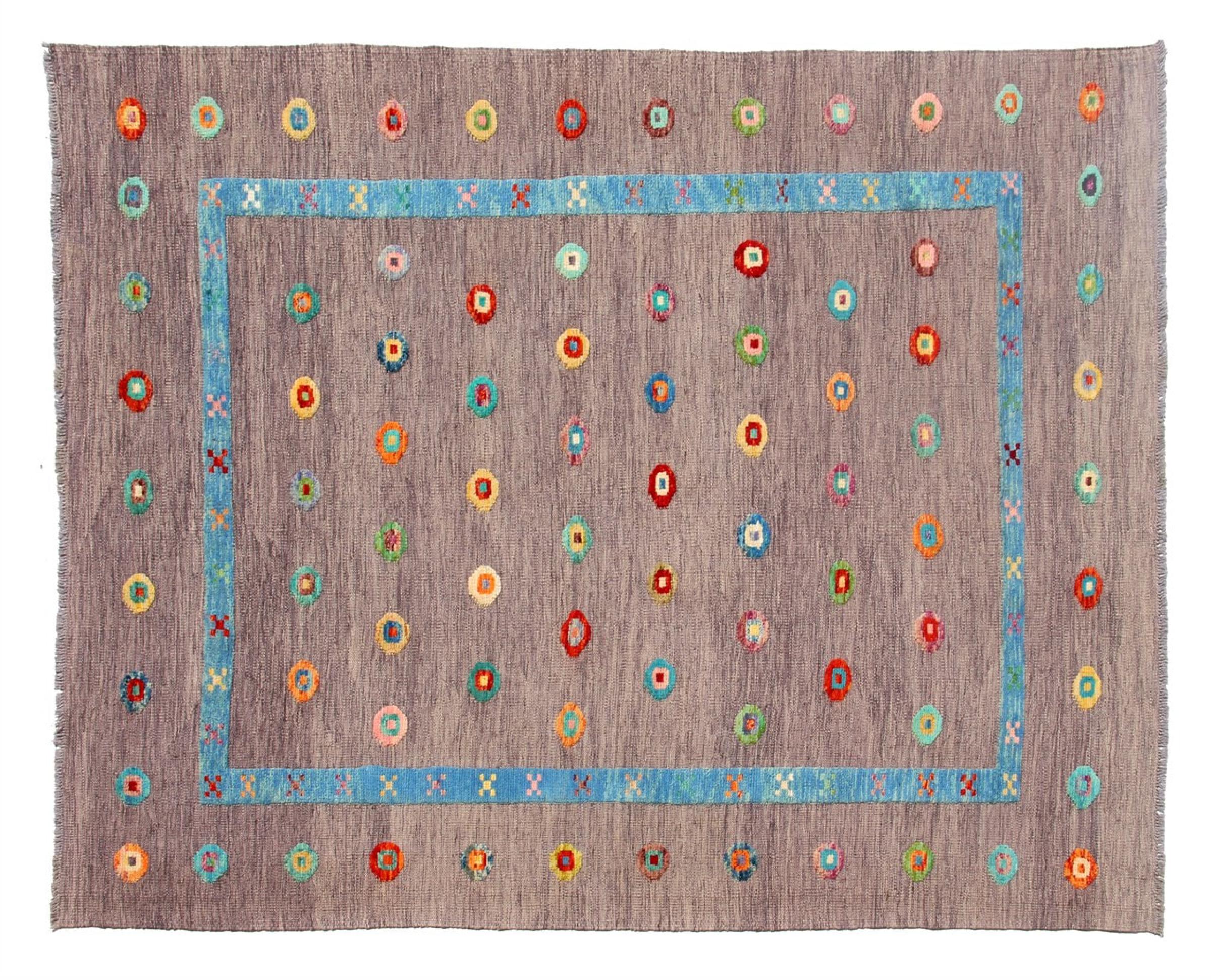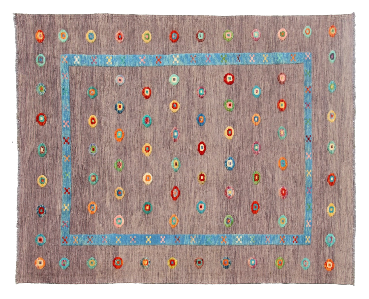 Esta alfombra fue hecha a mano en un telar como un tejido plano. Tejido plano es el término utilizado para describir las alfombras que no tienen pelo. Como el nombre promete, estas alfombras están tejidas y no anudadas. Esto resulta en una alfombra plana con una superficie estructurada. Los tejidos planos no son tan suaves y normalmente más delgados que las alfombras anudadas. Al mismo tiempo, su fabricación es mucho menos compleja y por lo general se pueden disponer por ambos lados (frontal y posterior). Sus patrones suelen ser geométricos, lo cual está determinado por el tejido.