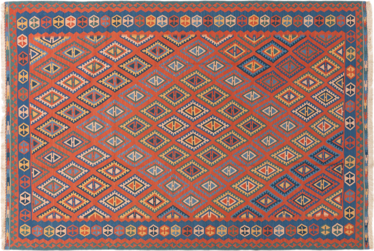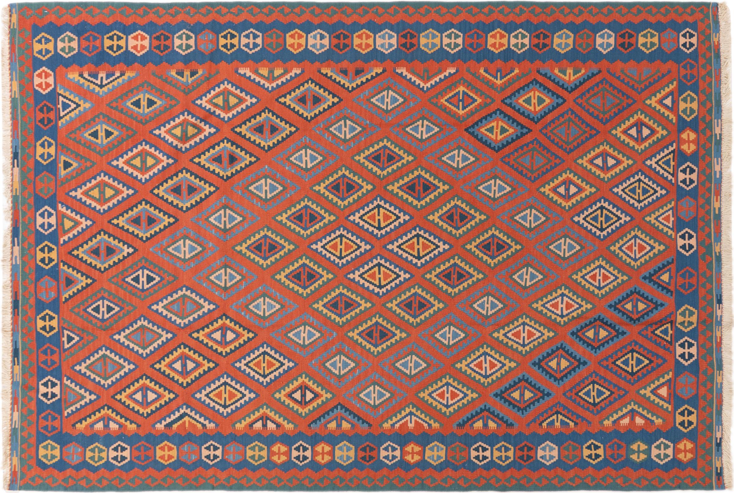 Esta alfombra fue hecha a mano en un telar como un tejido plano. Tejido plano es el término utilizado para describir las alfombras que no tienen pelo. Como el nombre promete, estas alfombras están tejidas y no anudadas. Esto resulta en una alfombra plana con una superficie estructurada. Los tejidos planos no son tan suaves y normalmente más delgados que las alfombras anudadas. Al mismo tiempo, su fabricación es mucho menos compleja y por lo general se pueden disponer por ambos lados (frontal y posterior). Sus patrones suelen ser geométricos, lo cual está determinado por el tejido.