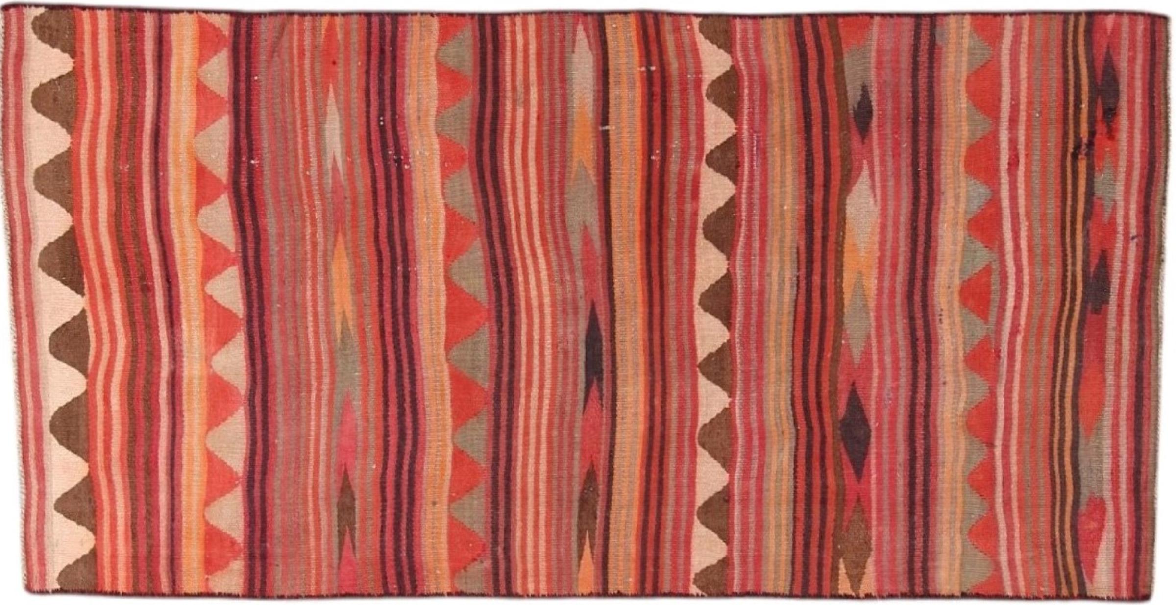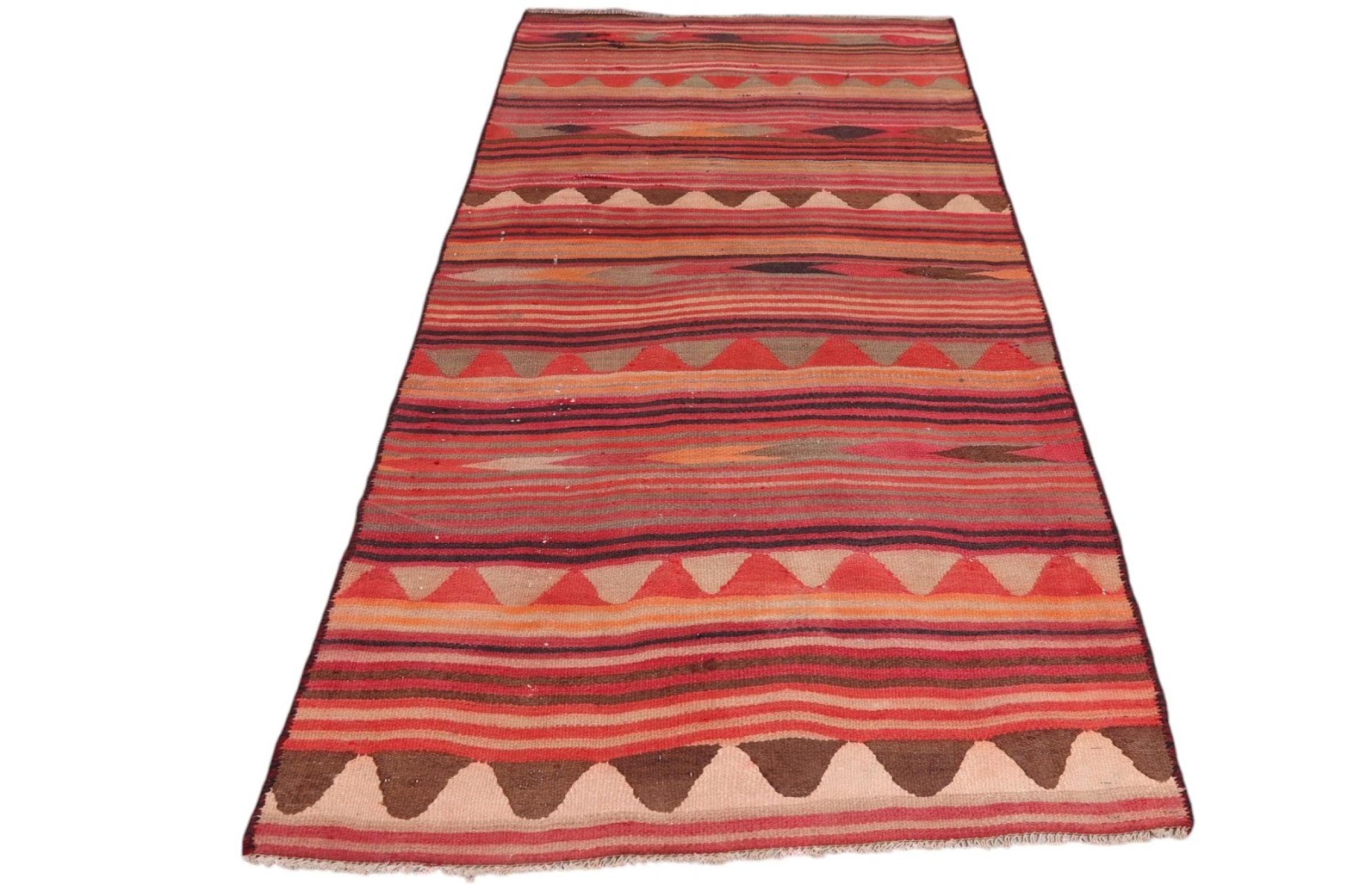 Estas alfombras kilim muestran una diferencia decisiva con las alfombras anudadas a mano - son tejidas a mano. Por lo tanto, no tienen un montón alto de lana y son a menudo más planos y más ásperos que las alfombras de lana anudada. Su fabricación es menos elaborada y por eso suelen ser mucho más baratas. Como ventaja, las alfombras de kilim son también mucho más ligeras y pueden ser colocadas por delante y por detrás. Los kilims tejidos a mano provienen originalmente de la antigua Persia y ahora también se fabrican a menudo en el Afganistán. Tienen patrones bastante simples y directos, que se deben a su técnica de tejido.