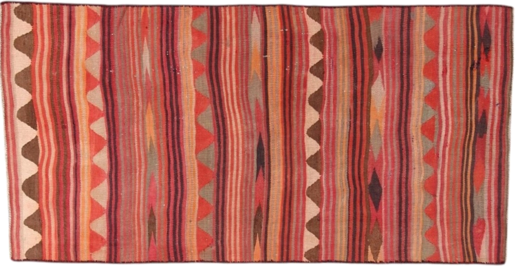 Esta alfombra fue hecha a mano en un telar como un tejido plano. Tejido plano es el término utilizado para describir las alfombras que no tienen pelo. Como el nombre promete, estas alfombras están tejidas y no anudadas. Esto resulta en una alfombra plana con una superficie estructurada. Los tejidos planos no son tan suaves y normalmente más delgados que las alfombras anudadas. Al mismo tiempo, su fabricación es mucho menos compleja y por lo general se pueden disponer por ambos lados (frontal y posterior). Sus patrones suelen ser geométricos, lo cual está determinado por el tejido.