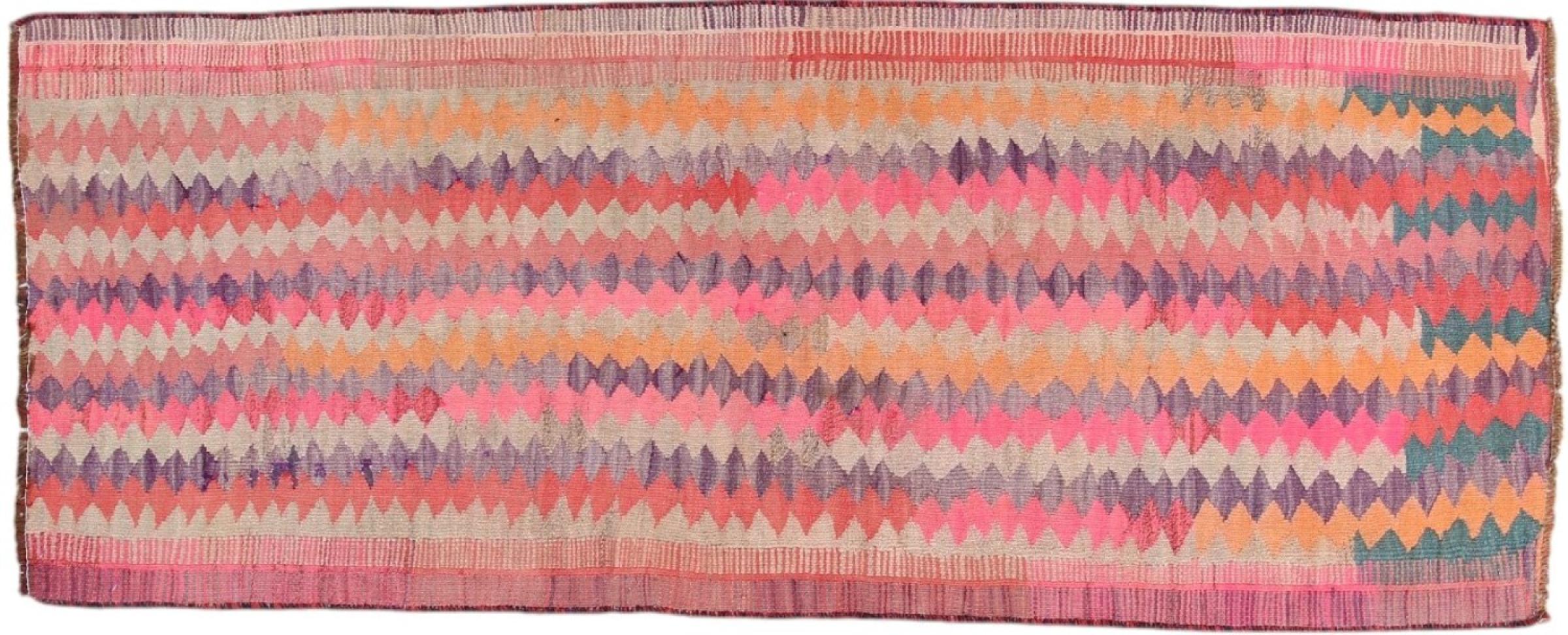 Esta alfombra fue hecha a mano en un telar como un tejido plano. Tejido plano es el término utilizado para describir las alfombras que no tienen pelo. Como el nombre promete, estas alfombras están tejidas y no anudadas. Esto resulta en una alfombra plana con una superficie estructurada. Los tejidos planos no son tan suaves y normalmente más delgados que las alfombras anudadas. Al mismo tiempo, su fabricación es mucho menos compleja y por lo general se pueden disponer por ambos lados (frontal y posterior). Sus patrones suelen ser geométricos, lo cual está determinado por el tejido.