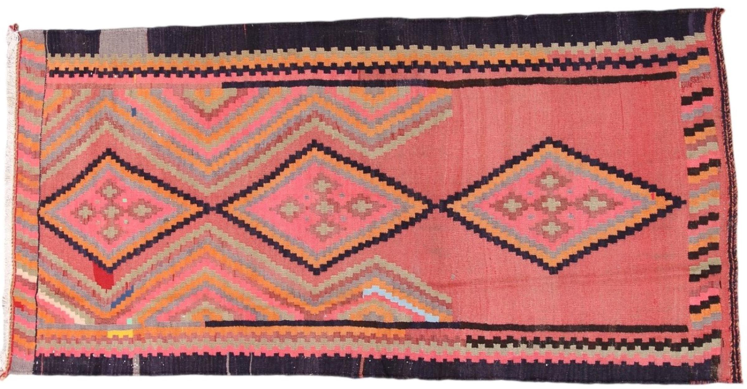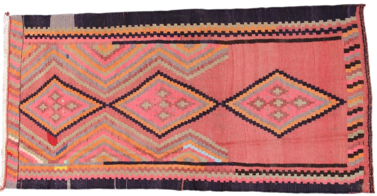 Esta alfombra fue hecha a mano en un telar como un tejido plano. Tejido plano es el término utilizado para describir las alfombras que no tienen pelo. Como el nombre promete, estas alfombras están tejidas y no anudadas. Esto resulta en una alfombra plana con una superficie estructurada. Los tejidos planos no son tan suaves y normalmente más delgados que las alfombras anudadas. Al mismo tiempo, su fabricación es mucho menos compleja y por lo general se pueden disponer por ambos lados (frontal y posterior). Sus patrones suelen ser geométricos, lo cual está determinado por el tejido.