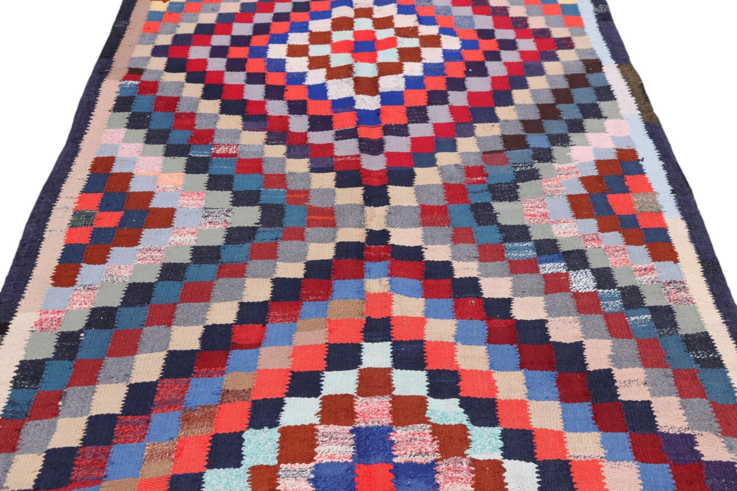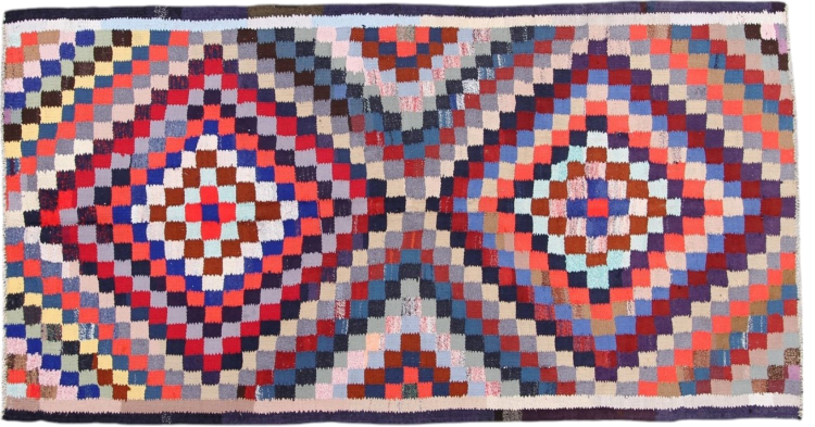 Esta alfombra fue hecha a mano en un telar como un tejido plano. Tejido plano es el término utilizado para describir las alfombras que no tienen pelo. Como el nombre promete, estas alfombras están tejidas y no anudadas. Esto resulta en una alfombra plana con una superficie estructurada. Los tejidos planos no son tan suaves y normalmente más delgados que las alfombras anudadas. Al mismo tiempo, su fabricación es mucho menos compleja y por lo general se pueden disponer por ambos lados (frontal y posterior). Sus patrones suelen ser geométricos, lo cual está determinado por el tejido.
