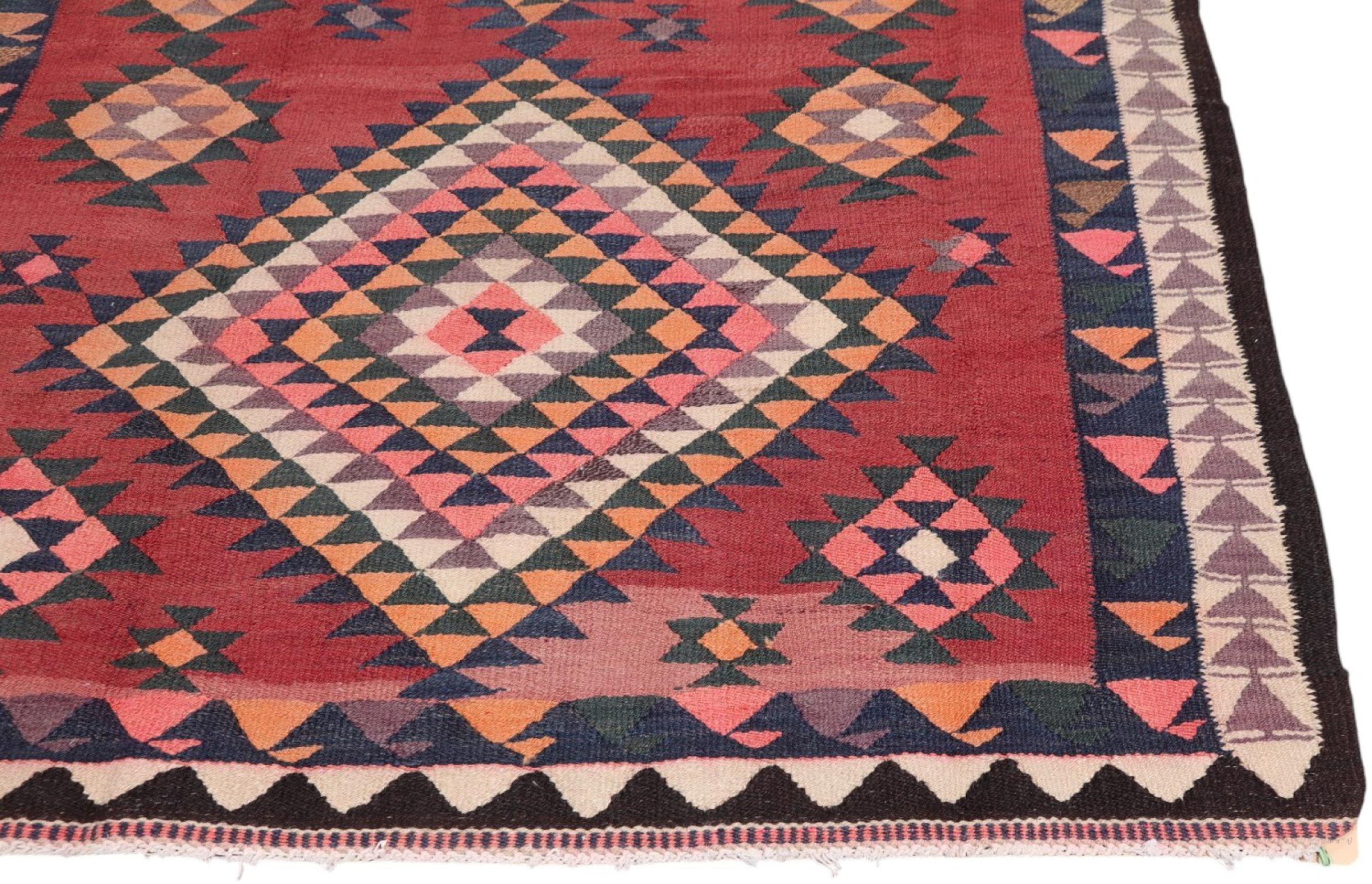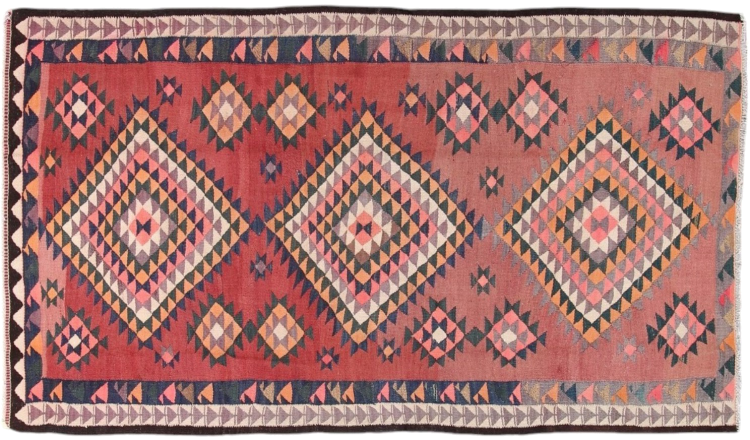 Esta alfombra fue hecha a mano en un telar como un tejido plano. Tejido plano es el término utilizado para describir las alfombras que no tienen pelo. Como el nombre promete, estas alfombras están tejidas y no anudadas. Esto resulta en una alfombra plana con una superficie estructurada. Los tejidos planos no son tan suaves y normalmente más delgados que las alfombras anudadas. Al mismo tiempo, su fabricación es mucho menos compleja y por lo general se pueden disponer por ambos lados (frontal y posterior). Sus patrones suelen ser geométricos, lo cual está determinado por el tejido.
