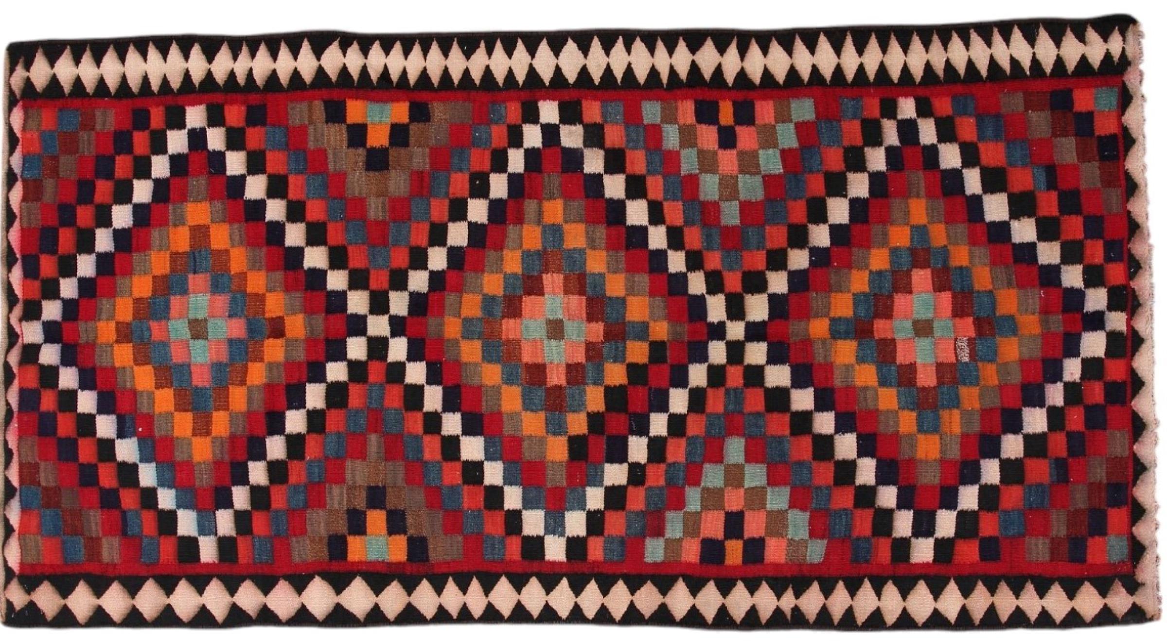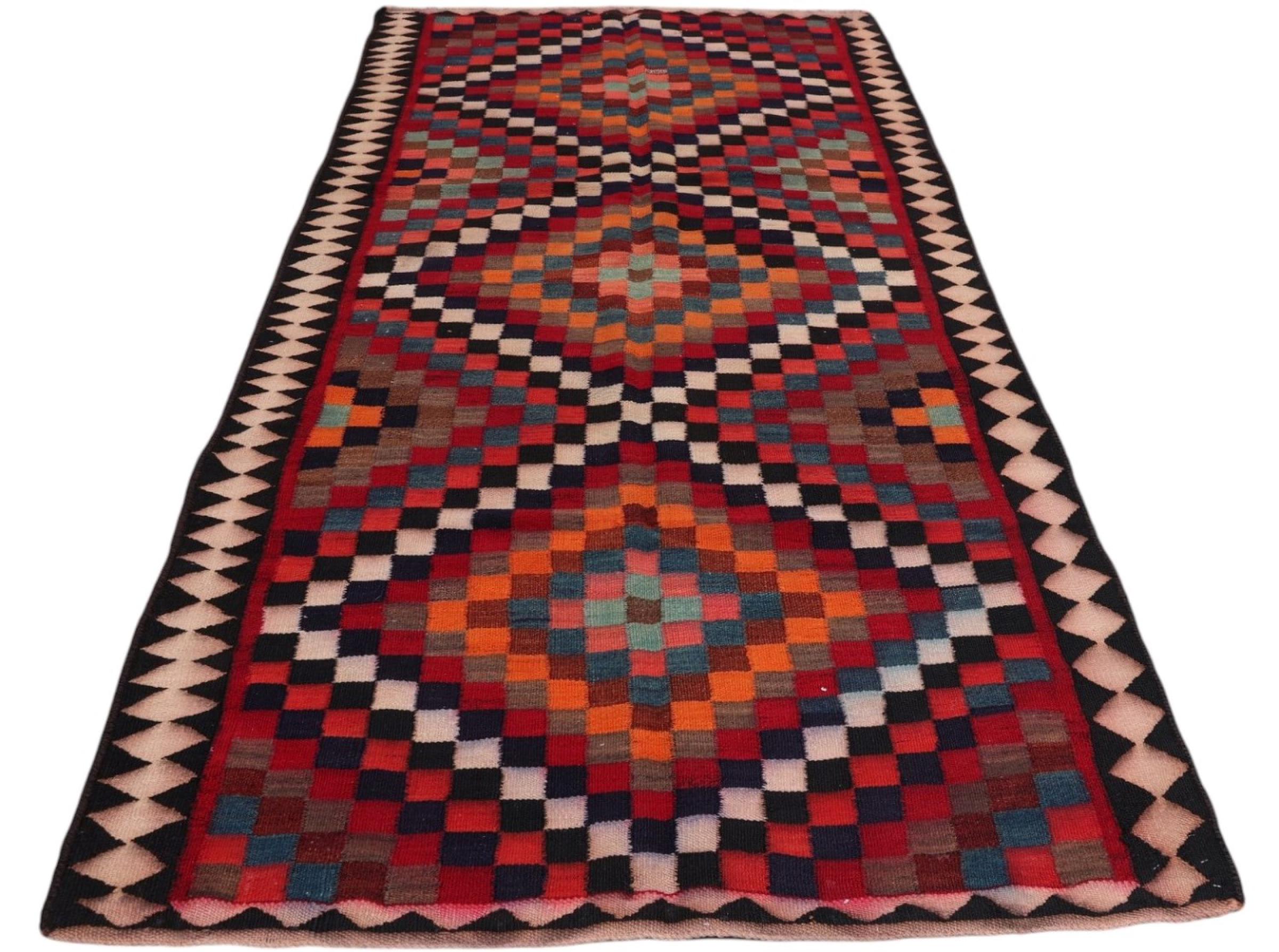 Estas alfombras kilim muestran una diferencia decisiva con las alfombras anudadas a mano - son tejidas a mano. Por lo tanto, no tienen un montón alto de lana y son a menudo más planos y más ásperos que las alfombras de lana anudada. Su fabricación es menos elaborada y por eso suelen ser mucho más baratas. Como ventaja, las alfombras de kilim son también mucho más ligeras y pueden ser colocadas por delante y por detrás. Los kilims tejidos a mano provienen originalmente de la antigua Persia y ahora también se fabrican a menudo en el Afganistán. Tienen patrones bastante simples y directos, que se deben a su técnica de tejido.