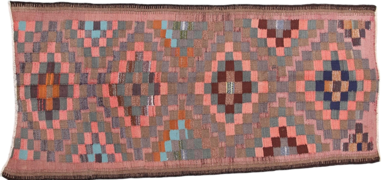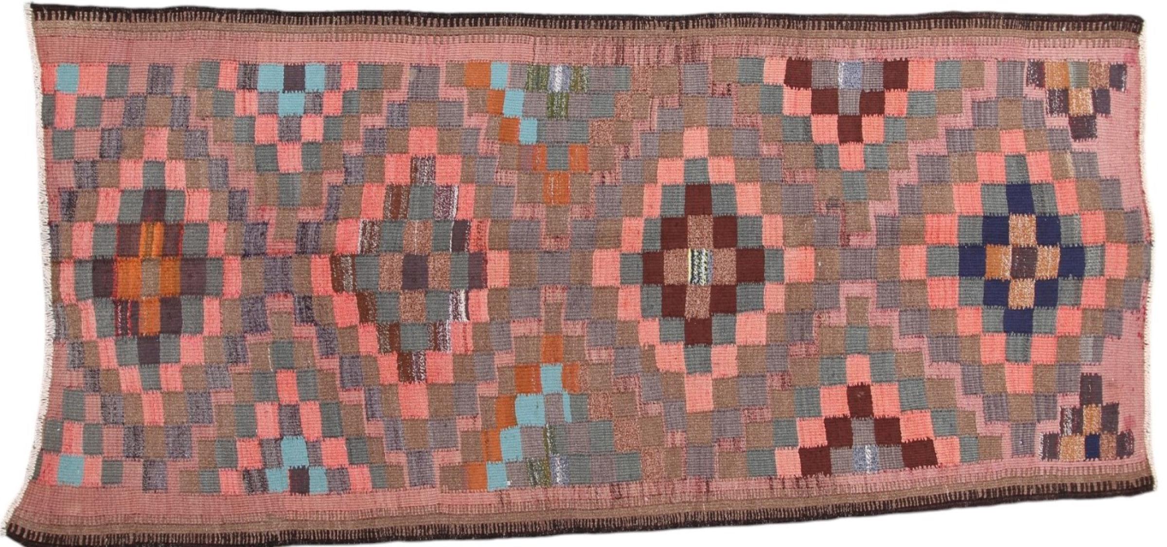 Esta alfombra fue hecha a mano en un telar como un tejido plano. Tejido plano es el término utilizado para describir las alfombras que no tienen pelo. Como el nombre promete, estas alfombras están tejidas y no anudadas. Esto resulta en una alfombra plana con una superficie estructurada. Los tejidos planos no son tan suaves y normalmente más delgados que las alfombras anudadas. Al mismo tiempo, su fabricación es mucho menos compleja y por lo general se pueden disponer por ambos lados (frontal y posterior). Sus patrones suelen ser geométricos, lo cual está determinado por el tejido.
