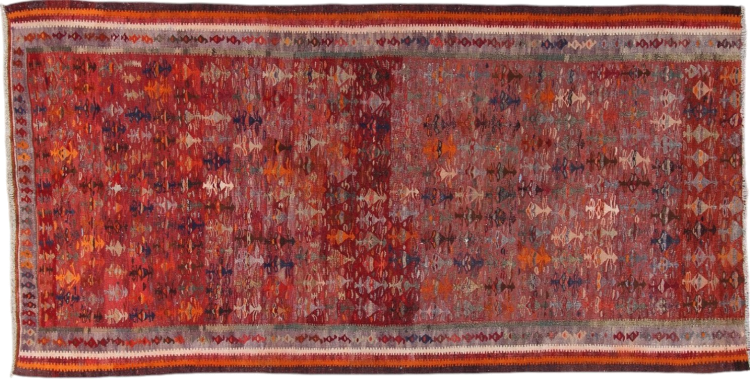 Esta alfombra fue hecha a mano en un telar como un tejido plano. Tejido plano es el término utilizado para describir las alfombras que no tienen pelo. Como el nombre promete, estas alfombras están tejidas y no anudadas. Esto resulta en una alfombra plana con una superficie estructurada. Los tejidos planos no son tan suaves y normalmente más delgados que las alfombras anudadas. Al mismo tiempo, su fabricación es mucho menos compleja y por lo general se pueden disponer por ambos lados (frontal y posterior). Sus patrones suelen ser geométricos, lo cual está determinado por el tejido.