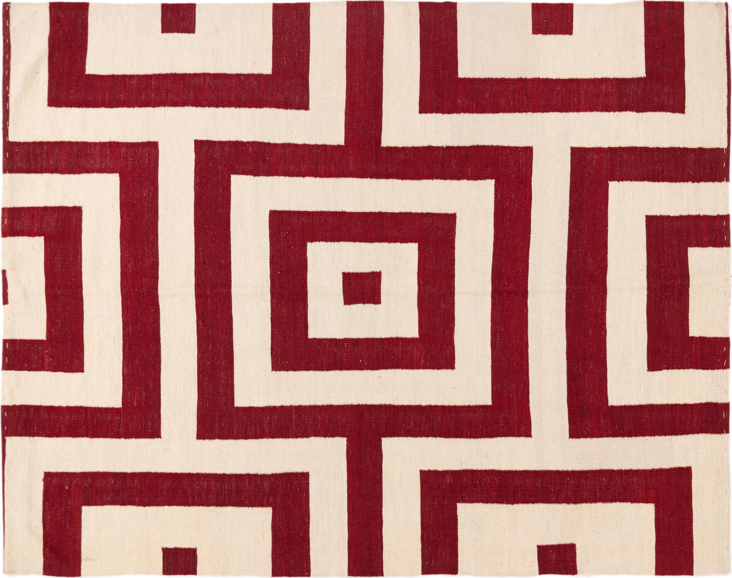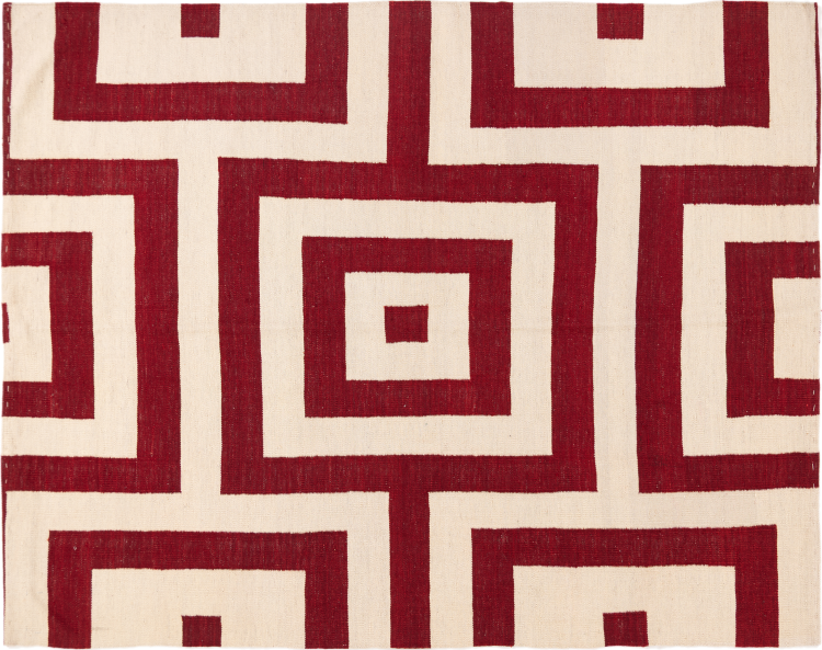 Esta alfombra fue hecha a mano en un telar como un tejido plano. Tejido plano es el término utilizado para describir las alfombras que no tienen pelo. Como el nombre promete, estas alfombras están tejidas y no anudadas. Esto resulta en una alfombra plana con una superficie estructurada. Los tejidos planos no son tan suaves y normalmente más delgados que las alfombras anudadas. Al mismo tiempo, su fabricación es mucho menos compleja y por lo general se pueden disponer por ambos lados (frontal y posterior). Sus patrones suelen ser geométricos, lo cual está determinado por el tejido.