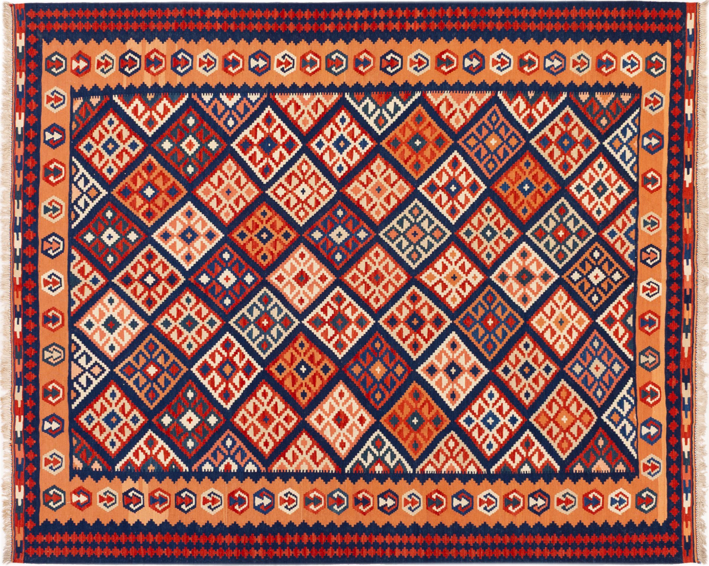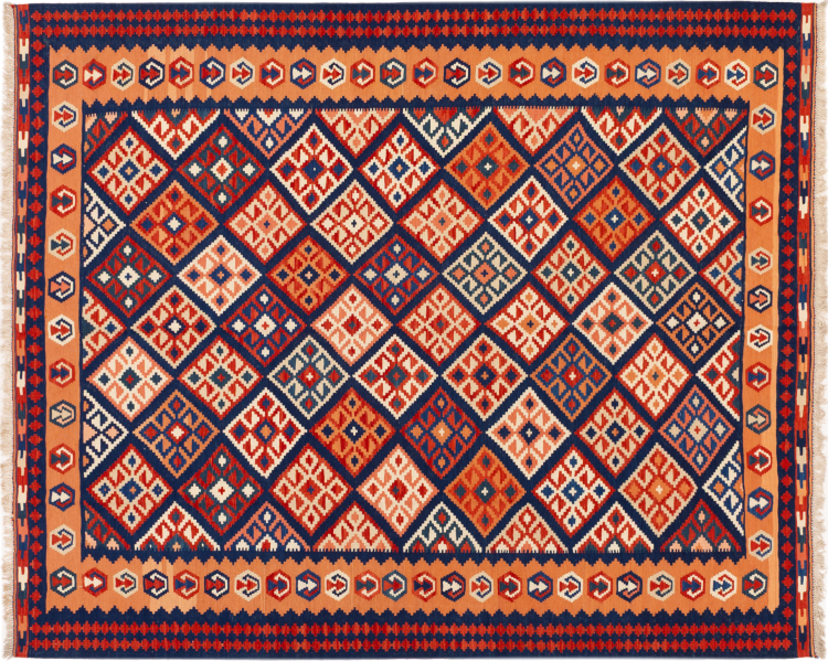 Esta alfombra fue hecha a mano en un telar como un tejido plano. Tejido plano es el término utilizado para describir las alfombras que no tienen pelo. Como el nombre promete, estas alfombras están tejidas y no anudadas. Esto resulta en una alfombra plana con una superficie estructurada. Los tejidos planos no son tan suaves y normalmente más delgados que las alfombras anudadas. Al mismo tiempo, su fabricación es mucho menos compleja y por lo general se pueden disponer por ambos lados (frontal y posterior). Sus patrones suelen ser geométricos, lo cual está determinado por el tejido.