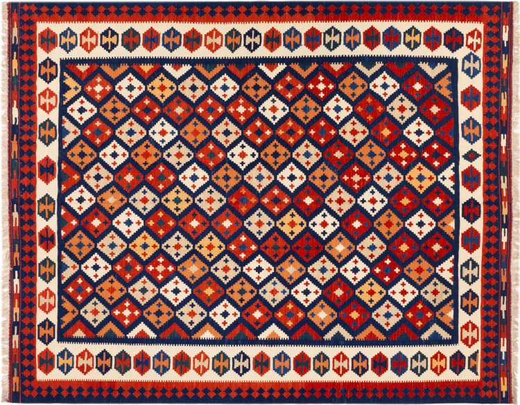 Esta alfombra fue hecha a mano en un telar como un tejido plano. Tejido plano es el término utilizado para describir las alfombras que no tienen pelo. Como el nombre promete, estas alfombras están tejidas y no anudadas. Esto resulta en una alfombra plana con una superficie estructurada. Los tejidos planos no son tan suaves y normalmente más delgados que las alfombras anudadas. Al mismo tiempo, su fabricación es mucho menos compleja y por lo general se pueden disponer por ambos lados (frontal y posterior). Sus patrones suelen ser geométricos, lo cual está determinado por el tejido.