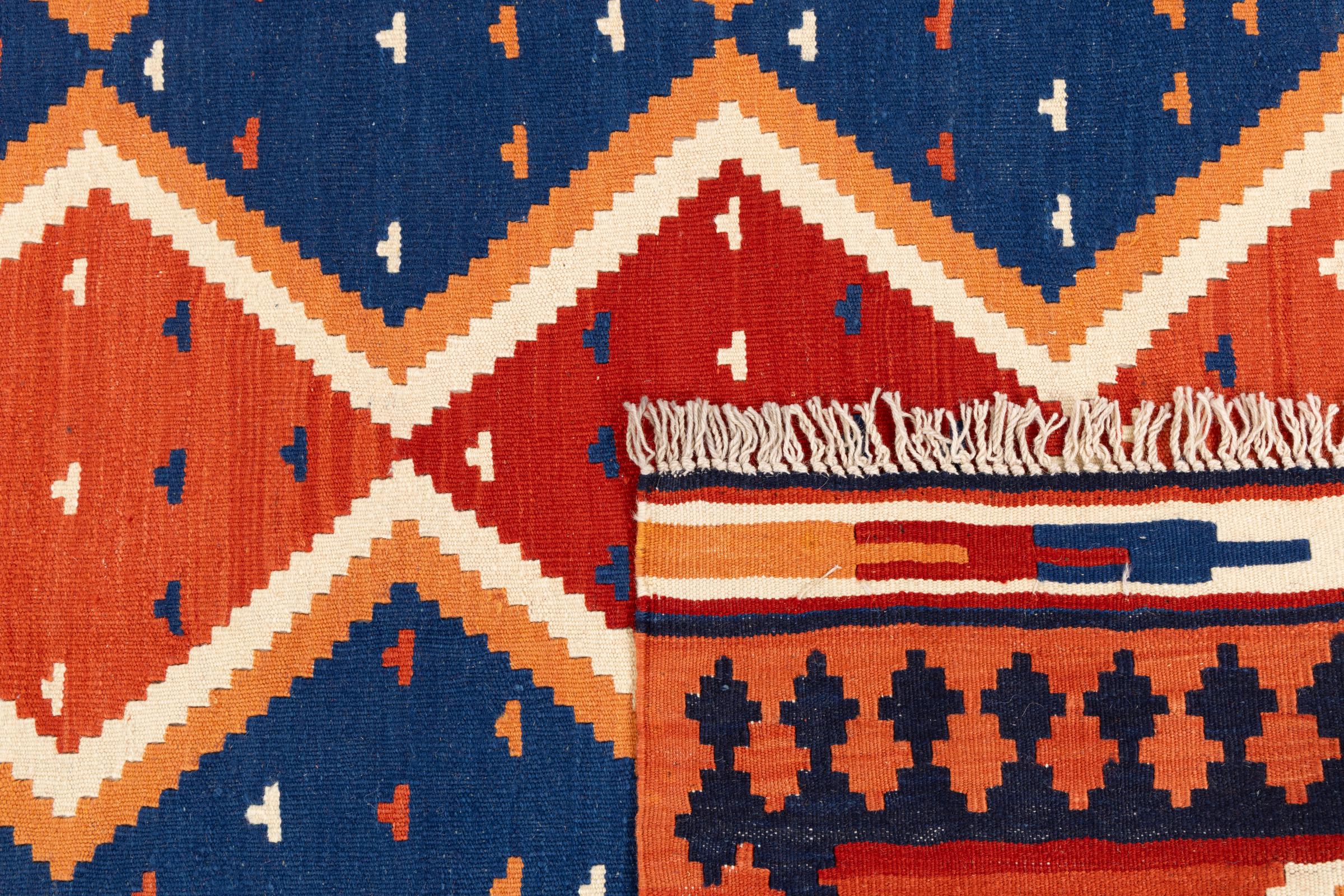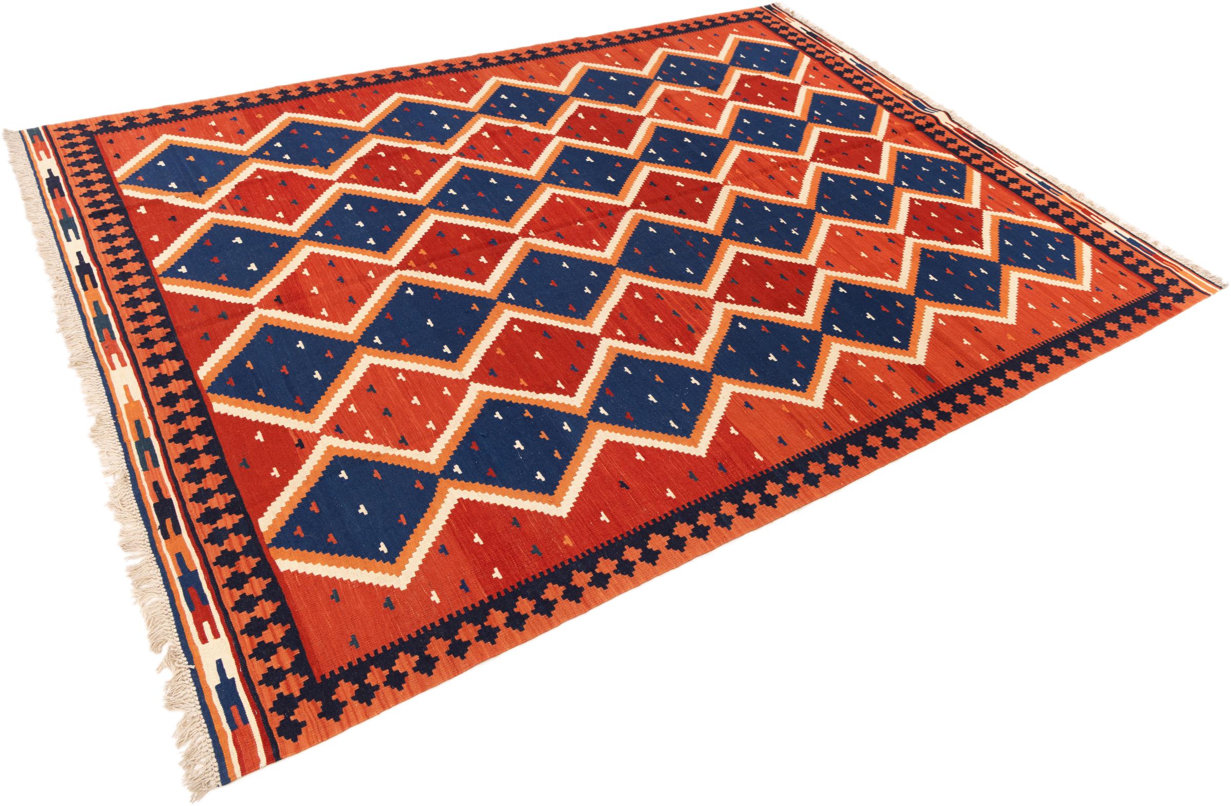 Este kilim Fars tejido a mano combina motivos y ornamentos persas con la tradición de los tejidos planos. Una gran y moderna combinación de los conceptos más populares de Oriente. Esto también da como resultado una alfombra con una gran variedad de usos. Ya sea como colcha o delante del sofá como alfombra, una Kelim Fars lo hace posible y ahora se puede encontrar en las revistas de diseño de interiores más populares. Las alfombras kilim fars se tejen a mano en Irán, por lo que se encuentran entre los kilims de mayor calidad.