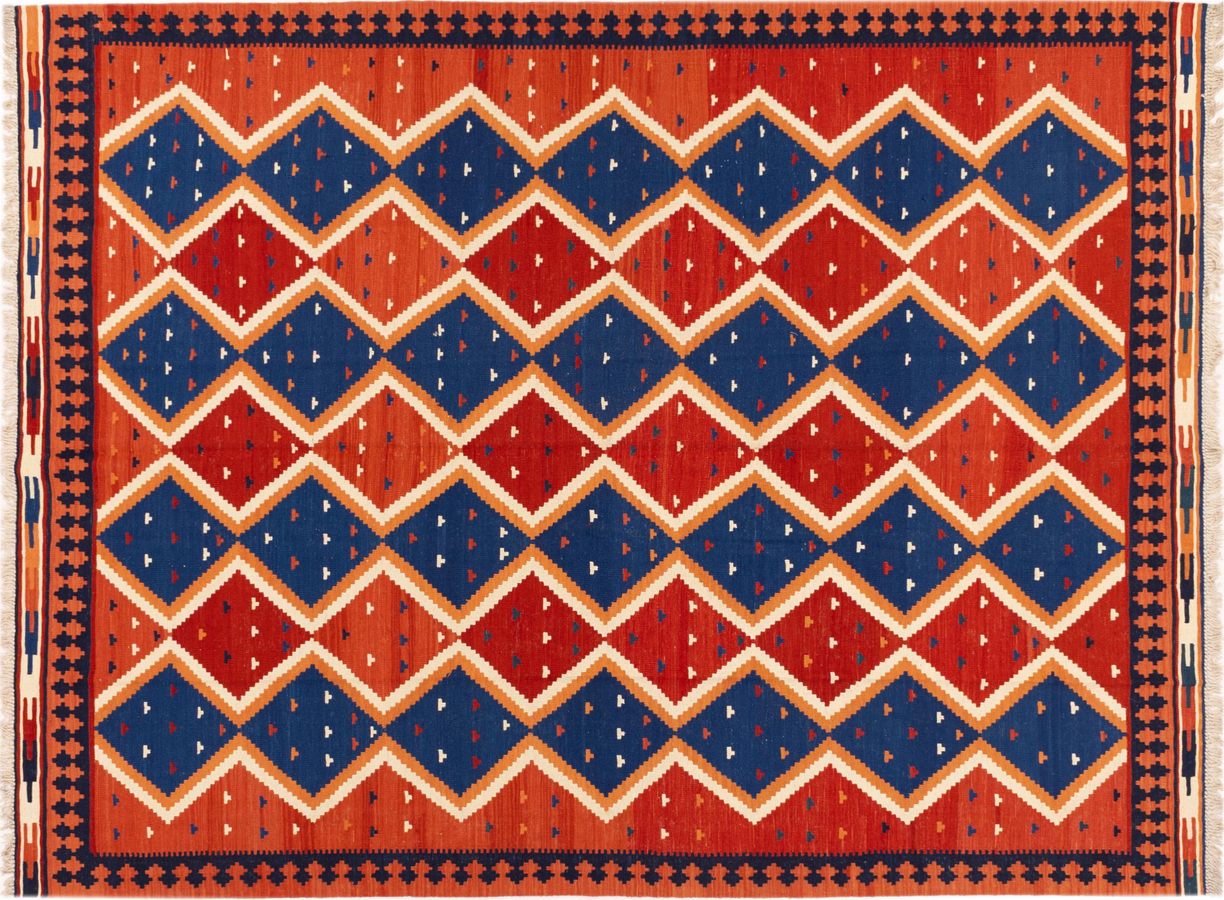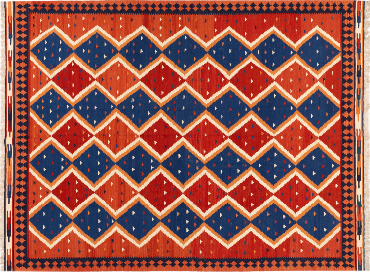 Esta alfombra fue hecha a mano en un telar como un tejido plano. Tejido plano es el término utilizado para describir las alfombras que no tienen pelo. Como el nombre promete, estas alfombras están tejidas y no anudadas. Esto resulta en una alfombra plana con una superficie estructurada. Los tejidos planos no son tan suaves y normalmente más delgados que las alfombras anudadas. Al mismo tiempo, su fabricación es mucho menos compleja y por lo general se pueden disponer por ambos lados (frontal y posterior). Sus patrones suelen ser geométricos, lo cual está determinado por el tejido.