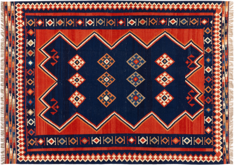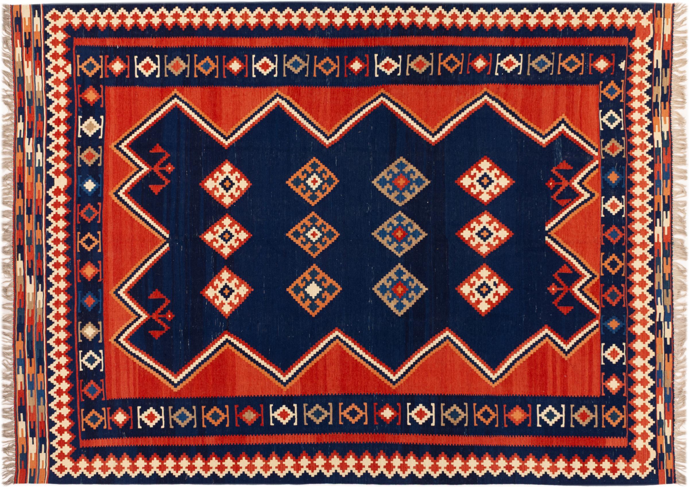 Esta alfombra fue hecha a mano en un telar como un tejido plano. Tejido plano es el término utilizado para describir las alfombras que no tienen pelo. Como el nombre promete, estas alfombras están tejidas y no anudadas. Esto resulta en una alfombra plana con una superficie estructurada. Los tejidos planos no son tan suaves y normalmente más delgados que las alfombras anudadas. Al mismo tiempo, su fabricación es mucho menos compleja y por lo general se pueden disponer por ambos lados (frontal y posterior). Sus patrones suelen ser geométricos, lo cual está determinado por el tejido.