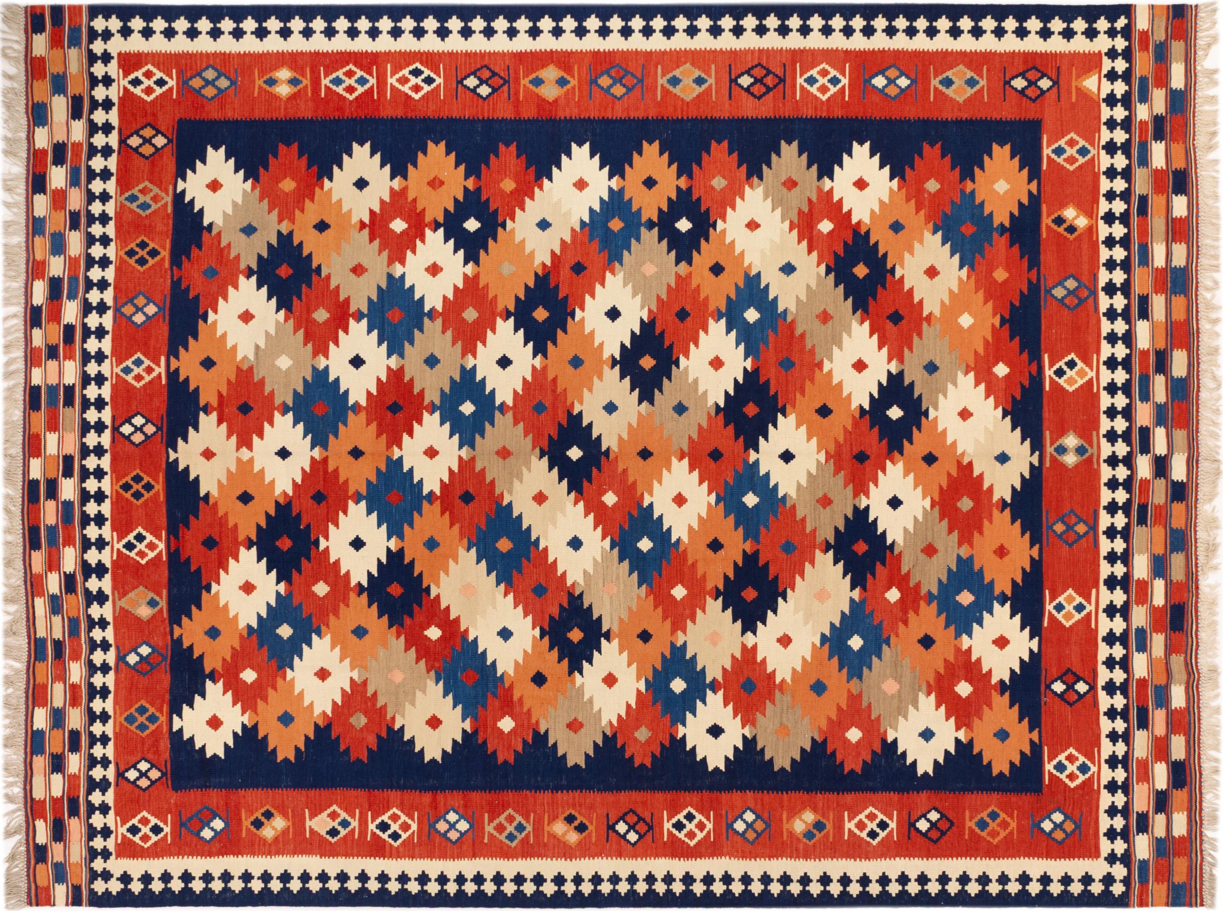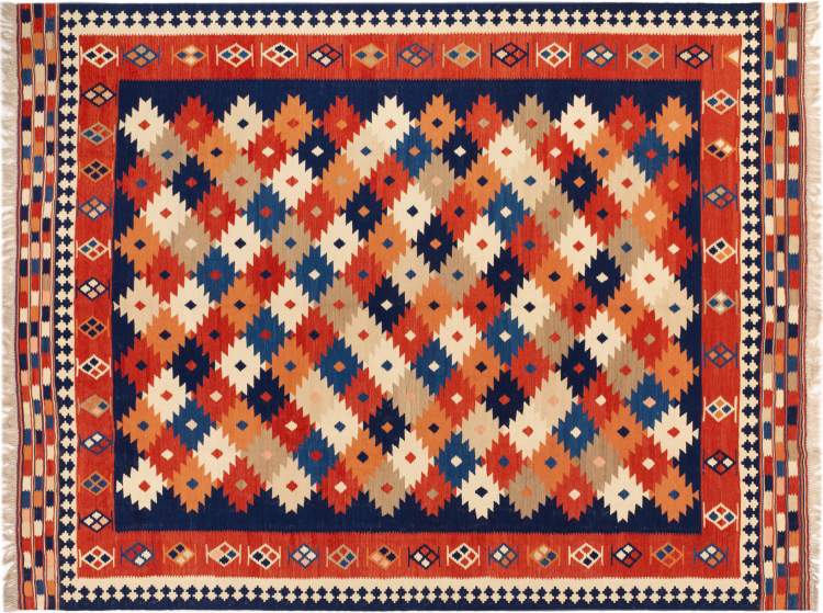 Esta alfombra fue hecha a mano en un telar como un tejido plano. Tejido plano es el término utilizado para describir las alfombras que no tienen pelo. Como el nombre promete, estas alfombras están tejidas y no anudadas. Esto resulta en una alfombra plana con una superficie estructurada. Los tejidos planos no son tan suaves y normalmente más delgados que las alfombras anudadas. Al mismo tiempo, su fabricación es mucho menos compleja y por lo general se pueden disponer por ambos lados (frontal y posterior). Sus patrones suelen ser geométricos, lo cual está determinado por el tejido.