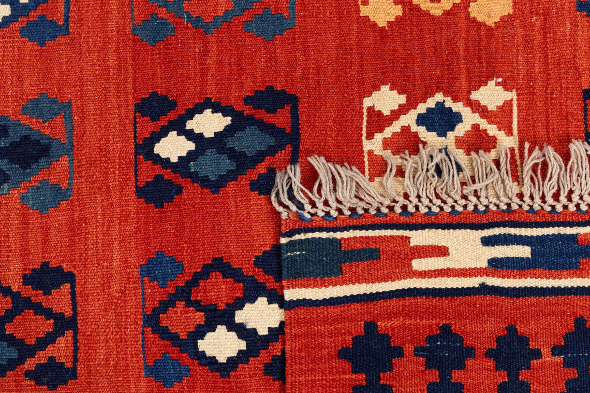 Esta alfombra fue hecha a mano en un telar como un tejido plano. Tejido plano es el término utilizado para describir las alfombras que no tienen pelo. Como el nombre promete, estas alfombras están tejidas y no anudadas. Esto resulta en una alfombra plana con una superficie estructurada. Los tejidos planos no son tan suaves y normalmente más delgados que las alfombras anudadas. Al mismo tiempo, su fabricación es mucho menos compleja y por lo general se pueden disponer por ambos lados (frontal y posterior). Sus patrones suelen ser geométricos, lo cual está determinado por el tejido.