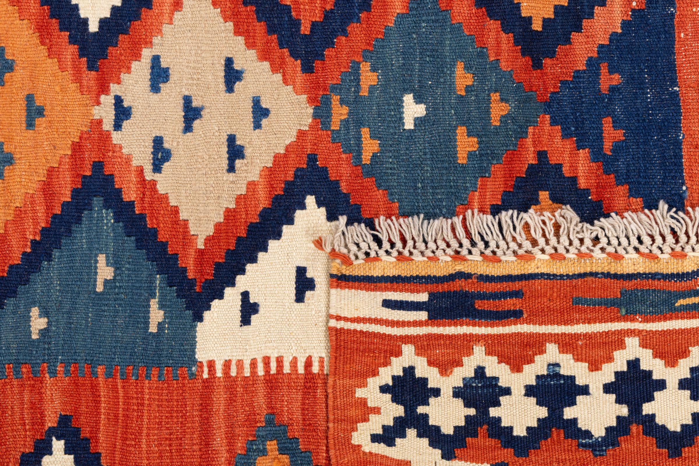 Estas alfombras kilim muestran una diferencia decisiva con las alfombras anudadas a mano - son tejidas a mano. Por lo tanto, no tienen un montón alto de lana y son a menudo más planos y más ásperos que las alfombras de lana anudada. Su fabricación es menos elaborada y por eso suelen ser mucho más baratas. Como ventaja, las alfombras de kilim son también mucho más ligeras y pueden ser colocadas por delante y por detrás. Los kilims tejidos a mano provienen originalmente de la antigua Persia y ahora también se fabrican a menudo en el Afganistán. Tienen patrones bastante simples y directos, que se deben a su técnica de tejido.