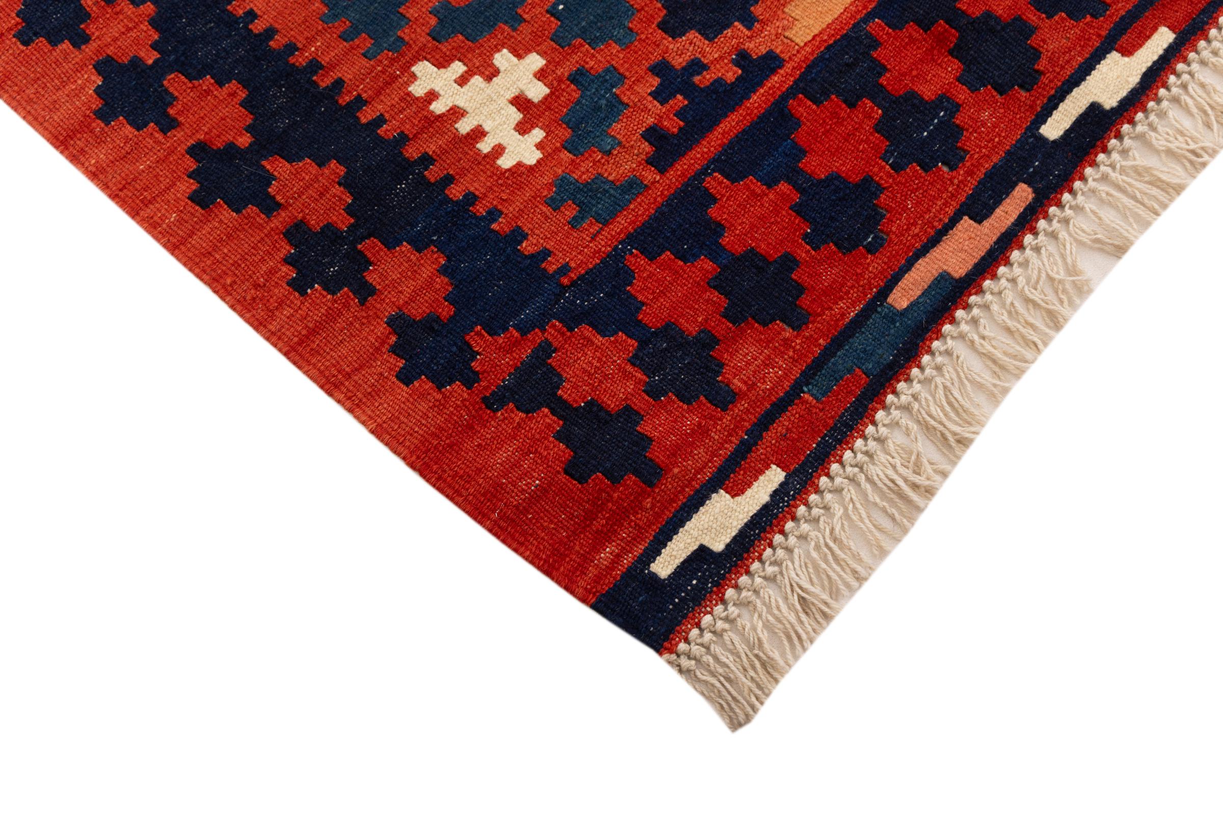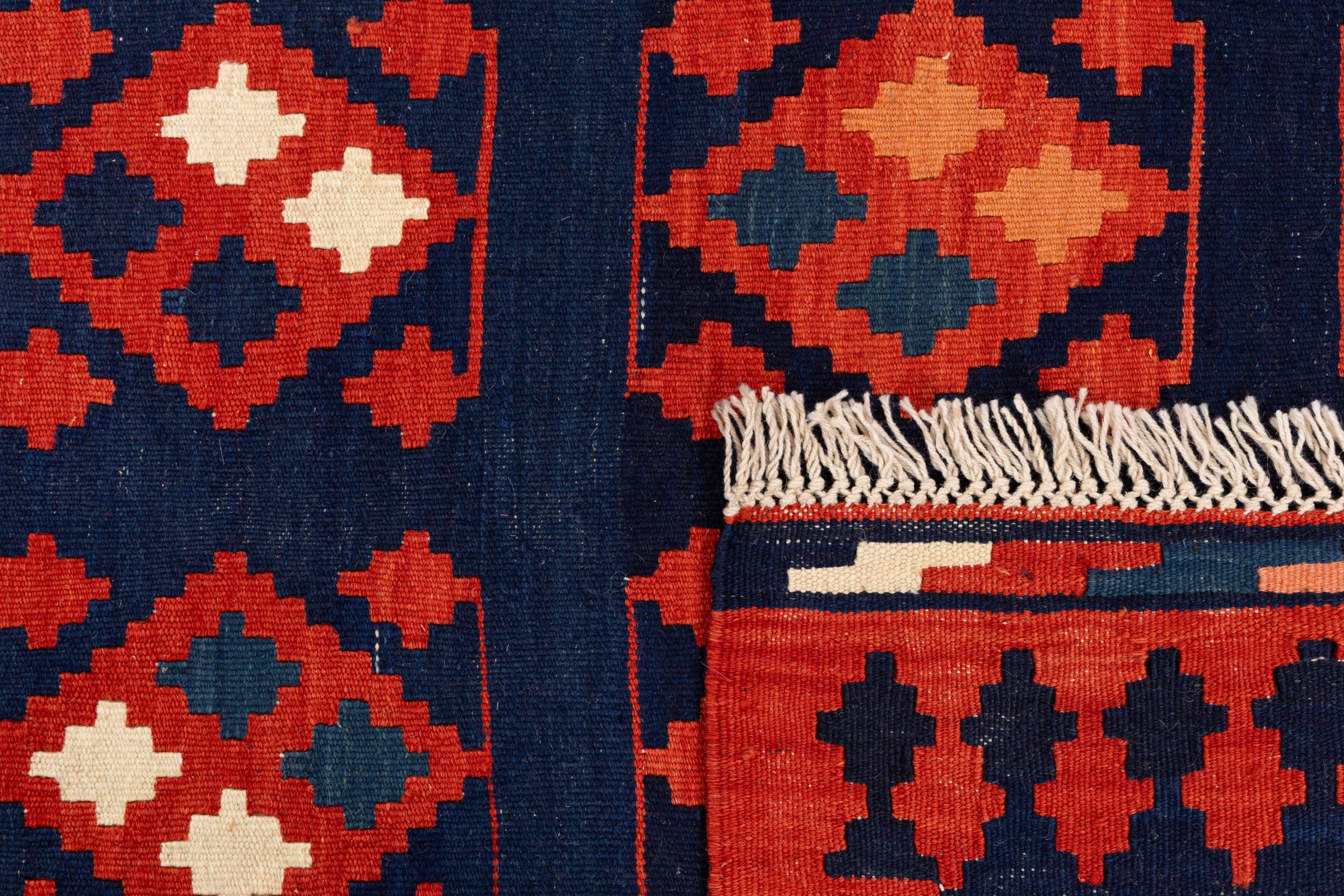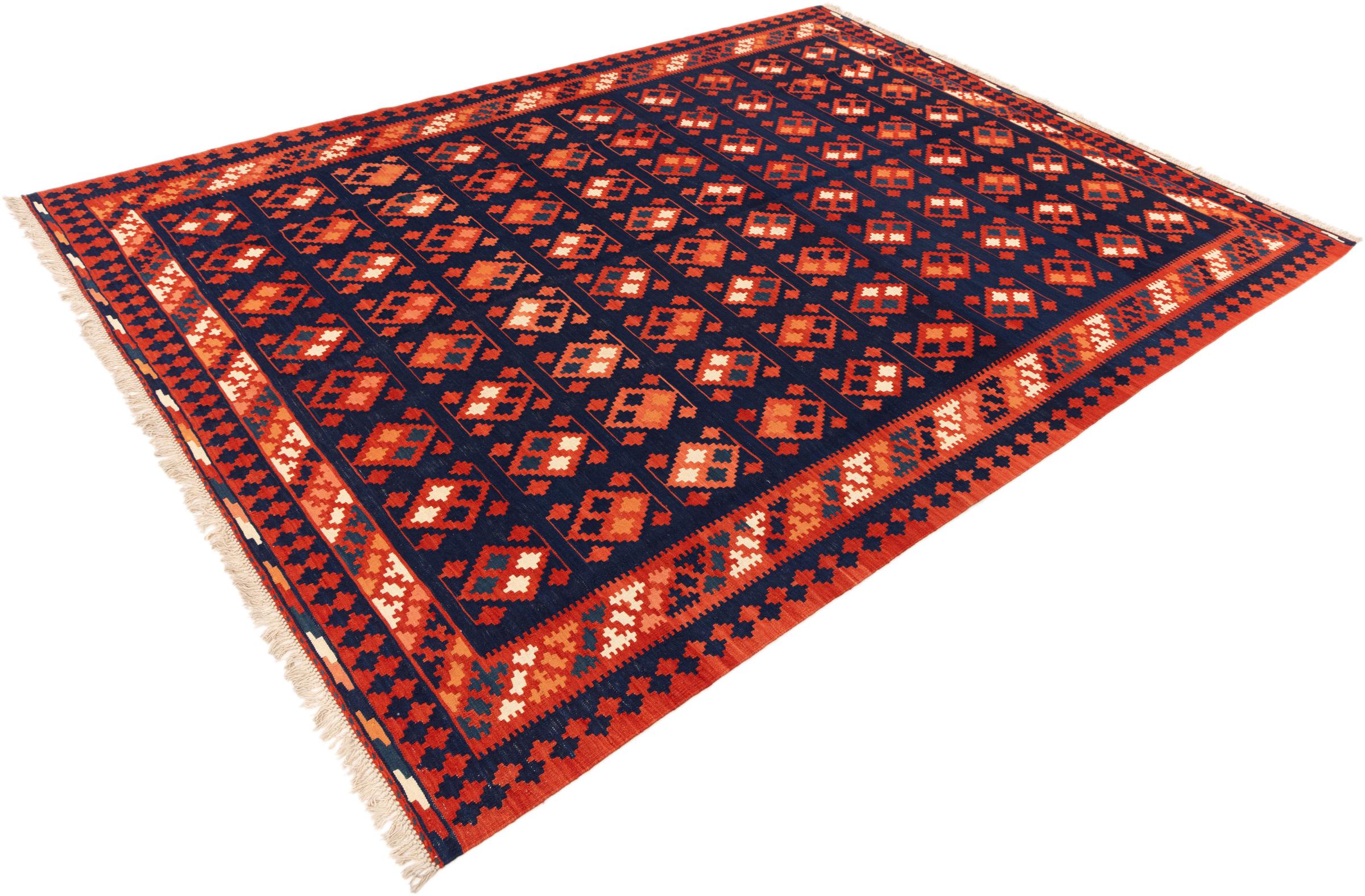 Estas alfombras kilim muestran una diferencia decisiva con las alfombras anudadas a mano - son tejidas a mano. Por lo tanto, no tienen un montón alto de lana y son a menudo más planos y más ásperos que las alfombras de lana anudada. Su fabricación es menos elaborada y por eso suelen ser mucho más baratas. Como ventaja, las alfombras de kilim son también mucho más ligeras y pueden ser colocadas por delante y por detrás. Los kilims tejidos a mano provienen originalmente de la antigua Persia y ahora también se fabrican a menudo en el Afganistán. Tienen patrones bastante simples y directos, que se deben a su técnica de tejido.