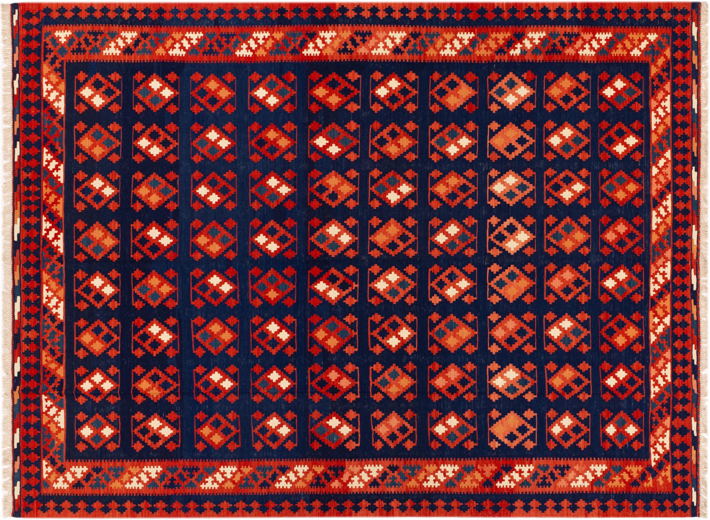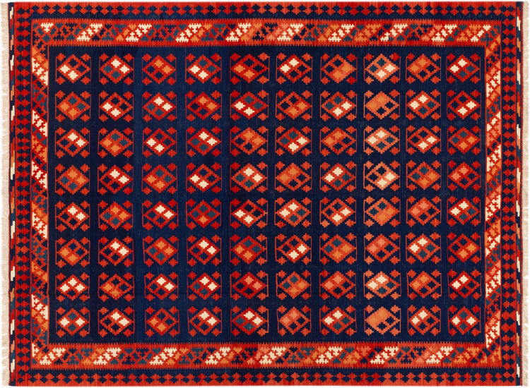 Esta alfombra fue hecha a mano en un telar como un tejido plano. Tejido plano es el término utilizado para describir las alfombras que no tienen pelo. Como el nombre promete, estas alfombras están tejidas y no anudadas. Esto resulta en una alfombra plana con una superficie estructurada. Los tejidos planos no son tan suaves y normalmente más delgados que las alfombras anudadas. Al mismo tiempo, su fabricación es mucho menos compleja y por lo general se pueden disponer por ambos lados (frontal y posterior). Sus patrones suelen ser geométricos, lo cual está determinado por el tejido.