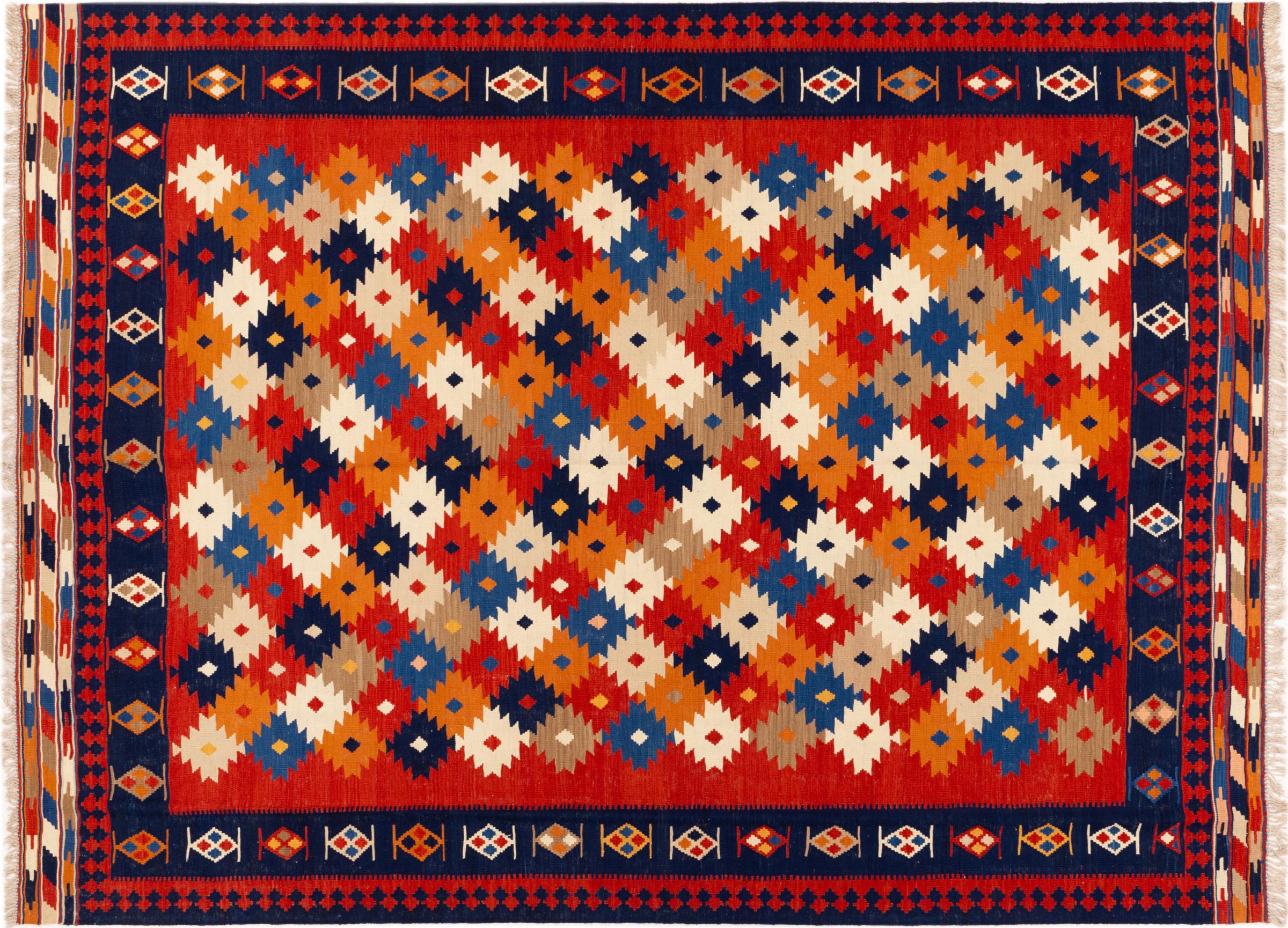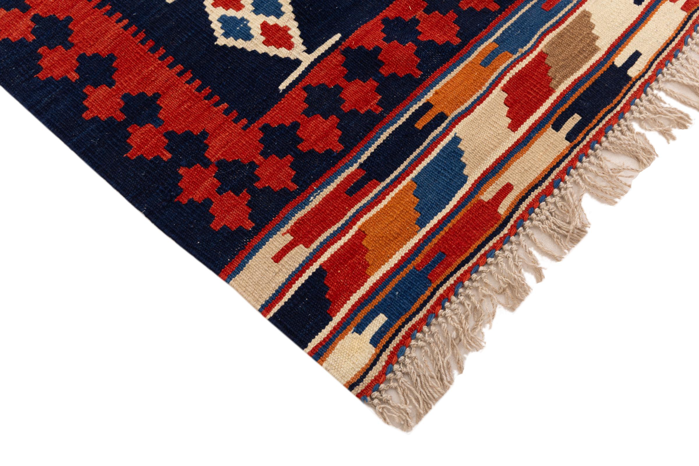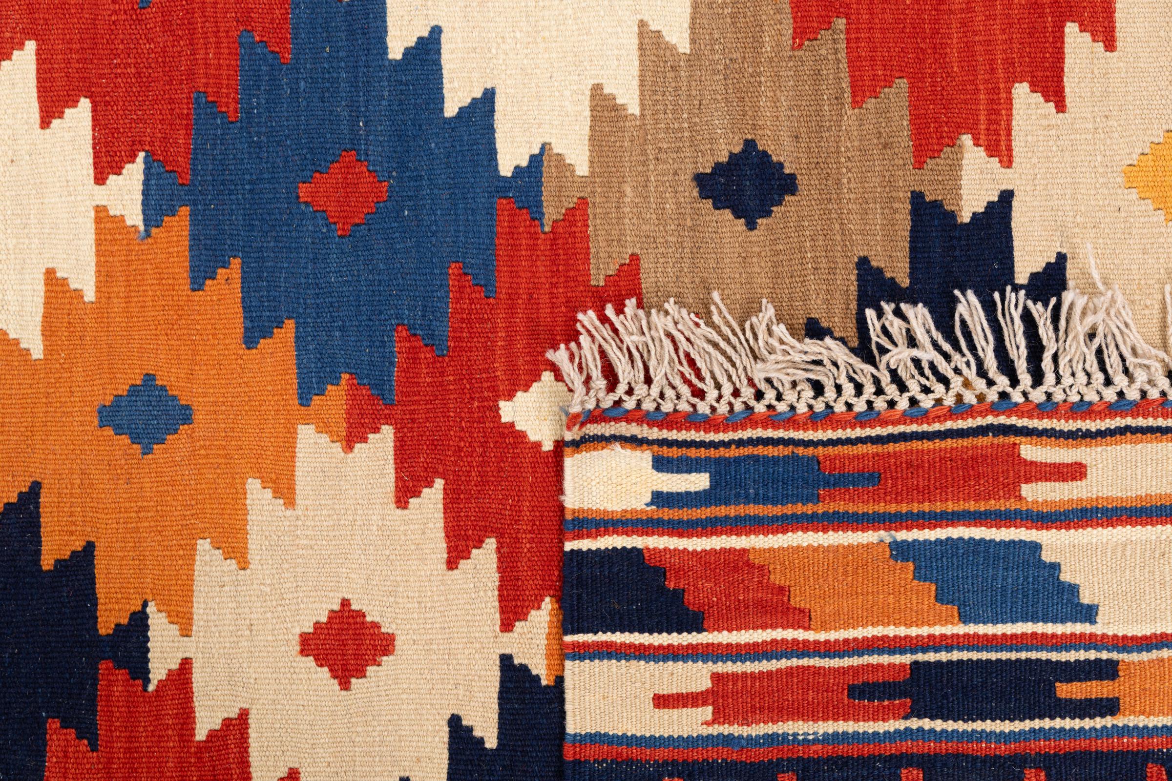 Estas alfombras kilim muestran una diferencia decisiva con las alfombras anudadas a mano - son tejidas a mano. Por lo tanto, no tienen un montón alto de lana y son a menudo más planos y más ásperos que las alfombras de lana anudada. Su fabricación es menos elaborada y por eso suelen ser mucho más baratas. Como ventaja, las alfombras de kilim son también mucho más ligeras y pueden ser colocadas por delante y por detrás. Los kilims tejidos a mano provienen originalmente de la antigua Persia y ahora también se fabrican a menudo en el Afganistán. Tienen patrones bastante simples y directos, que se deben a su técnica de tejido.