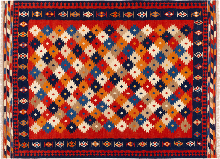 Esta alfombra fue hecha a mano en un telar como un tejido plano. Tejido plano es el término utilizado para describir las alfombras que no tienen pelo. Como el nombre promete, estas alfombras están tejidas y no anudadas. Esto resulta en una alfombra plana con una superficie estructurada. Los tejidos planos no son tan suaves y normalmente más delgados que las alfombras anudadas. Al mismo tiempo, su fabricación es mucho menos compleja y por lo general se pueden disponer por ambos lados (frontal y posterior). Sus patrones suelen ser geométricos, lo cual está determinado por el tejido.