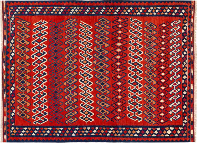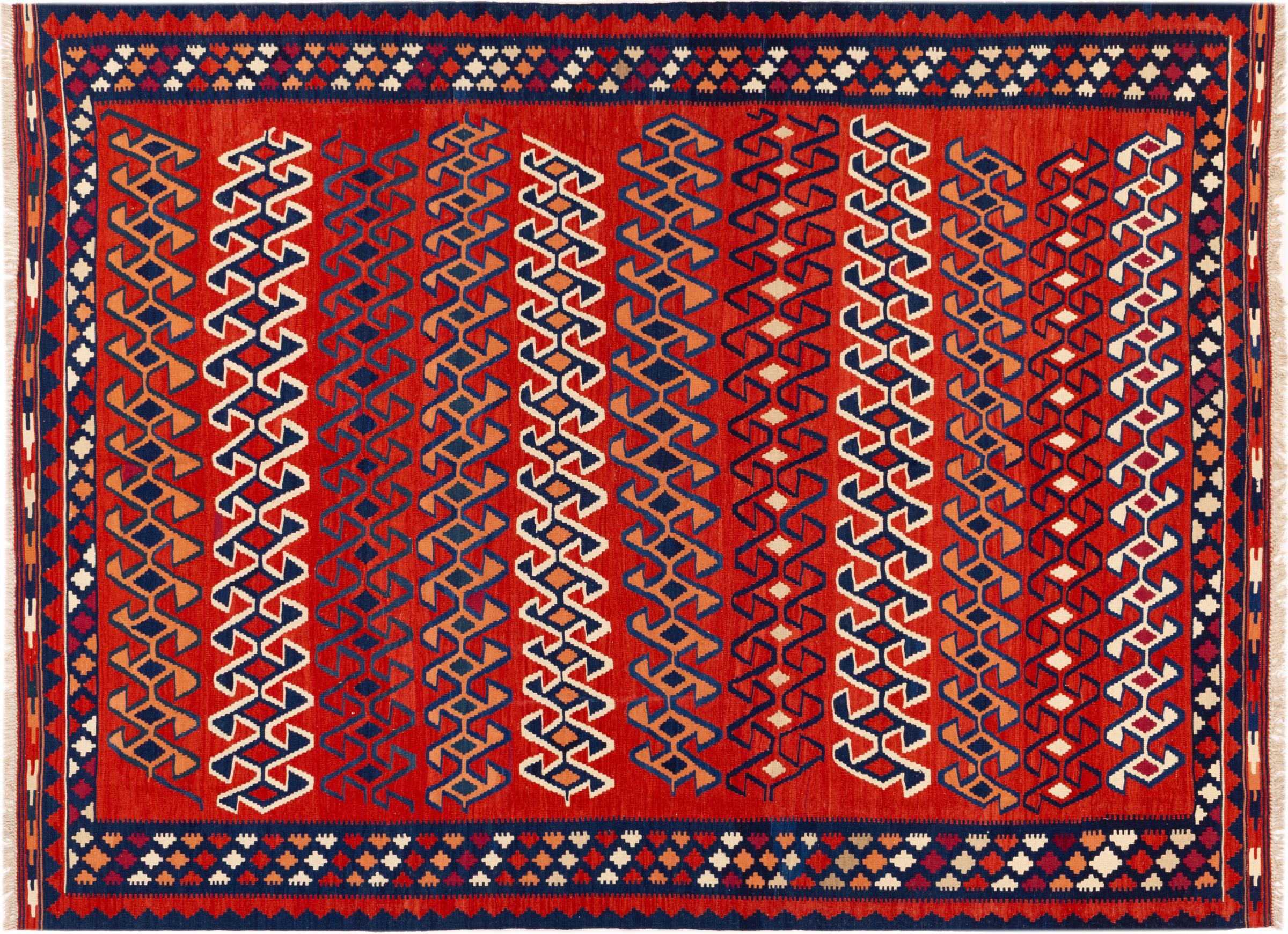 Esta alfombra fue hecha a mano en un telar como un tejido plano. Tejido plano es el término utilizado para describir las alfombras que no tienen pelo. Como el nombre promete, estas alfombras están tejidas y no anudadas. Esto resulta en una alfombra plana con una superficie estructurada. Los tejidos planos no son tan suaves y normalmente más delgados que las alfombras anudadas. Al mismo tiempo, su fabricación es mucho menos compleja y por lo general se pueden disponer por ambos lados (frontal y posterior). Sus patrones suelen ser geométricos, lo cual está determinado por el tejido.