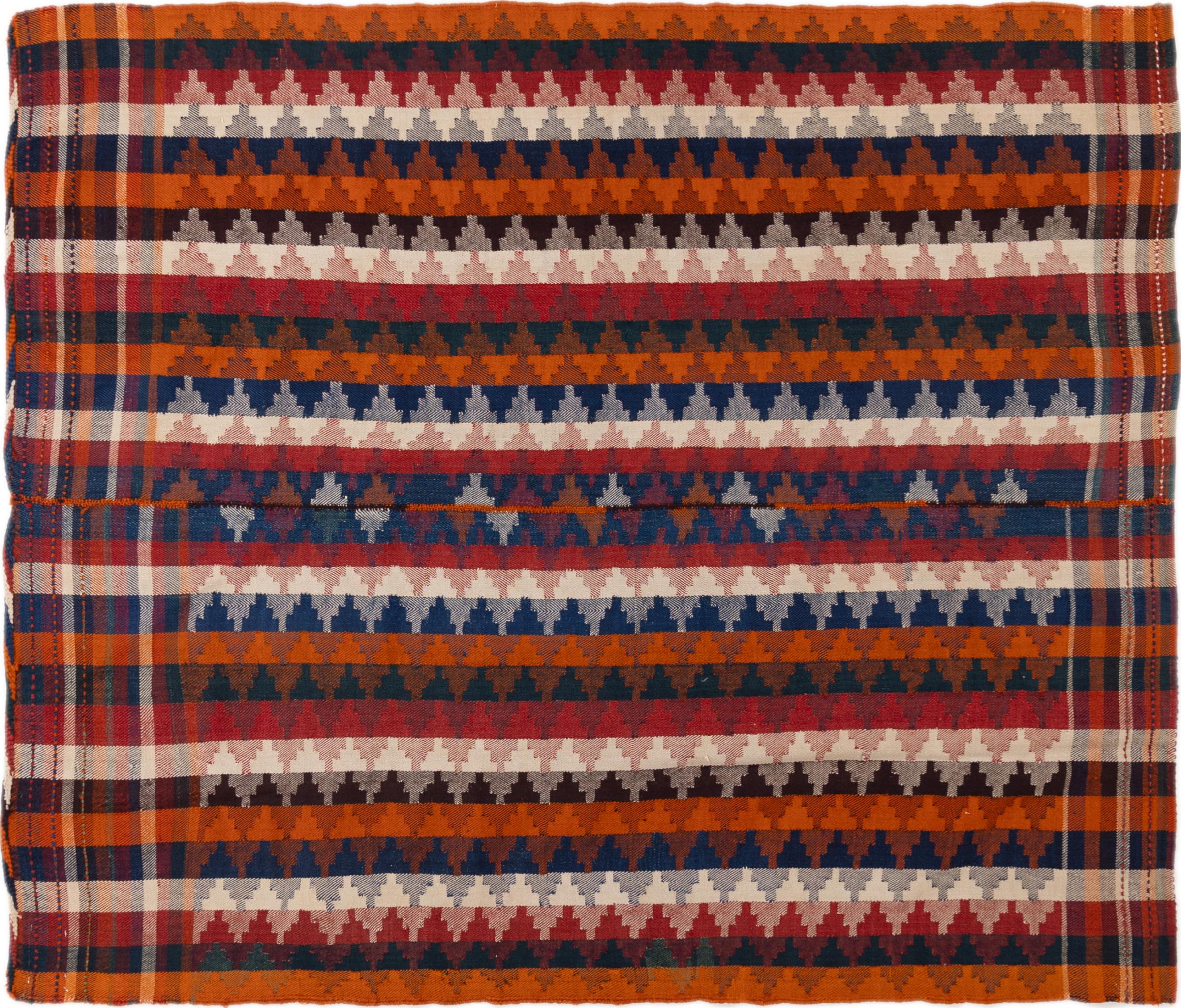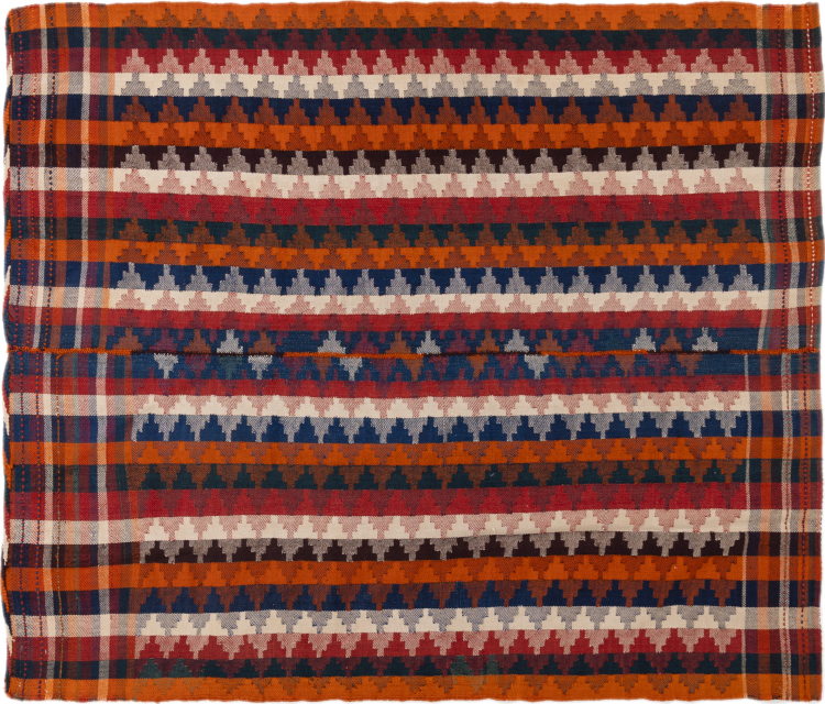 Esta alfombra fue hecha a mano en un telar como un tejido plano. Tejido plano es el término utilizado para describir las alfombras que no tienen pelo. Como el nombre promete, estas alfombras están tejidas y no anudadas. Esto resulta en una alfombra plana con una superficie estructurada. Los tejidos planos no son tan suaves y normalmente más delgados que las alfombras anudadas. Al mismo tiempo, su fabricación es mucho menos compleja y por lo general se pueden disponer por ambos lados (frontal y posterior). Sus patrones suelen ser geométricos, lo cual está determinado por el tejido.
