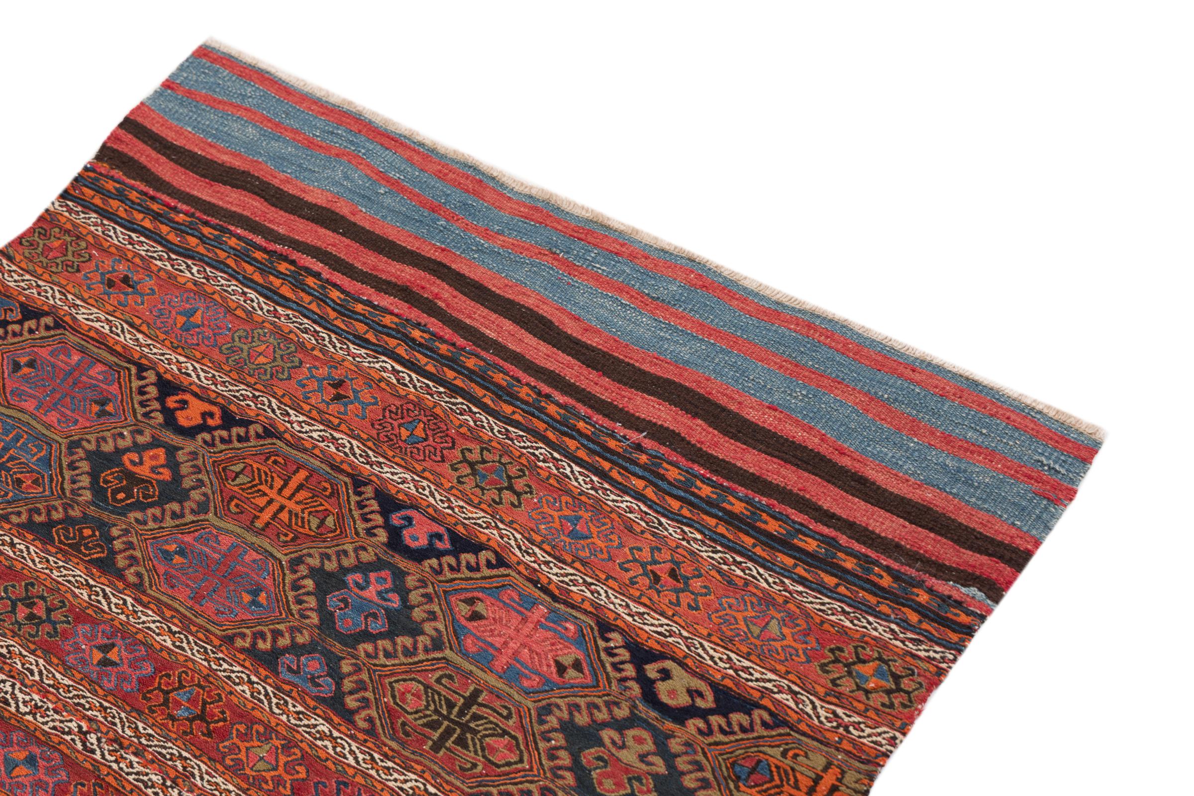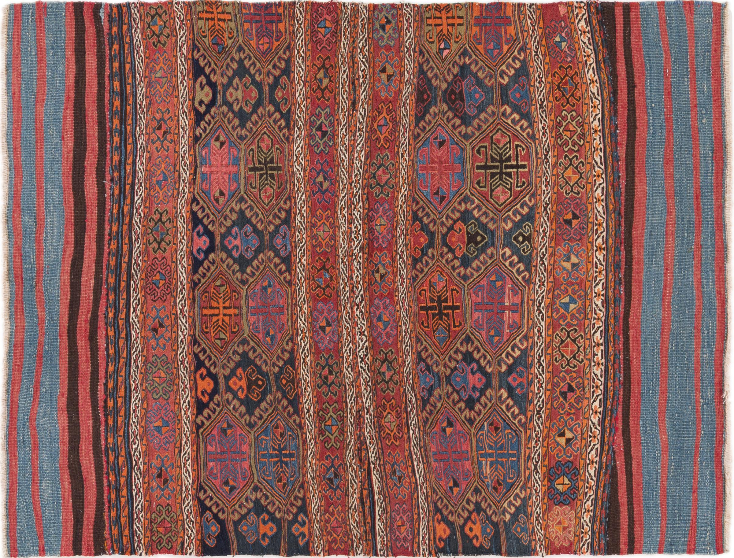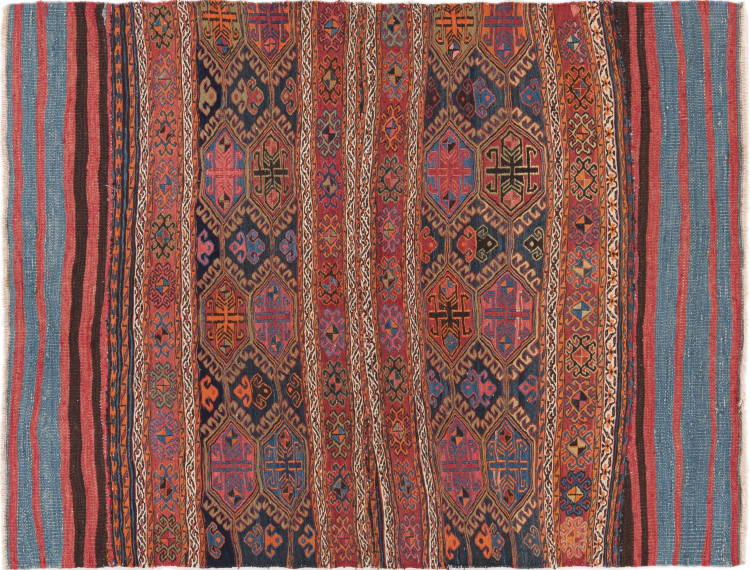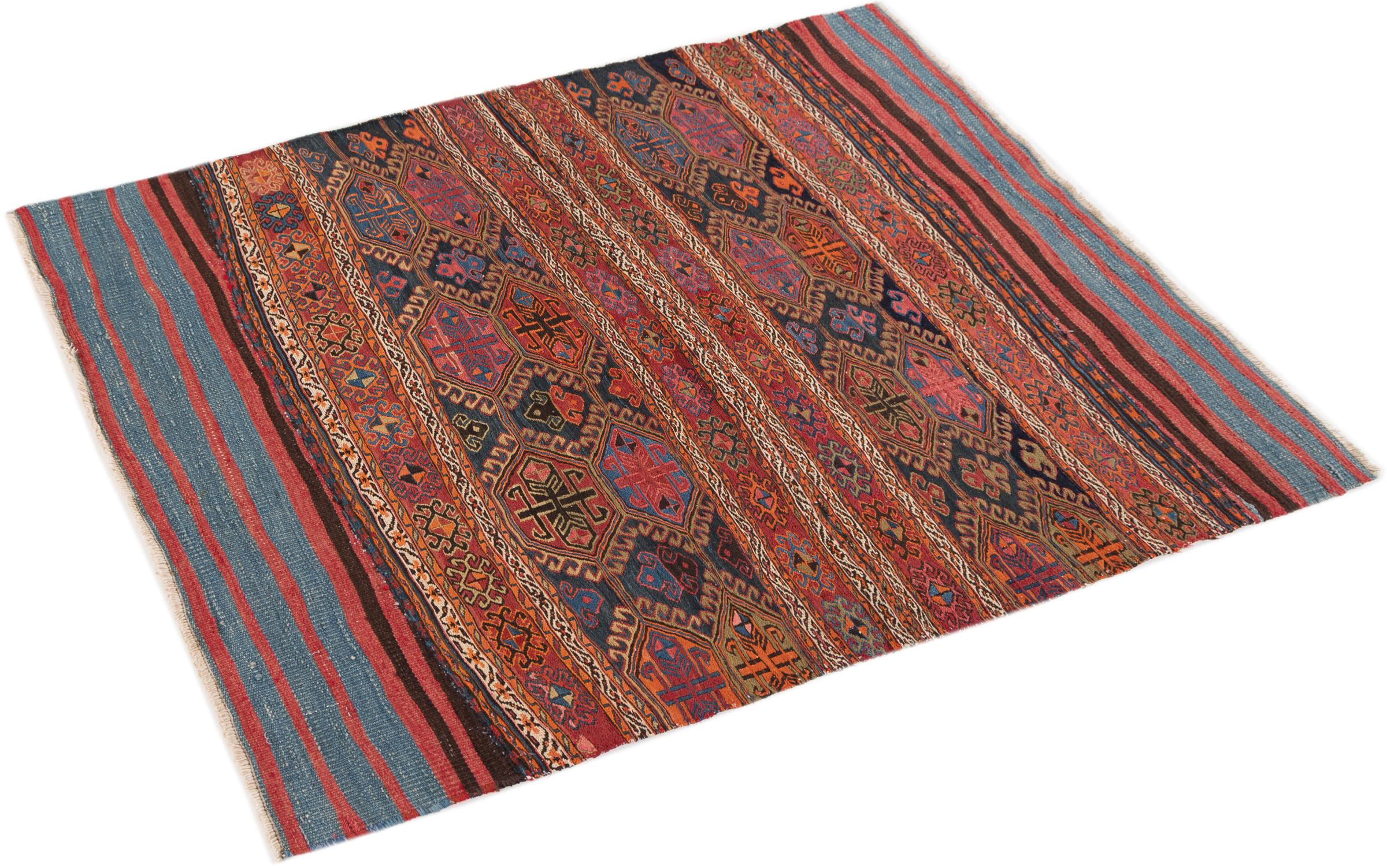 Esta alfombra fue hecha a mano en un telar como un tejido plano. Tejido plano es el término utilizado para describir las alfombras que no tienen pelo. Como el nombre promete, estas alfombras están tejidas y no anudadas. Esto resulta en una alfombra plana con una superficie estructurada. Los tejidos planos no son tan suaves y normalmente más delgados que las alfombras anudadas. Al mismo tiempo, su fabricación es mucho menos compleja y por lo general se pueden disponer por ambos lados (frontal y posterior). Sus patrones suelen ser geométricos, lo cual está determinado por el tejido.