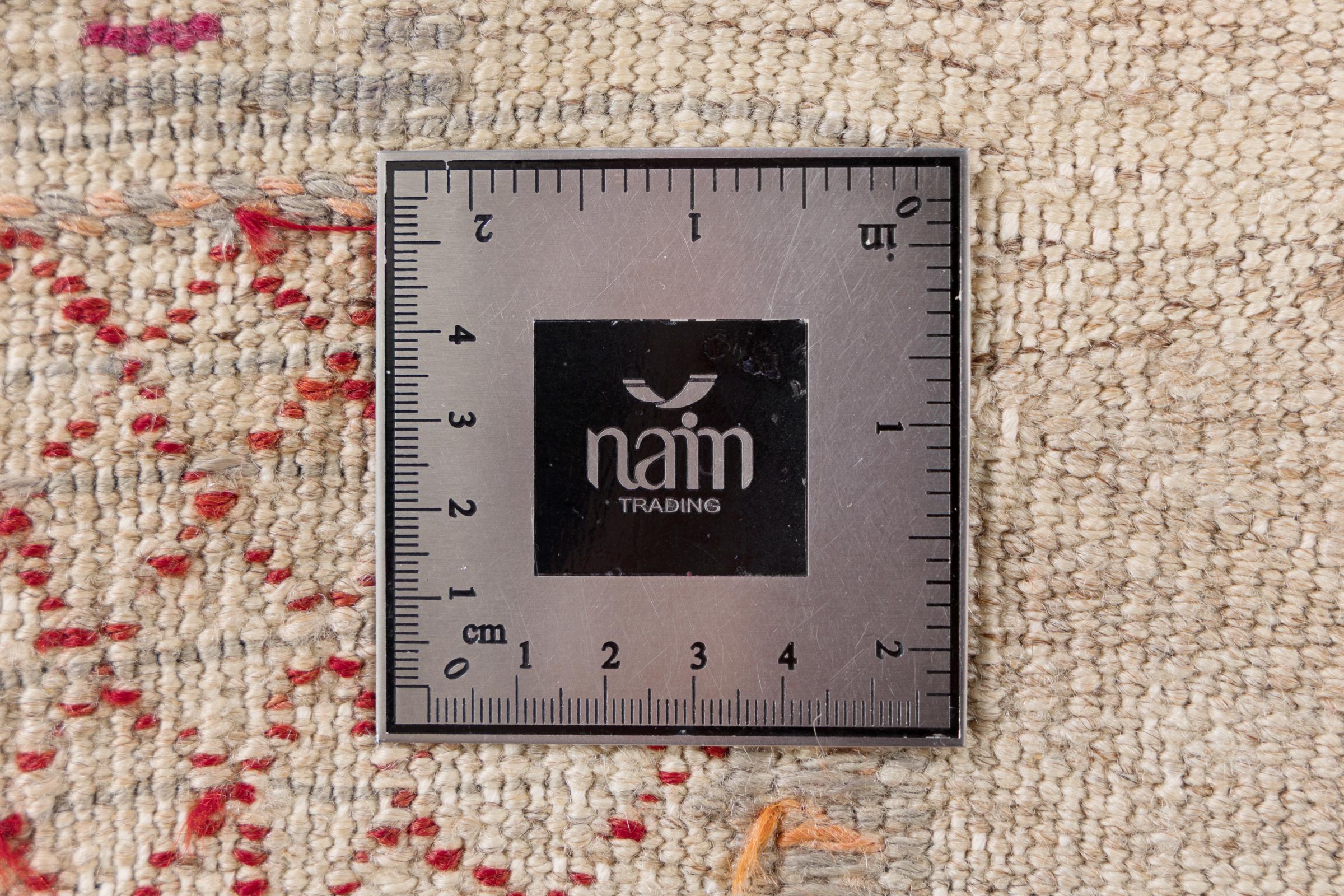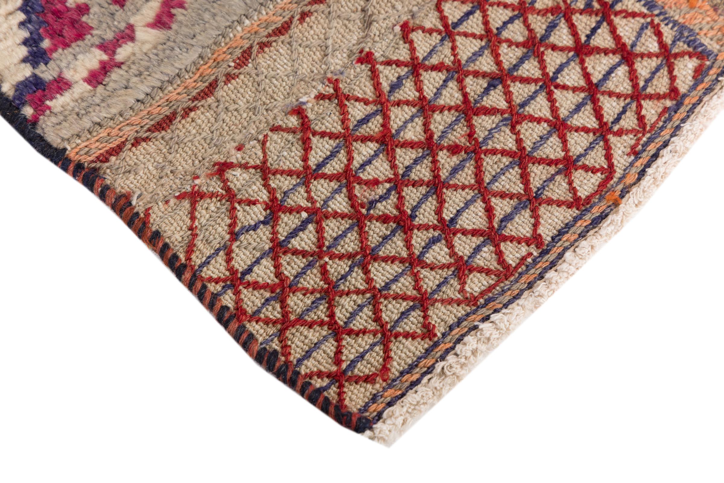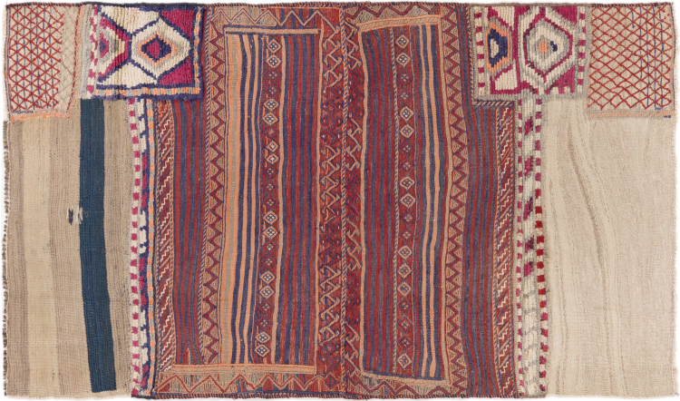Esta alfombra fue hecha a mano en un telar como un tejido plano. Tejido plano es el término utilizado para describir las alfombras que no tienen pelo. Como el nombre promete, estas alfombras están tejidas y no anudadas. Esto resulta en una alfombra plana con una superficie estructurada. Los tejidos planos no son tan suaves y normalmente más delgados que las alfombras anudadas. Al mismo tiempo, su fabricación es mucho menos compleja y por lo general se pueden disponer por ambos lados (frontal y posterior). Sus patrones suelen ser geométricos, lo cual está determinado por el tejido.
