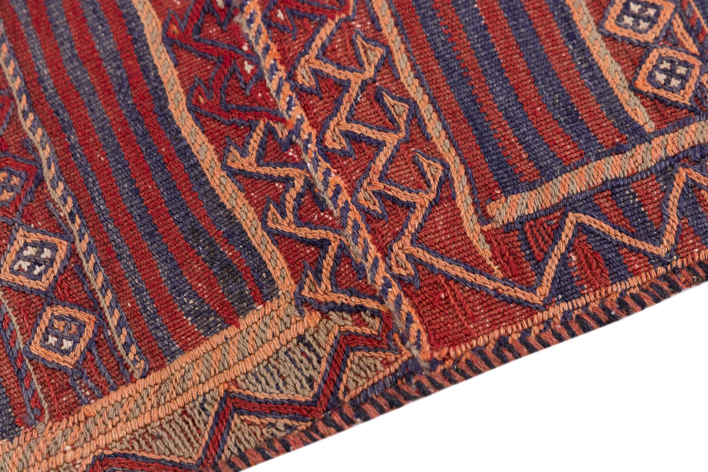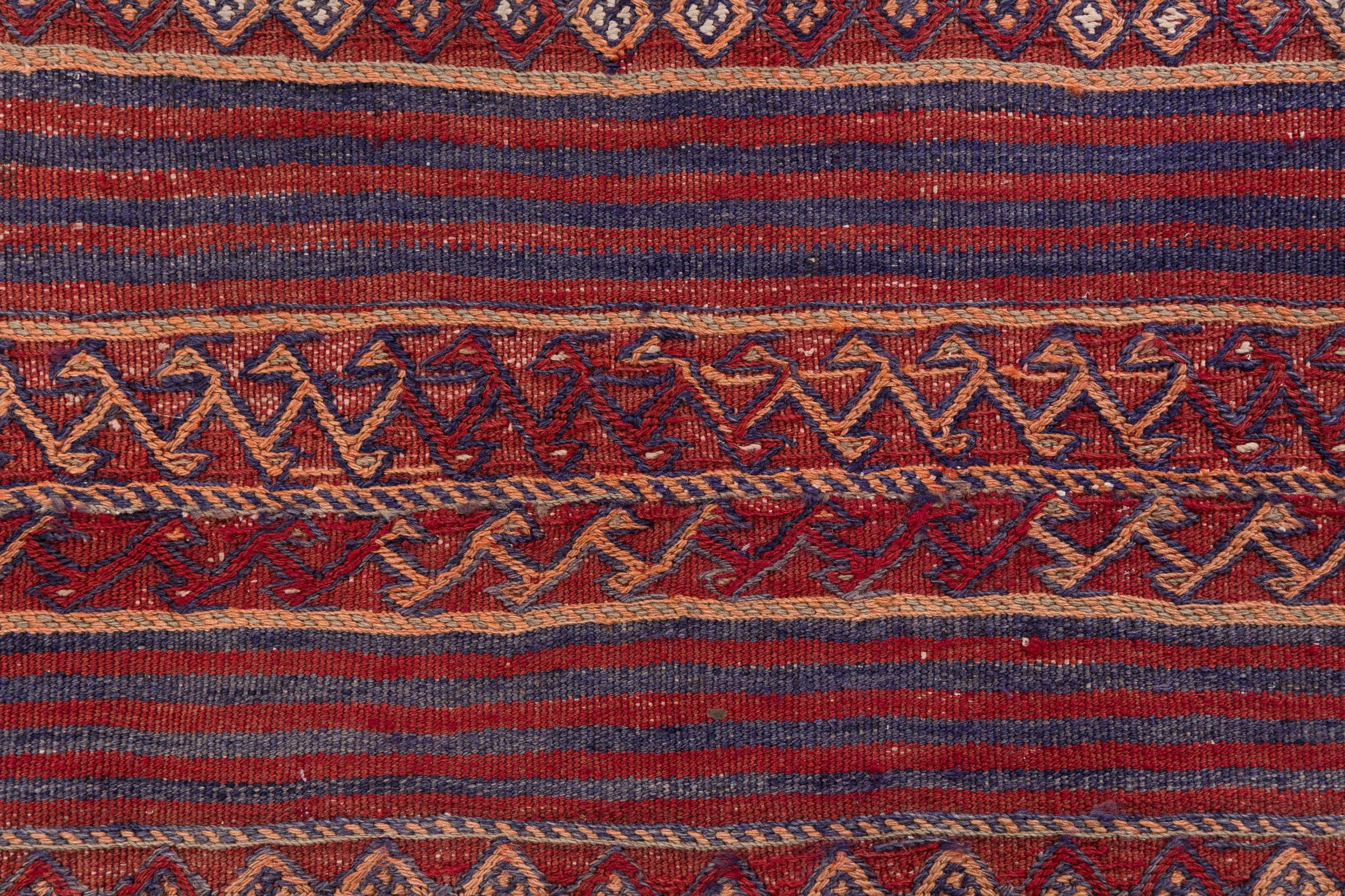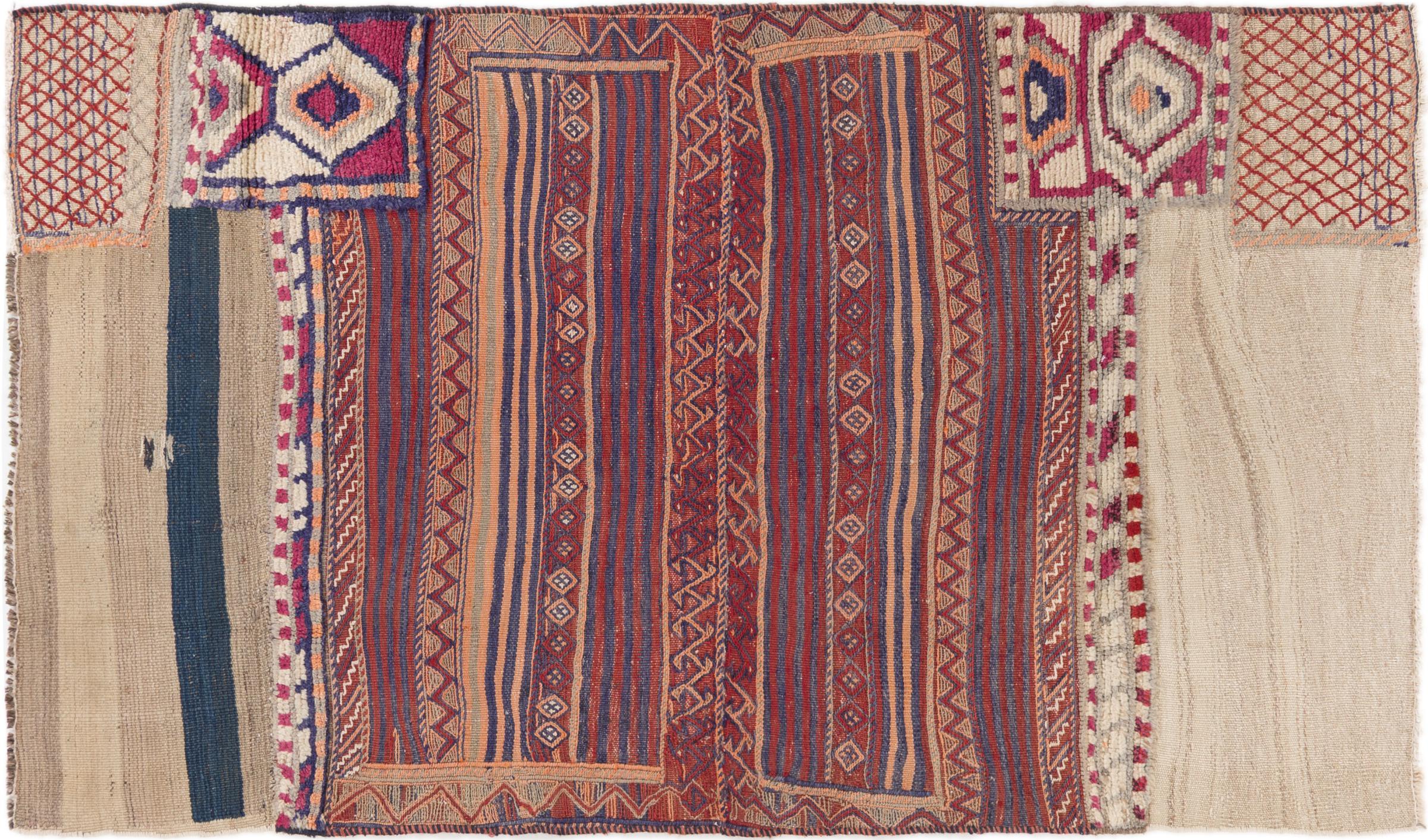 Esta alfombra fue hecha a mano en un telar como un tejido plano. Tejido plano es el término utilizado para describir las alfombras que no tienen pelo. Como el nombre promete, estas alfombras están tejidas y no anudadas. Esto resulta en una alfombra plana con una superficie estructurada. Los tejidos planos no son tan suaves y normalmente más delgados que las alfombras anudadas. Al mismo tiempo, su fabricación es mucho menos compleja y por lo general se pueden disponer por ambos lados (frontal y posterior). Sus patrones suelen ser geométricos, lo cual está determinado por el tejido.
