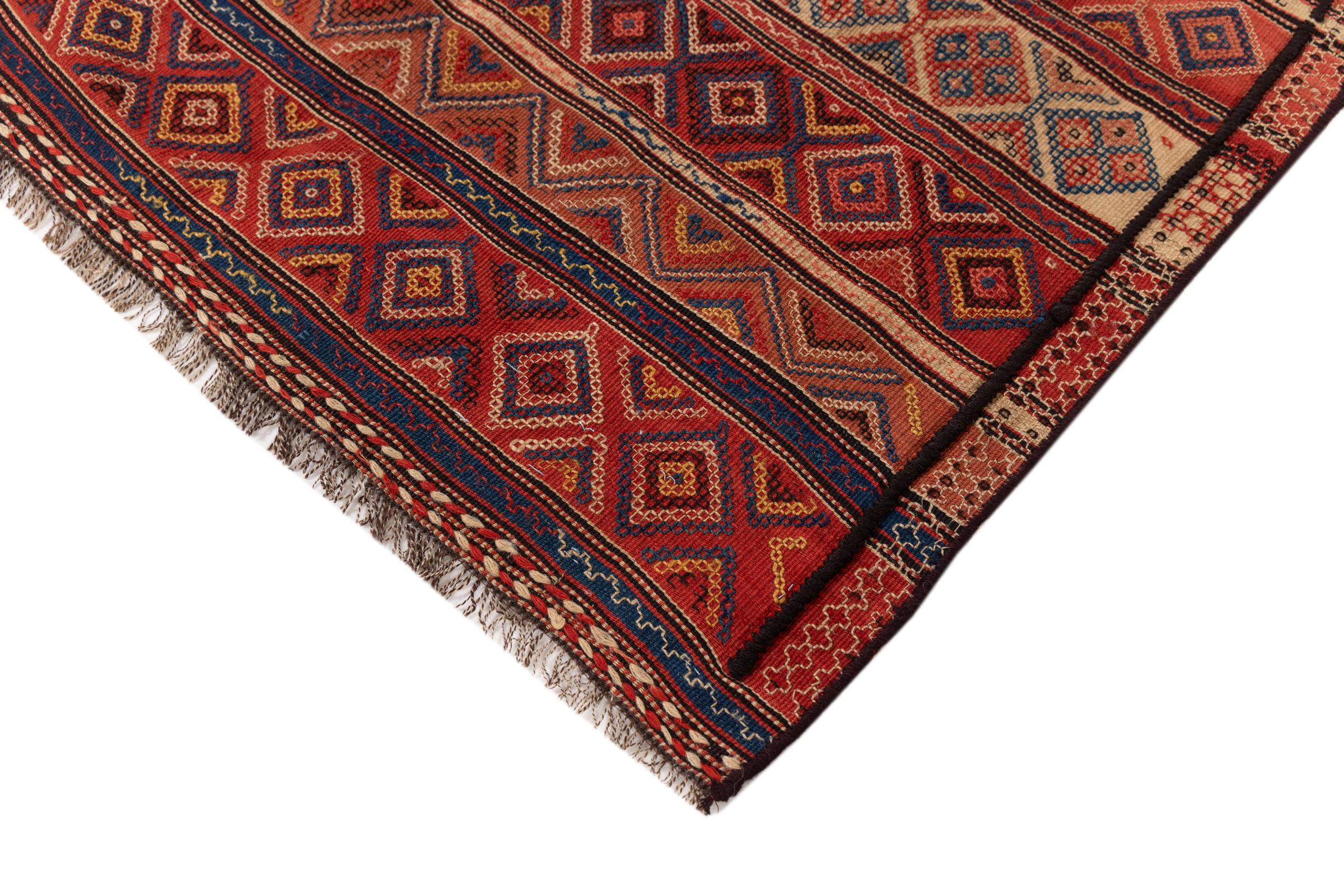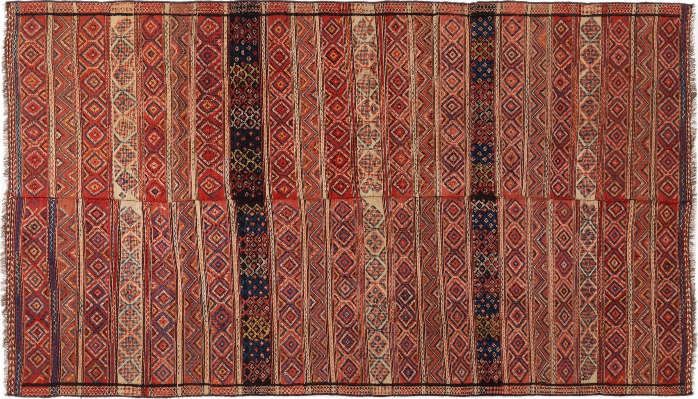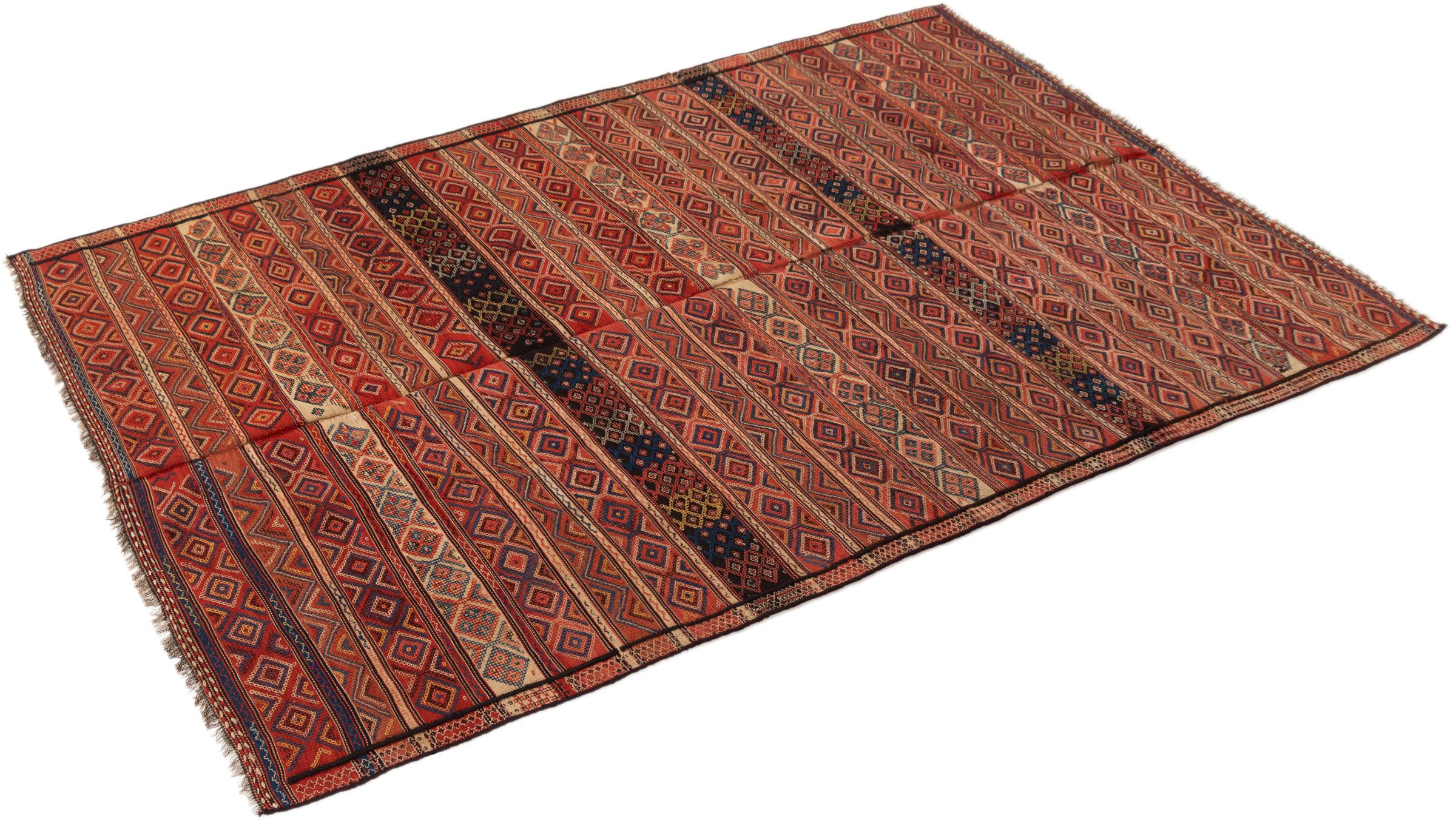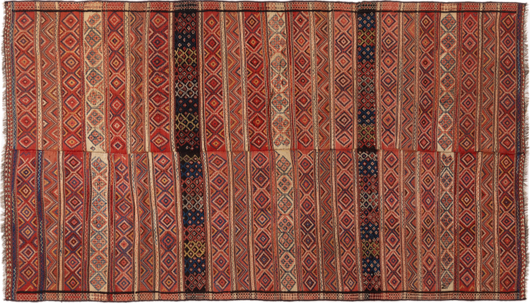 Estas alfombras kilim muestran una diferencia decisiva con las alfombras anudadas a mano - son tejidas a mano. Por lo tanto, no tienen un montón alto de lana y son a menudo más planos y más ásperos que las alfombras de lana anudada. Su fabricación es menos elaborada y por eso suelen ser mucho más baratas. Como ventaja, las alfombras de kilim son también mucho más ligeras y pueden ser colocadas por delante y por detrás. Los kilims tejidos a mano provienen originalmente de la antigua Persia y ahora también se fabrican a menudo en el Afganistán. Tienen patrones bastante simples y directos, que se deben a su técnica de tejido.