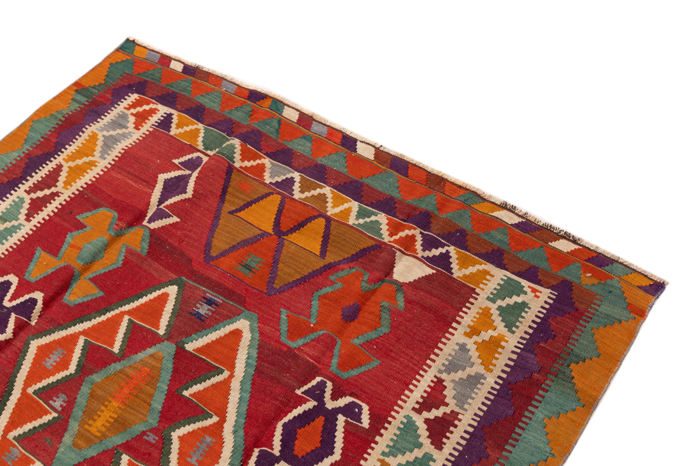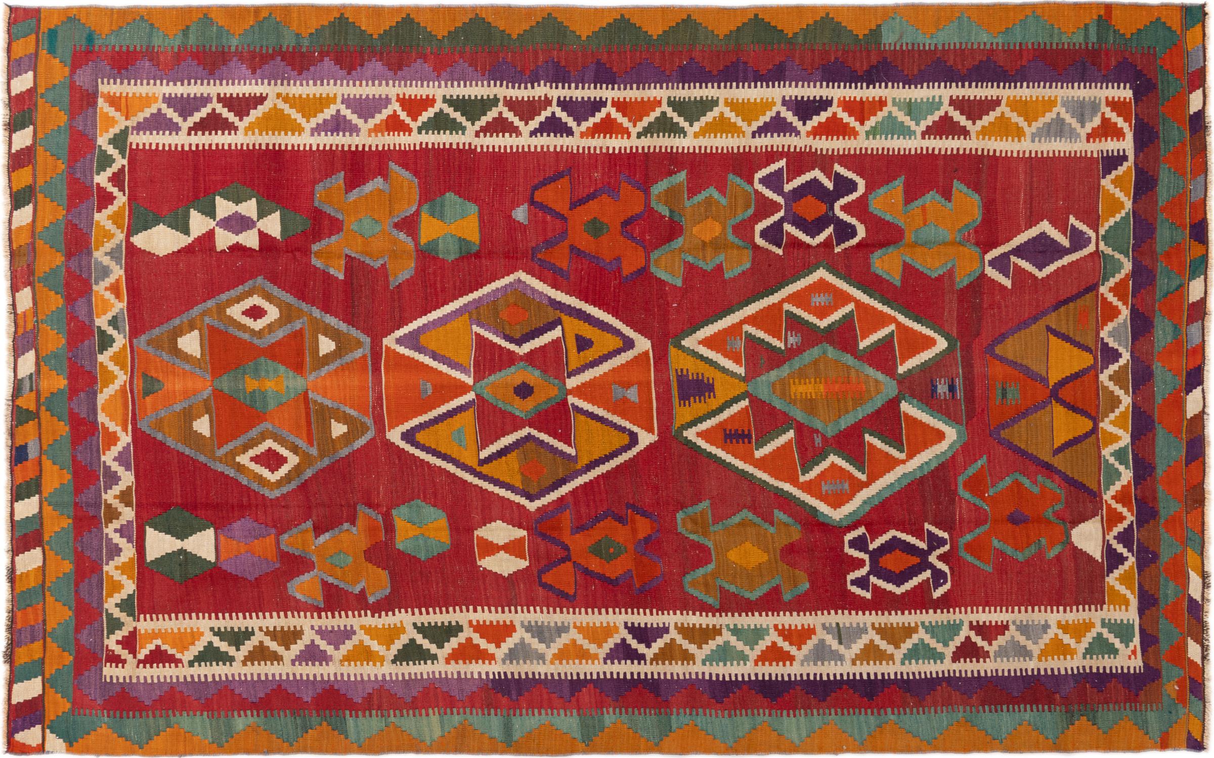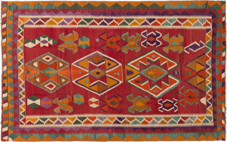 Esta alfombra fue hecha a mano en un telar como un tejido plano. Tejido plano es el término utilizado para describir las alfombras que no tienen pelo. Como el nombre promete, estas alfombras están tejidas y no anudadas. Esto resulta en una alfombra plana con una superficie estructurada. Los tejidos planos no son tan suaves y normalmente más delgados que las alfombras anudadas. Al mismo tiempo, su fabricación es mucho menos compleja y por lo general se pueden disponer por ambos lados (frontal y posterior). Sus patrones suelen ser geométricos, lo cual está determinado por el tejido.