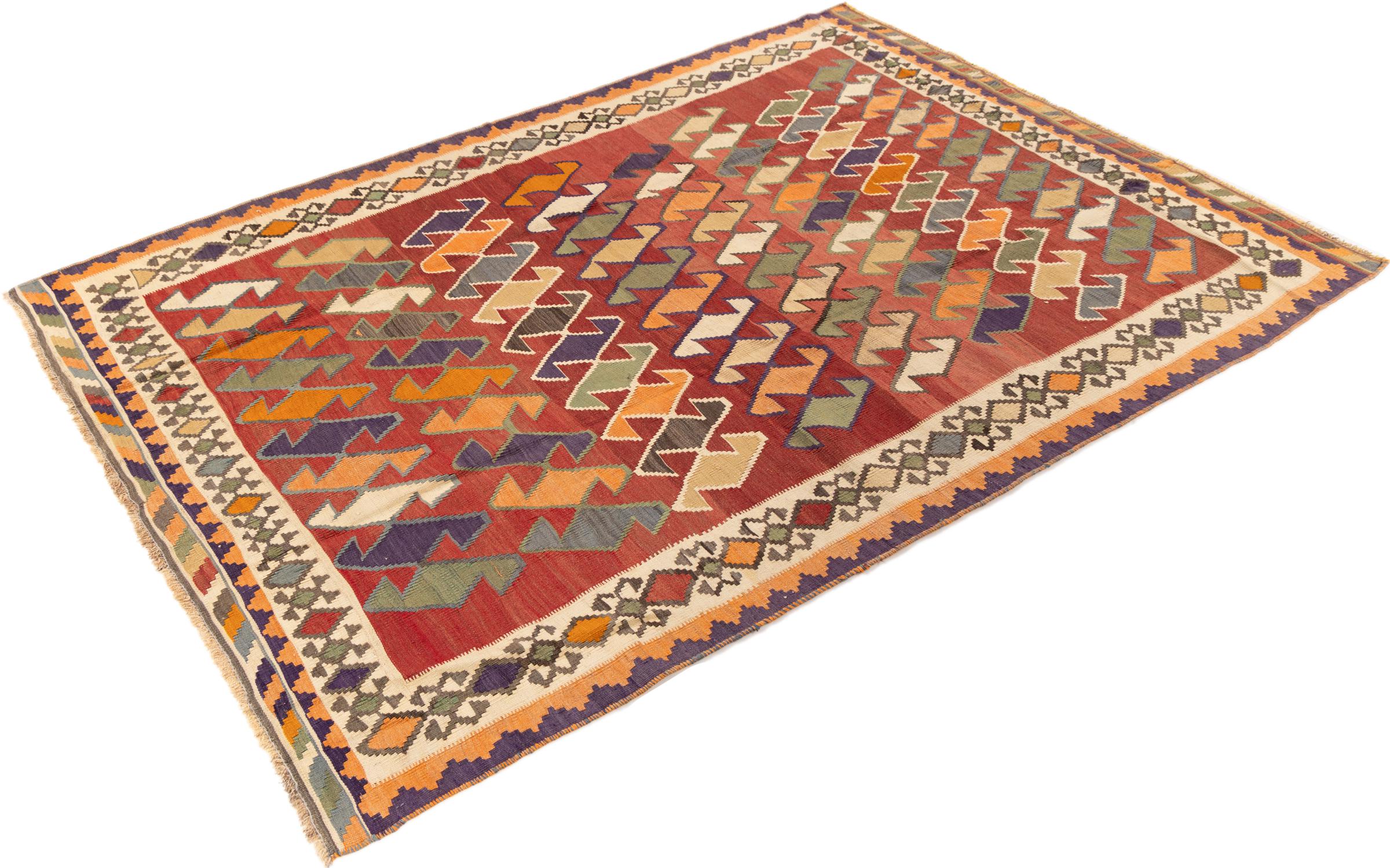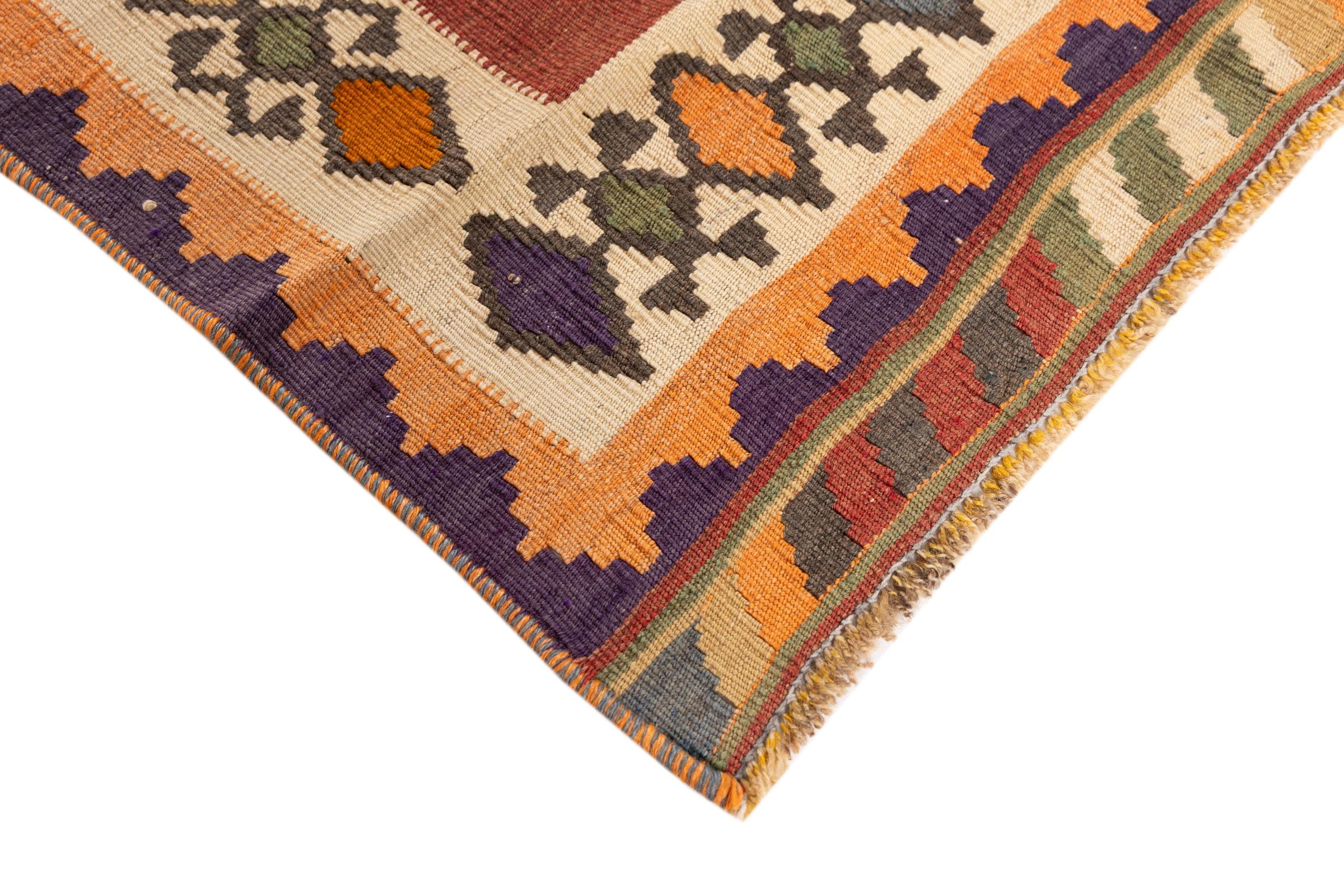 Estas alfombras kilim muestran una diferencia decisiva con las alfombras anudadas a mano - son tejidas a mano. Por lo tanto, no tienen un montón alto de lana y son a menudo más planos y más ásperos que las alfombras de lana anudada. Su fabricación es menos elaborada y por eso suelen ser mucho más baratas. Como ventaja, las alfombras de kilim son también mucho más ligeras y pueden ser colocadas por delante y por detrás. Los kilims tejidos a mano provienen originalmente de la antigua Persia y ahora también se fabrican a menudo en el Afganistán. Tienen patrones bastante simples y directos, que se deben a su técnica de tejido.