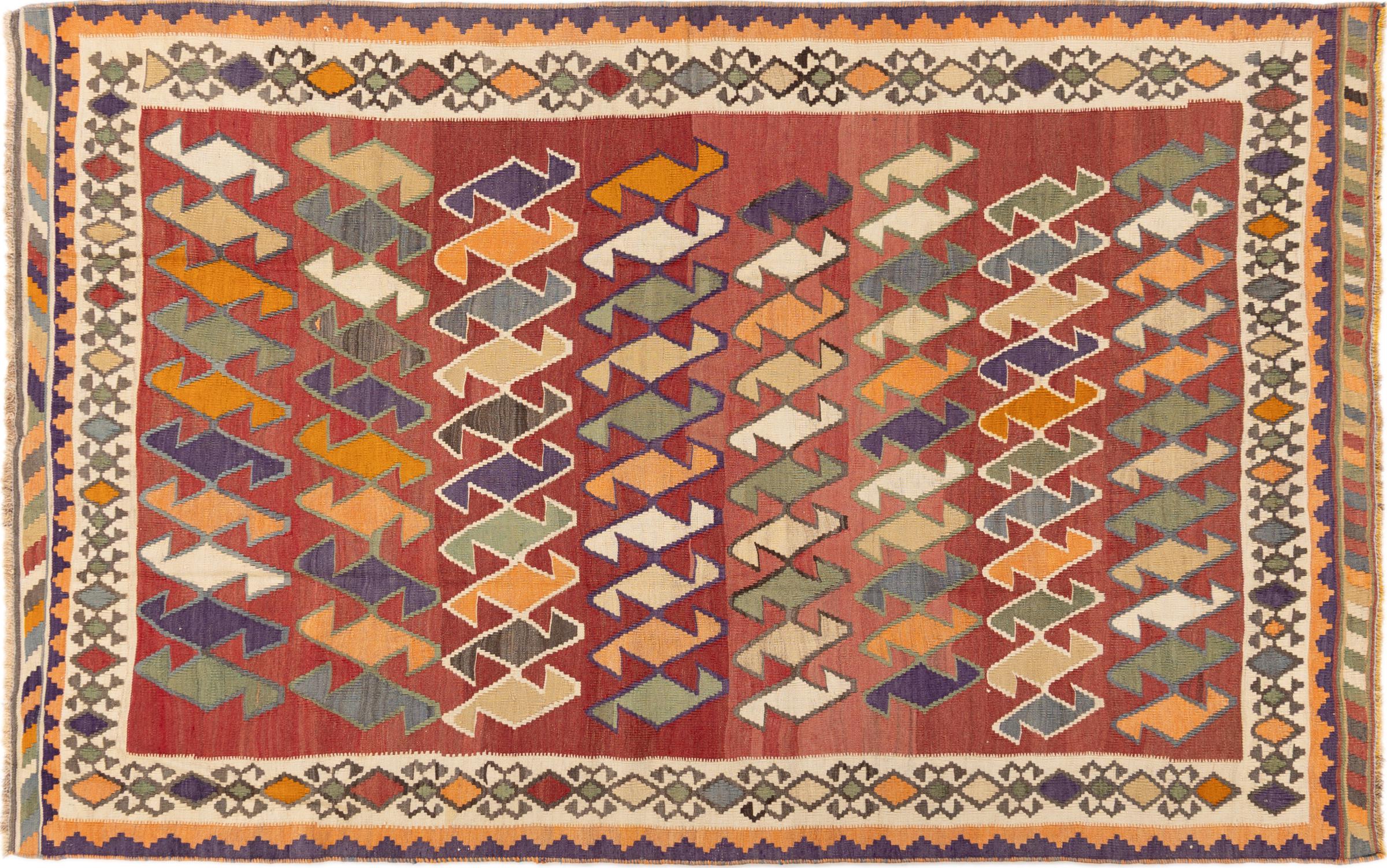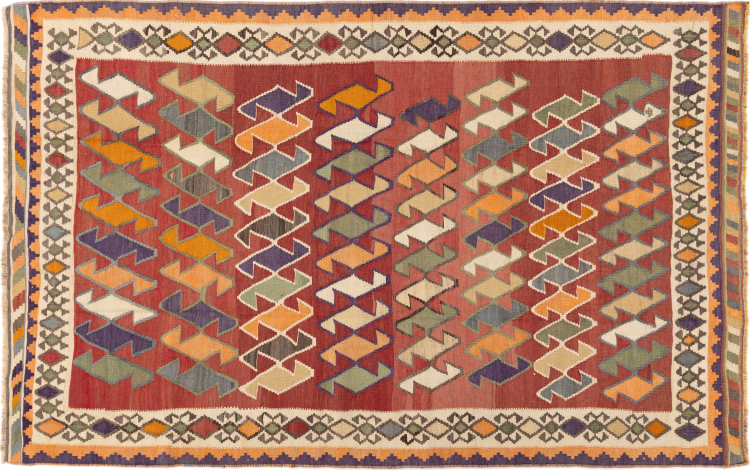 Esta alfombra fue hecha a mano en un telar como un tejido plano. Tejido plano es el término utilizado para describir las alfombras que no tienen pelo. Como el nombre promete, estas alfombras están tejidas y no anudadas. Esto resulta en una alfombra plana con una superficie estructurada. Los tejidos planos no son tan suaves y normalmente más delgados que las alfombras anudadas. Al mismo tiempo, su fabricación es mucho menos compleja y por lo general se pueden disponer por ambos lados (frontal y posterior). Sus patrones suelen ser geométricos, lo cual está determinado por el tejido.