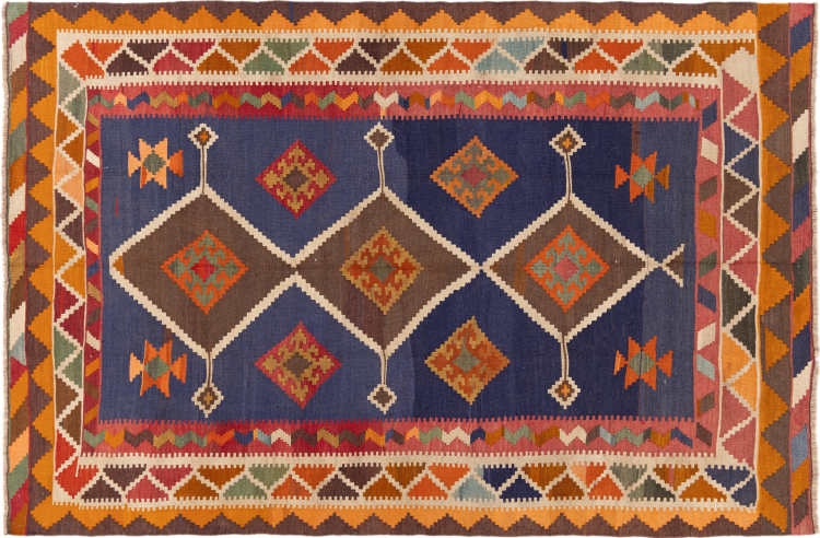Esta alfombra fue hecha a mano en un telar como un tejido plano. Tejido plano es el término utilizado para describir las alfombras que no tienen pelo. Como el nombre promete, estas alfombras están tejidas y no anudadas. Esto resulta en una alfombra plana con una superficie estructurada. Los tejidos planos no son tan suaves y normalmente más delgados que las alfombras anudadas. Al mismo tiempo, su fabricación es mucho menos compleja y por lo general se pueden disponer por ambos lados (frontal y posterior). Sus patrones suelen ser geométricos, lo cual está determinado por el tejido.