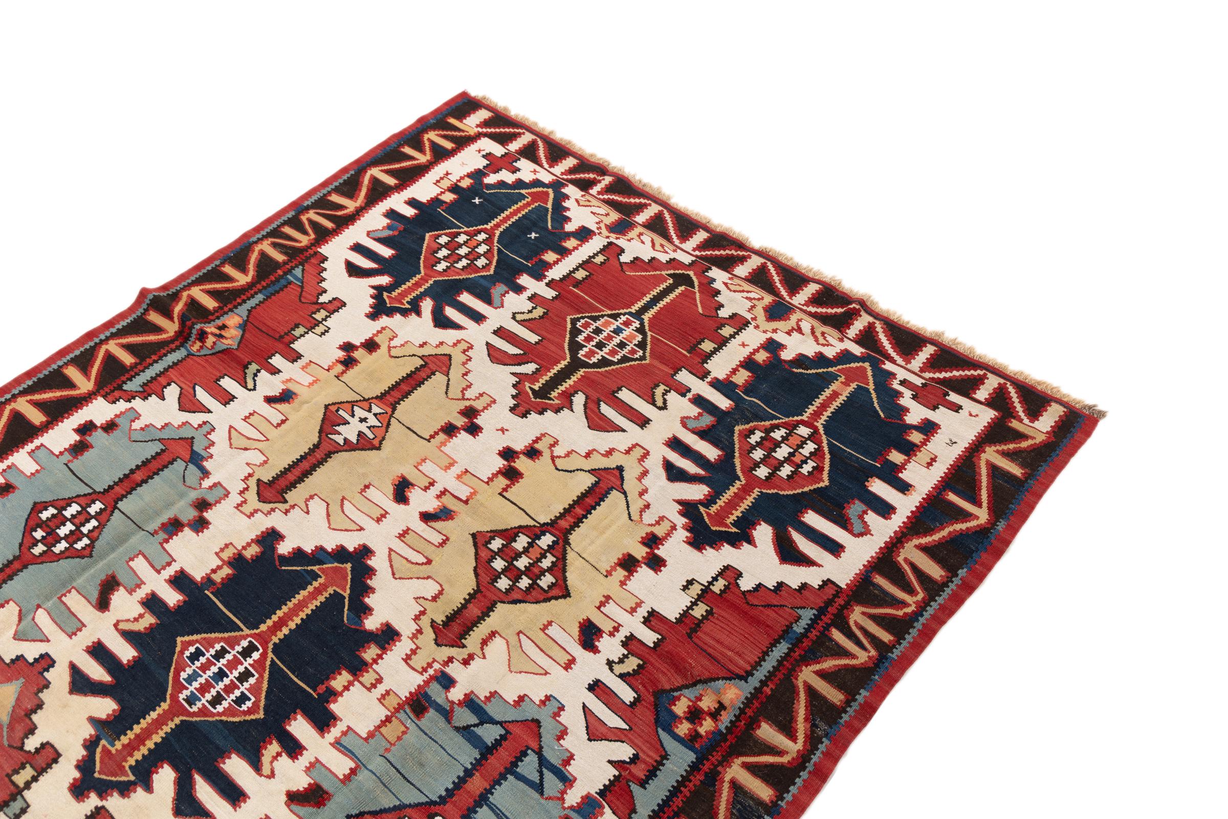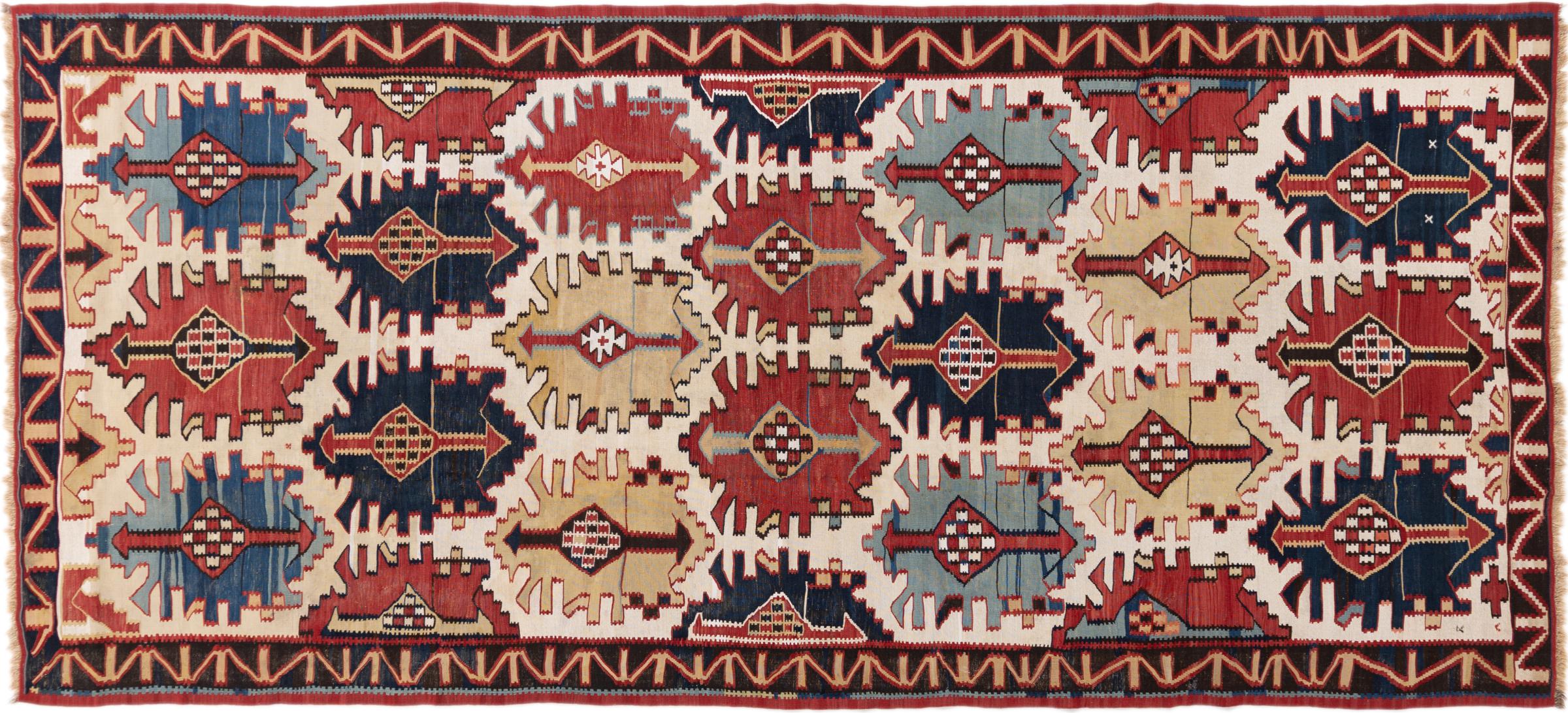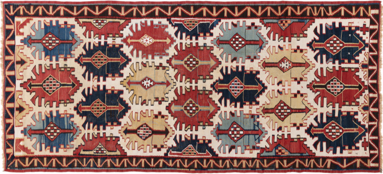 Esta alfombra fue hecha a mano en un telar como un tejido plano. Tejido plano es el término utilizado para describir las alfombras que no tienen pelo. Como el nombre promete, estas alfombras están tejidas y no anudadas. Esto resulta en una alfombra plana con una superficie estructurada. Los tejidos planos no son tan suaves y normalmente más delgados que las alfombras anudadas. Al mismo tiempo, su fabricación es mucho menos compleja y por lo general se pueden disponer por ambos lados (frontal y posterior). Sus patrones suelen ser geométricos, lo cual está determinado por el tejido.