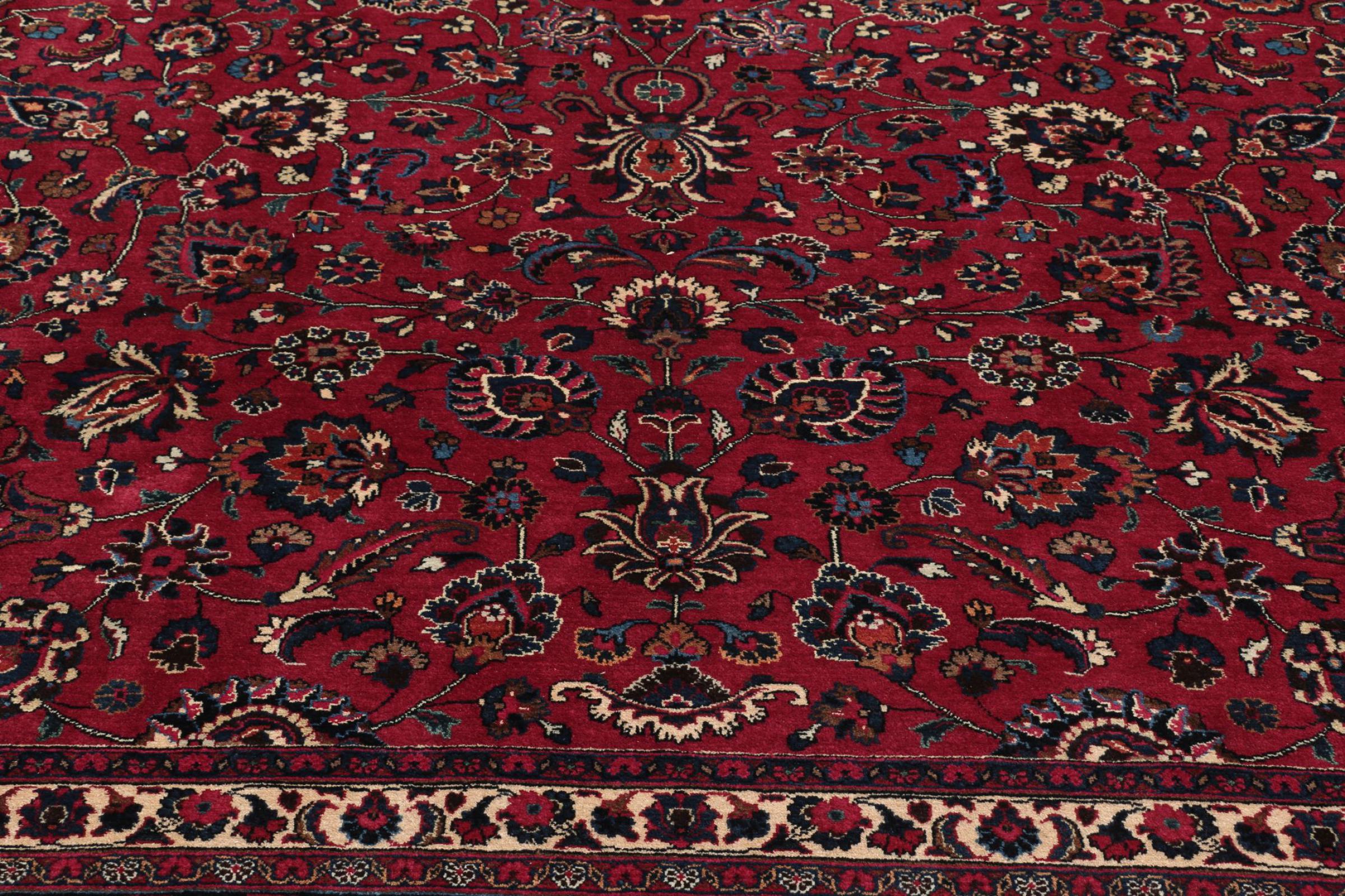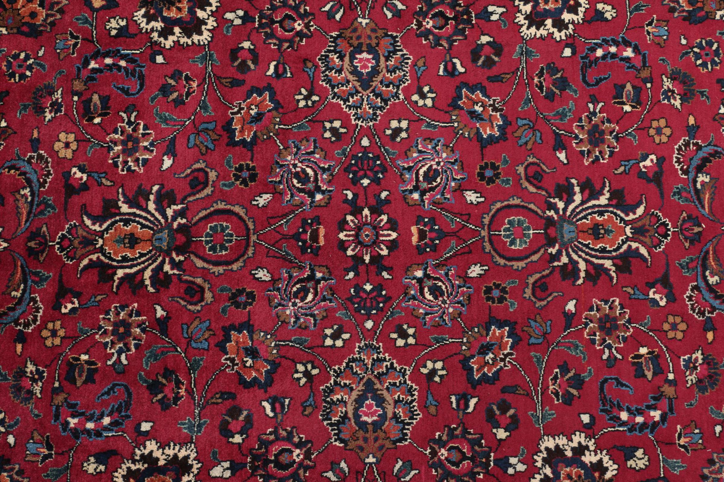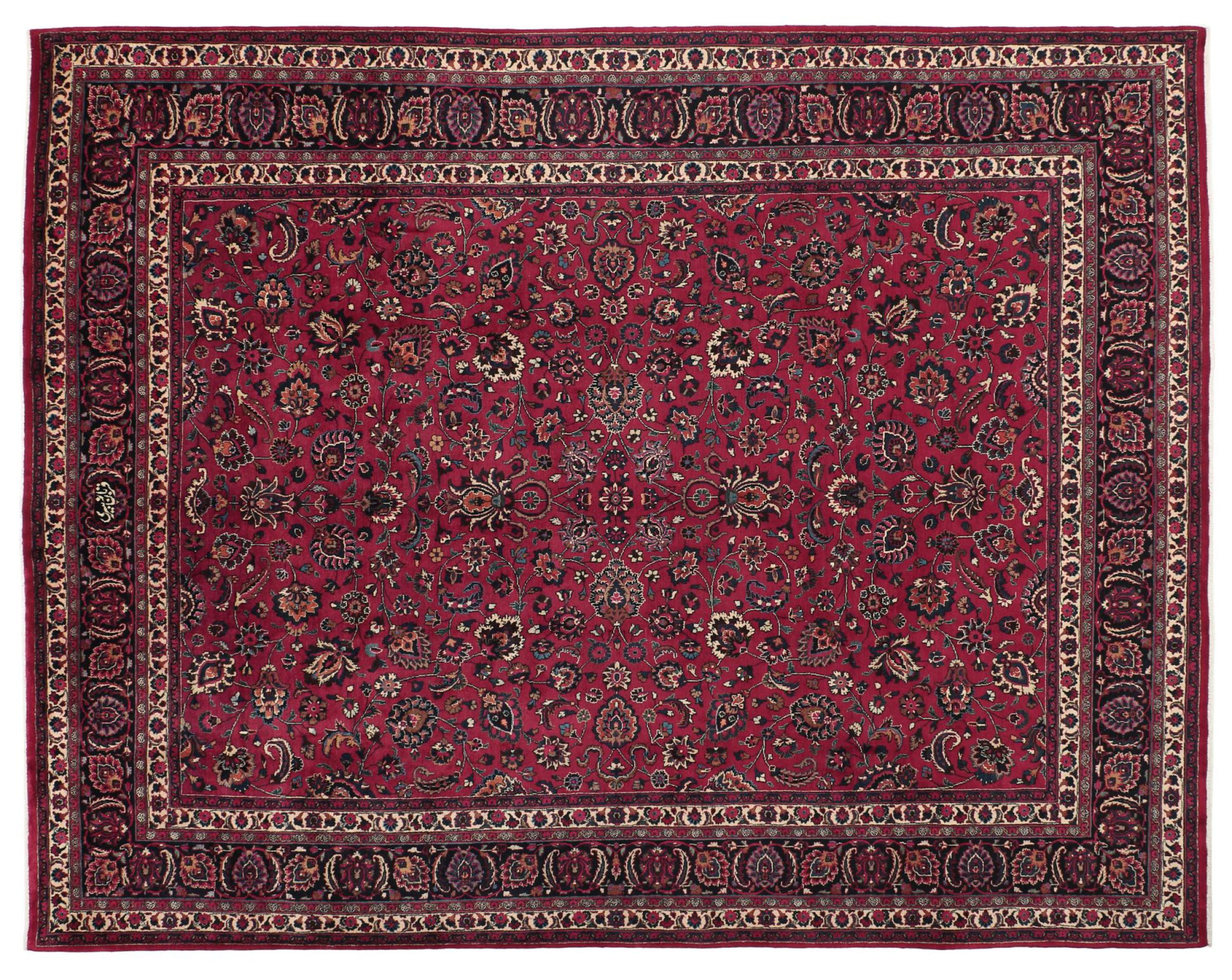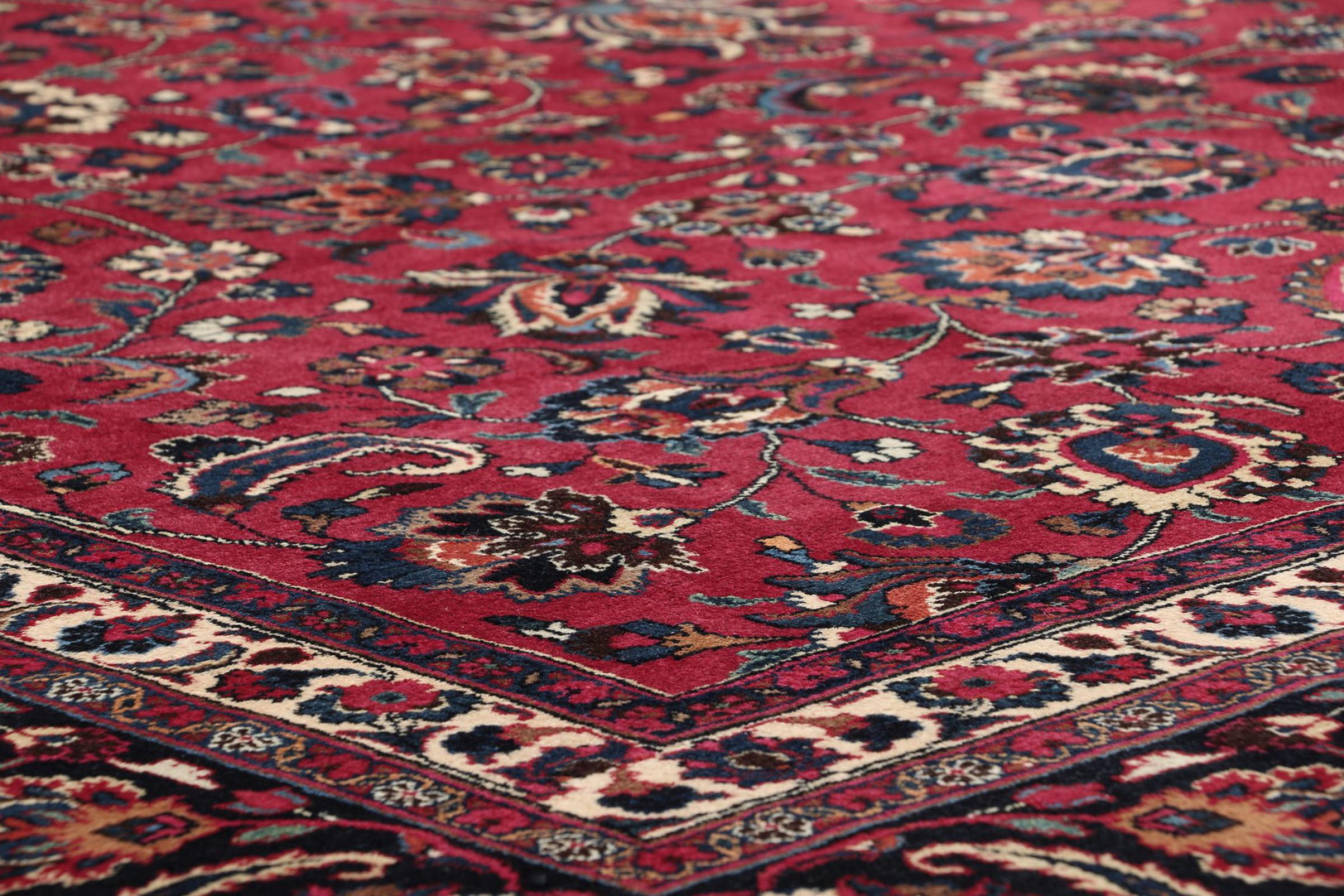 Esta alfombra de Mashhad, una de las mayores ciudades de Irán, se anudó a mano con pura lana natural. Millones de personas peregrinan cada año a esta ciudad sagrada persa. Las alfombras de Mashhad son conocidas por sus tamaños inusuales y por su lana de altísima calidad.