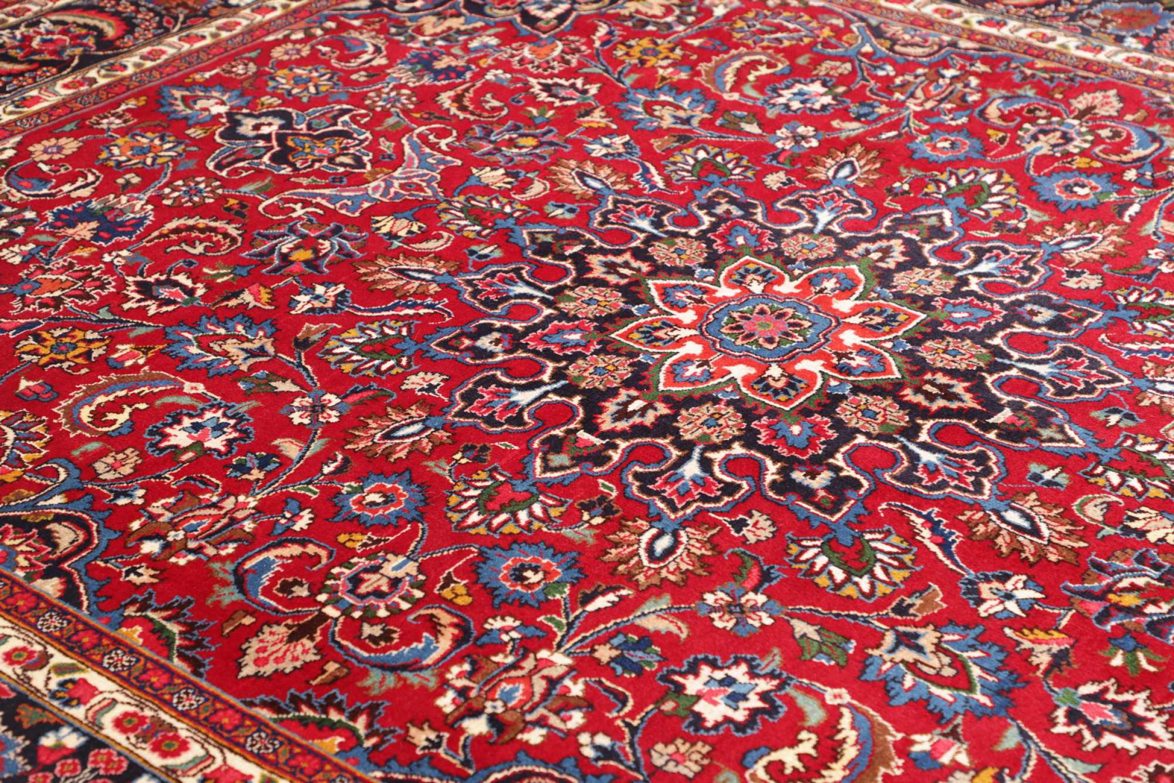 Esta alfombra de Mashhad, una de las mayores ciudades de Irán, se anudó a mano con pura lana natural. Millones de personas peregrinan cada año a esta ciudad sagrada persa. Las alfombras de Mashhad son conocidas por sus tamaños inusuales y por su lana de altísima calidad.