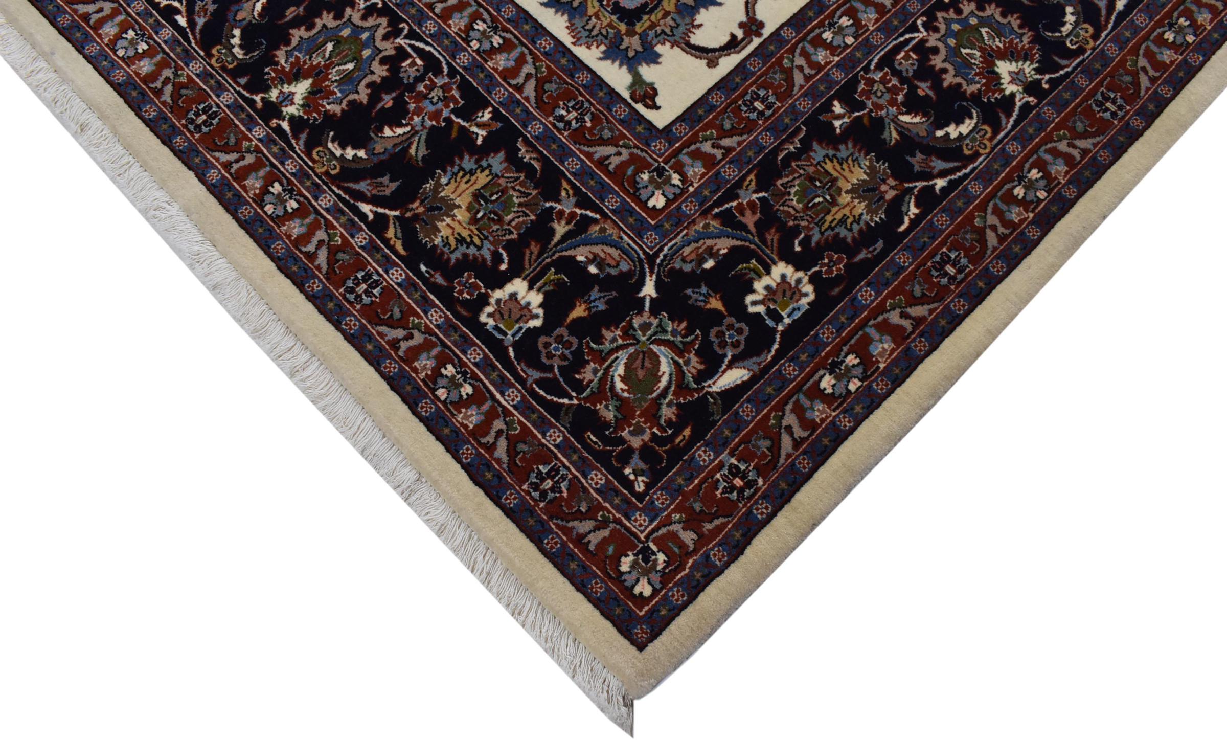 Esta alfombra de Mashhad, una de las mayores ciudades de Irán, se anudó a mano con pura lana natural. Millones de personas peregrinan cada año a esta ciudad sagrada persa. Las alfombras de Mashhad son conocidas por sus tamaños inusuales y por su lana de altísima calidad.
