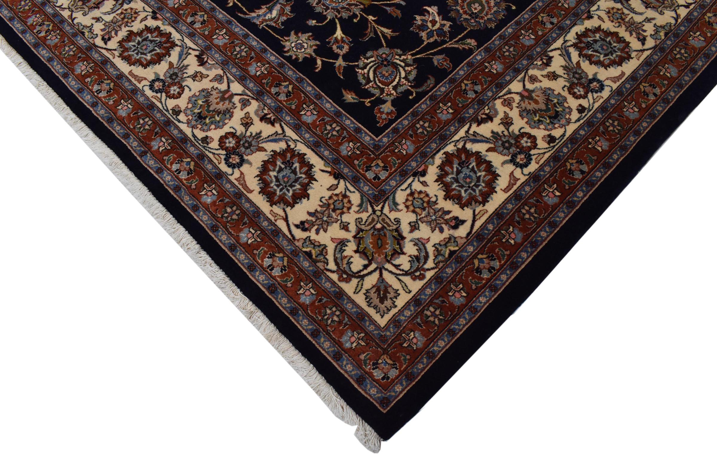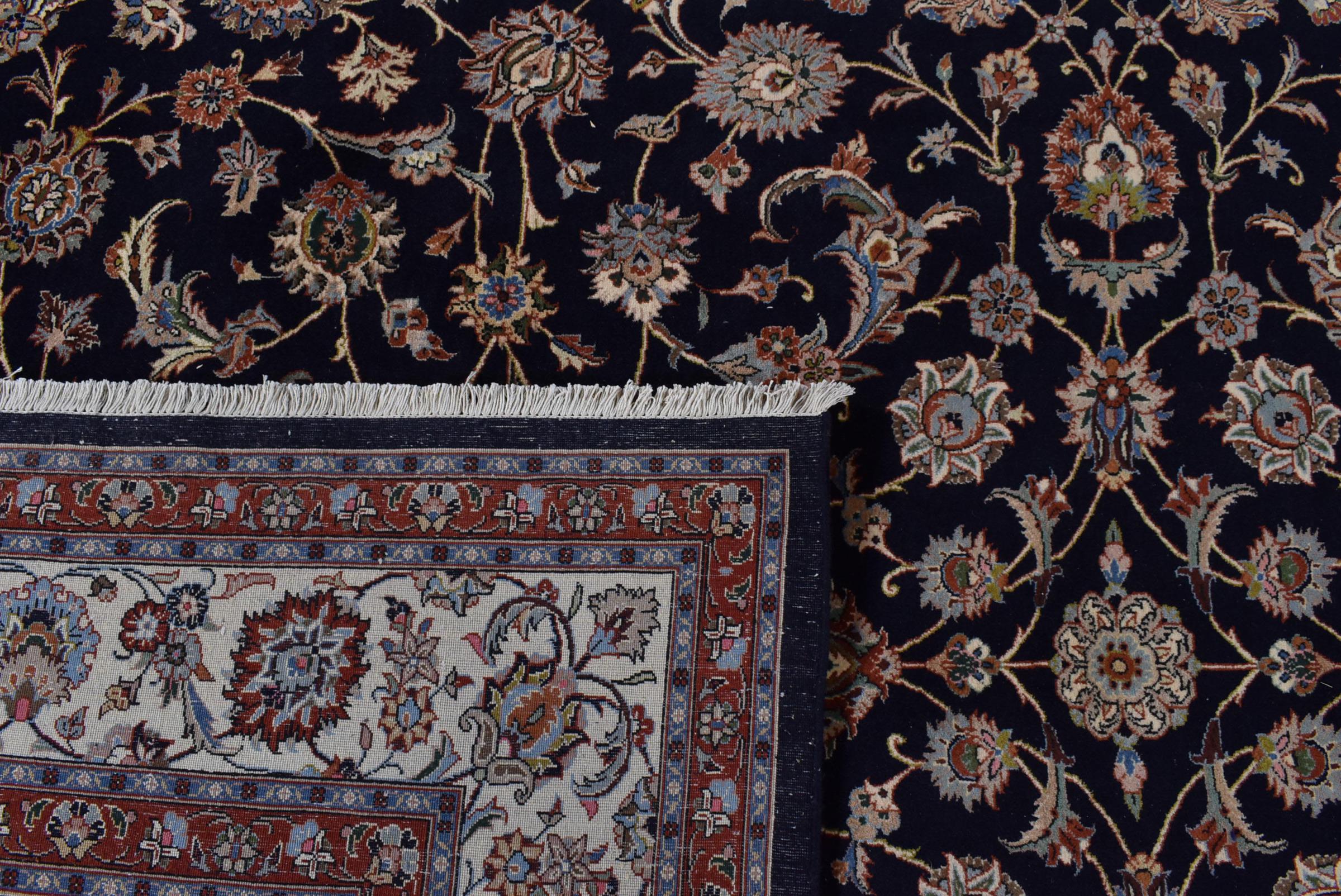 Esta alfombra de Mashhad, una de las mayores ciudades de Irán, se anudó a mano con pura lana natural. Millones de personas peregrinan cada año a esta ciudad sagrada persa. Las alfombras de Mashhad son conocidas por sus tamaños inusuales y por su lana de altísima calidad.