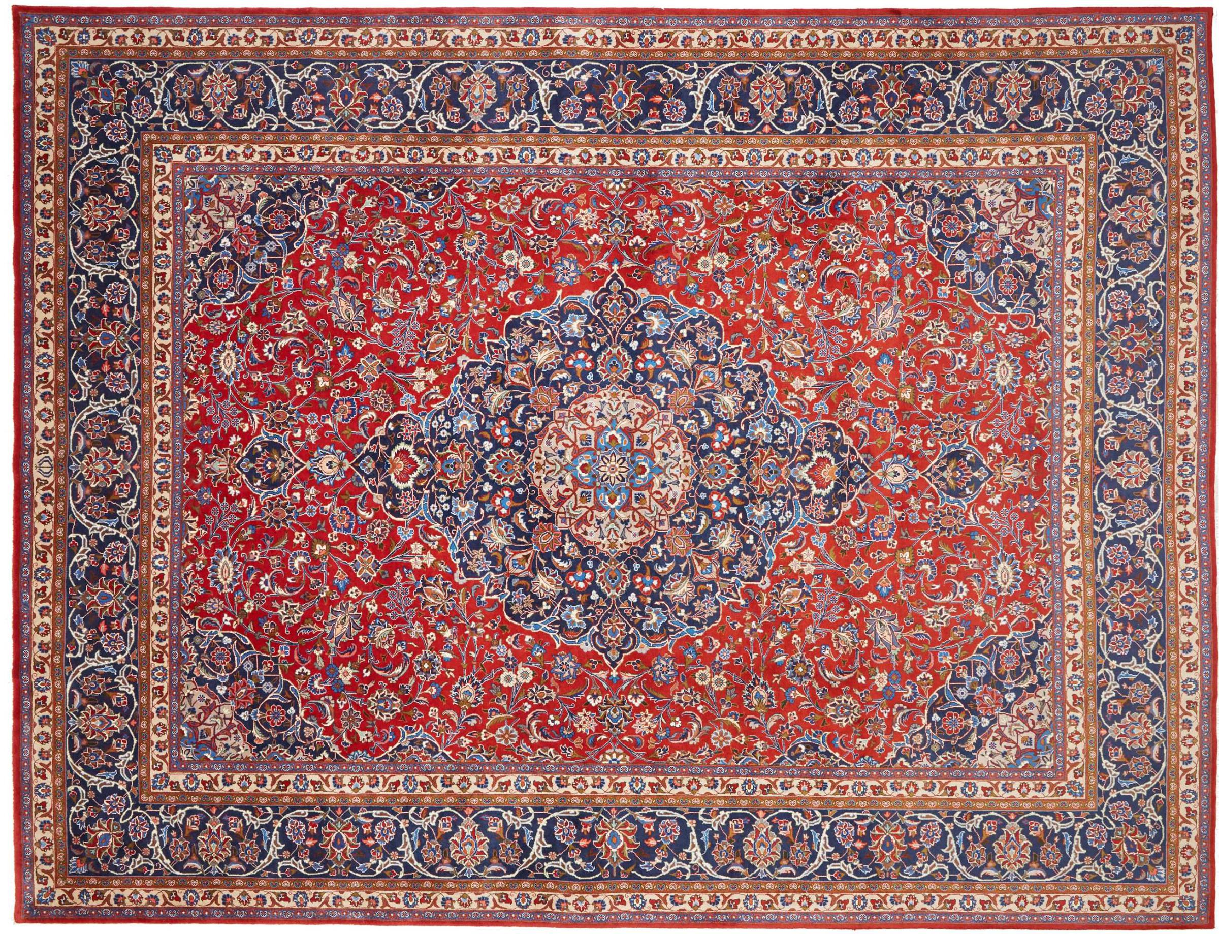 Esta alfombra de Mashhad, una de las mayores ciudades de Irán, se anudó a mano con pura lana natural. Millones de personas peregrinan cada año a esta ciudad sagrada persa. Las alfombras de Mashhad son conocidas por sus tamaños inusuales y por su lana de altísima calidad.